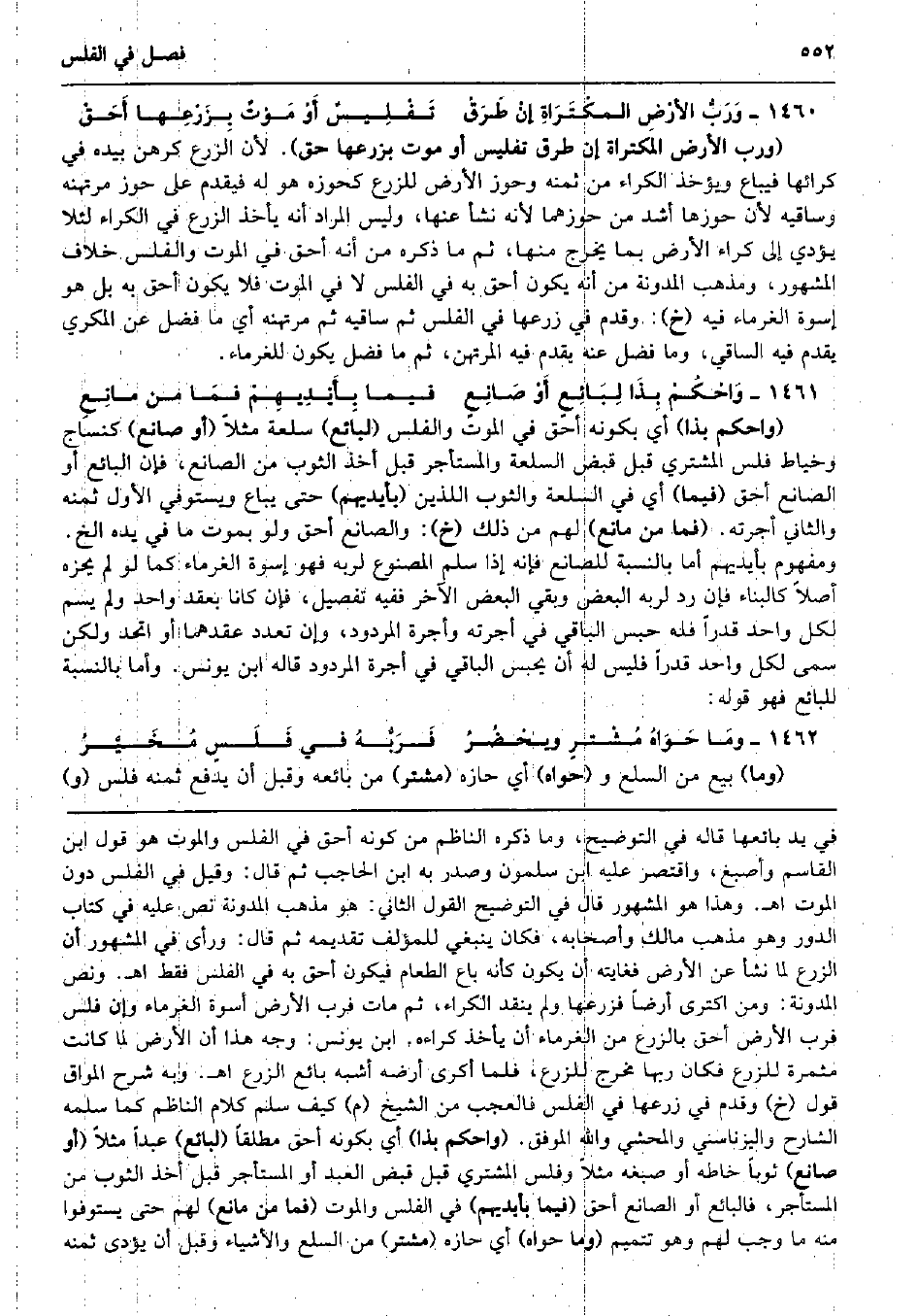 وَرَبُّ الأرْضِ المكْتَرَاةِ إنْ طَرَقْ تَفْلِيسٌ أَوْ مَوْتٌ بِزَرْعِها أَحَقْ (وَرب الأَرْض المكتراة إِن طرق تفليس أَو موت بزرعها حق) . لِأَن الزَّرْع كرهن بِيَدِهِ فِي كرائها فَيُبَاع وَيُؤْخَذ الْكِرَاء من ثمنه وحوز الأَرْض للزَّرْع كحوزه هُوَ لَهُ فَيقدم على حوز مرتهنه وساقيه لِأَن حوزها أَشد من حوزهما لِأَنَّهُ نَشأ عَنْهَا، وَلَيْسَ المُرَاد أَنه يَأْخُذ الزَّرْع فِي الْكِرَاء لِئَلَّا يُؤَدِّي إِلَى كِرَاء الأَرْض بِمَا يخرج مِنْهَا، ثمَّ مَا ذكره من أَنه أَحَق فِي الْمَوْت والفلس خلاف الْمَشْهُور، وَمذهب الْمُدَوَّنَة من أَنه يكون أَحَق بِهِ فِي الْفلس لَا فِي الْمَوْت فَلَا يكون أَحَق بِهِ بل هُوَ إسوة الْغُرَمَاء فِيهِ (خَ) : وَقدم فِي زَرعهَا فِي الْفلس ثمَّ سَاقيه ثمَّ مرتهنه أَي مَا فضل عَن الْمكْرِي يقدم فِيهِ الساقي، وَمَا فضل عَنهُ يقدم فِيهِ الْمُرْتَهن، ثمَّ مَا فضل يكون للْغُرَمَاء. وَاحْكُمْ بِذَا لِبَائِعٍ أَوْ صَانِعٍ فِيمَا بِأَيْدِيهِمْ فمَا من مانِعِ (واحكم بذا) أَي بِكَوْنِهِ أَحَق فِي الْمَوْت والفلس (لبائع) سلْعَة مثلا (أَو صانع) كنساج وخياط فلس المُشْتَرِي قبل قبض السّلْعَة وَالْمُسْتَأْجر قبل أَخذ الثَّوْب من الصَّانِع، فَإِن البَائِع أَو الصَّانِع أَحَق (فِيمَا) أَي فِي السّلْعَة وَالثَّوْب اللَّذين (بِأَيْدِيهِم) حَتَّى يُبَاع ويستوفي الأول ثمنه وَالثَّانِي أجرته. (فَمَا من مَانع) لَهُم من ذَلِك (خَ) : والصانع أَحَق وَلَو بِمَوْت مَا فِي يَده الخ. وَمَفْهُوم بِأَيْدِيهِم أما بِالنِّسْبَةِ للصانع فَإِنَّهُ إِذا سلم الْمَصْنُوع لرَبه فَهُوَ إسوة الْغُرَمَاء كَمَا لَو لم يحزه أصلا كالبناء فَإِن رد لرَبه الْبَعْض وَبَقِي الْبَعْض الآخر فَفِيهِ تَفْصِيل، فَإِن كَانَا بِعقد وَاحِد وَلم يسم لكل وَاحِد قدرا فَلهُ حبس الْبَاقِي فِي أجرته وَأُجْرَة الْمَرْدُود، وَإِن تعدد عقدهما أَو اتَّحد وَلَكِن سمى لكل وَاحِد قدرا فَلَيْسَ لَهُ أَن يحبس الْبَاقِي فِي أُجْرَة الْمَرْدُود قَالَه ابْن يُونُس. وَأما بِالنِّسْبَةِ للْبَائِع فَهُوَ قَوْله: ومَا حَوَاهُ مُشْترٍ ويحْضُرُ فَرَبُّهُ فِي فَلَسٍ مُخَيَّرُ (وَمَا) بيع من السّلع و (حواه) أَي حازه (مُشْتَر) من بَائِعه وَقبل أَن يدْفع ثمنه فلس (و)