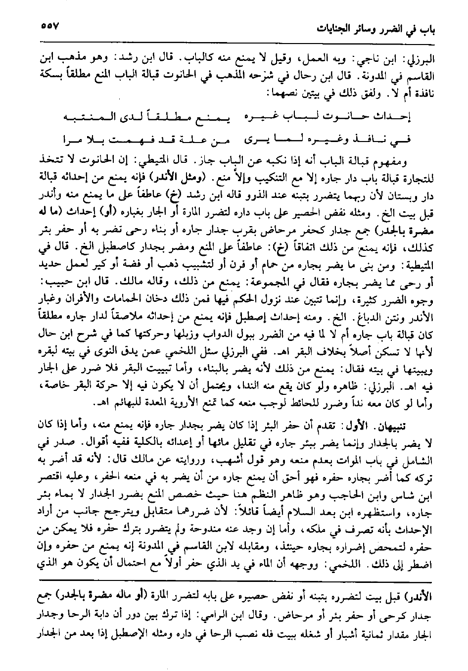 الْبُرْزُليّ: ابْن نَاجِي: وَبِه الْعَمَل، وَقيل لَا يمْنَع مِنْهُ كالباب. قَالَ ابْن رشد: وَهُوَ مَذْهَب ابْن الْقَاسِم فِي الْمُدَوَّنَة. قَالَ ابْن رحال فِي شَرحه الْمَذْهَب فِي الْحَانُوت قبالة الْبَاب الْمَنْع مُطلقًا بسكة نَافِذَة أم لَا. ولفق ذَلِك فِي بَيْتَيْنِ نصهما: إِحْدَاث حَانُوت لباب غَيره يمْنَع مُطلقًا لَدَى المنتبه فِي نَافِذ وَغَيره لما يرى من عِلّة قد فهمت بِلَا مرا وَمَفْهُوم قبالة الْبَاب أَنه إِذا نكبه عَن الْبَاب جَازَ. قَالَ المتيطي: إِن الْحَانُوت لَا تتَّخذ للتِّجَارَة قبالة بَاب دَار جَاره إِلَّا مَعَ التنكيب وإلاَّ منع. (وَمثل الأندر) فَإِنَّهُ يمْنَع من إحداثه قبالة دَار وبستان لِأَن ربهما يتَضَرَّر بتبنه عِنْد الذرو قَالَه ابْن رشد (خَ) عاطفاً على مَا يمْنَع مِنْهُ وأندر قبل بَيت الخ. وَمثله نفض الْحَصِير على بَاب دَاره لتضرر الْمَارَّة أَو الْجَار بغباره (أَو) إِحْدَاث (مَا لَهُ مضرَّة بالجدر) جمع جِدَار كحفر مرحاض بِقرب جِدَار جَاره أَو بِنَاء رحى تضر بِهِ أَو حفر بِئْر كَذَلِك، فَإِنَّهُ يمْنَع من ذَلِك اتِّفَاقًا (خَ) : عاطفاً على الْمَنْع وَمُضر بجدار كاصطبل الخ. قَالَ فِي الْمُتَيْطِيَّة: وَمن بنى مَا يضر بجاره من حمام أَو فرن أَو لتشبيب ذهب أَو فضَّة أَو كير لعمل حَدِيد أَو رحى مِمَّا يضر بجاره فَقَالَ فِي الْمَجْمُوعَة: يمْنَع من ذَلِك، وَقَالَهُ مَالك. قَالَ ابْن حبيب: وُجُوه الضَّرَر كَثِيرَة، وَإِنَّمَا تتبين عِنْد نزُول الحكم فِيهَا فَمن ذَلِك دُخان الحمامات والأفران وغبار الأندر ونتن الدّباغ. الخ. وَمِنْه إِحْدَاث إصطبل فَإِنَّهُ يمْنَع من إحداثه ملاصقاً لدار جَاره مُطلقًا كَانَ قبالة بَاب جَاره أم لَا لما فِيهِ من الضَّرَر ببول الدَّوَابّ وزبلها وحركتها كَمَا فِي شرح ابْن حَال لِأَنَّهَا لَا تسكن أصلا بِخِلَاف الْبَقر اه. فَفِي الْبُرْزُليّ سُئِلَ اللَّخْمِيّ عَمَّن يدق النَّوَى فِي بَيته لبقره ويبيتها فِي بَيته فَقَالَ: يمْنَع من ذَلِك لِأَنَّهُ يضر بِالْبِنَاءِ، وَأما تبييت الْبَقر فَلَا ضَرَر على الْجَار فِيهِ اه. الْبُرْزُليّ: ظَاهره وَلَو كَانَ يَقع مِنْهُ الندا، وَيحْتَمل أَن لَا يكون فِيهِ إِلَّا حَرَكَة الْبَقر خَاصَّة، وَأما لَو كَانَ مَعَه ندا وضرر للحائط لوَجَبَ مَنعه كَمَا تمنع الأروية الْمعدة للبهائم اه. تَنْبِيهَانِ. الأول: تقدم أَن حفر الْبِئْر إِذا كَانَ يضر بجدار جَاره فَإِنَّهُ يمْنَع مِنْهُ، وَأما إِذا كَانَ لَا يضر بالجدار وَإِنَّمَا يضر ببئر جَاره فِي تقليل مَائِهَا أَو إعدائه بِالْكُلِّيَّةِ فَفِيهِ أَقْوَال. صدر فِي الشَّامِل فِي بَاب الْموَات بِعَدَمِ مَنعه وَهُوَ قَول أَشهب، وَرِوَايَته عَن مَالك قَالَ: لِأَنَّهُ قد أضرّ بِهِ تَركه كَمَا أضرّ بجاره حفره فَهُوَ أَحَق أَن يمْنَع جَاره من أَن يضر بِهِ فِي مَنعه الْحفر، وَعَلِيهِ اقْتصر ابْن شَاس وَابْن الْحَاجِب وَهُوَ ظَاهر النّظم هُنَا حَيْثُ خصص الْمَنْع بِضَرَر الْجِدَار لَا بِمَاء بِئْر جَاره، واستظهره ابْن بعد السَّلَام أَيْضا قَائِلا: لِأَن ضررهما متقابل ويترجح جَانب من أَرَادَ الإحداث بِأَنَّهُ تصرف فِي ملكه، وَأما إِن وجد عَنهُ مندوحة وَلم يتَضَرَّر بترك حفره فَلَا يُمكن من حفره لتمحص إضراره بجاره حِينَئِذٍ، وَمُقَابِله لِابْنِ الْقَاسِم فِي الْمُدَوَّنَة إِنَّه يمْنَع من حفره وَإِن اضْطر إِلَى ذَلِك. اللَّخْمِيّ: وَوَجهه أَن المَاء فِي يَد الَّذِي حفر أَولا مَعَ احْتِمَال أَن يكون هُوَ الَّذِي