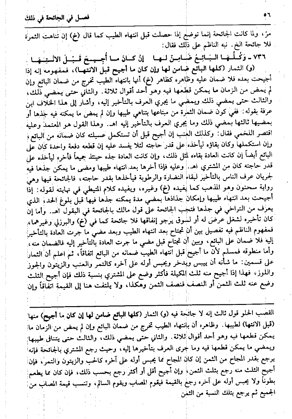 مرّ، وَلما كَانَت الْجَائِحَة إِنَّمَا تُوضَع إِذا حصلت قبل انْتِهَاء الطّيب كَمَا قَالَ (خَ) إِن تناهت الثَّمَرَة فَلَا جَائِحَة الخ. نبه النَّاظِم على ذَلِك فَقَالَ: وَكُلُّهَا البَائِعُ ضَامِنٌ لَهَا إنْ كانَ مَا أُجِيحَ قَبْلَ الانْتِهَا (و) الثِّمَار (كلهَا البَائِع ضَامِن لَهَا وَإِن كَانَ مَا أجيح قبل الانتها) ، فمفهومه إِنَّه إِذا أجيحت بعده فَلَا ضَمَان عَلَيْهِ وَظَاهره كظاهر (خَ) أَنَّهَا بانتهاء الطّيب تخرج من ضَمَان البَائِع وَإِن لم يمض من الزَّمَان مَا يُمكن قطعهَا فِيهِ وَهُوَ أحد أَقْوَال ثَلَاثَة. وَالثَّانِي حَتَّى يمْضِي ذَلِك، وَالثَّالِث حَتَّى يمْضِي ذَلِك ويمضي مَا يجْرِي الْعرف بِالتَّأْخِيرِ إِلَيْهِ، وَأَشَارَ إِلَى هَذَا الْخلاف ابْن عَرَفَة بقوله: فَفِي كَون ضَمَان الثَّمَرَة من مبتاعها بتناهي طيبها وَإِن لم يمض مَا يُمكنهُ فِيهِ جذها أَو بمضيها ثَالِثهَا بِمُضِيِّ ذَلِك وَمَا يجْرِي الْعرف بِالتَّأْخِيرِ إِلَيْهِ اه. وَهَذَا القَوْل هُوَ الْمُعْتَمد وَعَلِيهِ اقْتصر اللَّخْمِيّ فَقَالَ: وَكَذَلِكَ الْعِنَب إِن أجيح قبل أَن تستكمل عُسَيْلَته كَانَ ضَمَانه من البَائِع، وَإِن استكملها وَكَانَ بَقَاؤُهُ ليأخذه على قدر حَاجته لِئَلَّا يفْسد عَلَيْهِ إِن قطعه دفْعَة وَاحِدَة كَانَ على البَائِع أَيْضا إِن كَانَت الْعَادة بَقَاءَهُ لمثل ذَلِك، وَإِن كَانَت الْعَادة جذه حِينَئِذٍ جَمِيعًا فَأَخَّرَهُ ليأخذه على قدر حَاجته كَانَ من المُشْتَرِي اه. وَعَلِيهِ فَإِذا أَخّرهَا بعد انْتِهَاء طيبها وَمضى مَا يُمكن جذها فِيهِ لجَرَيَان عرف النَّاس بِالتَّأْخِيرِ لبَقَاء النضارة والرطوبة فيأخذها بِقدر حَاجته، فالجائحة فِيهَا وَهِي رِوَايَة سَحْنُون وَهُوَ الْمَذْهَب كَمَا يفِيدهُ (خَ) وَغَيره، ويفيده كَلَام المتيطي فِي نهايته لقَوْله: إِذا أجيحت بعد انْتِهَاء طيبها وَإِمْكَان جذاذها بِمُضِيِّ مُدَّة يُمكنهُ جذها فِيهَا قبل بُلُوغ الْحَد، الَّذِي يعرف من التَّرَاخِي فِي جذها فَتجب الْجَائِحَة على قَول مَالك بالجائحة فِي الْبُقُول اه. وَأما إِن كَانَ تَأْخِيره لشغل عرض لَهُ أَو لسوق يَرْجُو إنفاقها فَلَا جَائِحَة كَمَا فِي (خَ) والبرزلي وَغَيرهمَا، فمفهوم النَّاظِم فِيهِ تَفْصِيل بَين أَن تجتاح بعد انْتِهَاء الطّيب وَبعد مُضِيّ مَا جرت الْعَادة بِالتَّأْخِيرِ إِلَيْهِ فَلَا ضَمَان على البَائِع وَبَين أَن تجتاح قبل مُضِيّ مَا جرت الْعَادة بِالتَّأْخِيرِ إِلَيْهِ فَالضَّمَان مِنْهُ، وَأما منطوقه فَمُسلم لِأَن مَا أجيح قبل انْتِهَاء الطّيب ضَمَانه من البَائِع اتِّفَاقًا، ثمَّ اعْلَم أَن الثِّمَار على قسمَيْنِ: مَا شَأْنه أَن ييبس ويدخر وَيحبس أَوله على آخِره كالتمر وَالْعِنَب وَالزَّيْتُون والجوز واللوز، فَهَذَا إِذا أجيح مِنْهُ ثلث المكيلة فَأكْثر وضع على المُشْتَرِي بِنِسْبَة ذَلِك فَإِن أجيح الثُّلُث وضع عَنهُ ثلث الثّمن أَو النّصْف فَنصف الثّمن وَهَكَذَا، وَلَا يلْتَفت هُنَا إِلَى الْقيمَة اتِّفَاقًا وَإِن