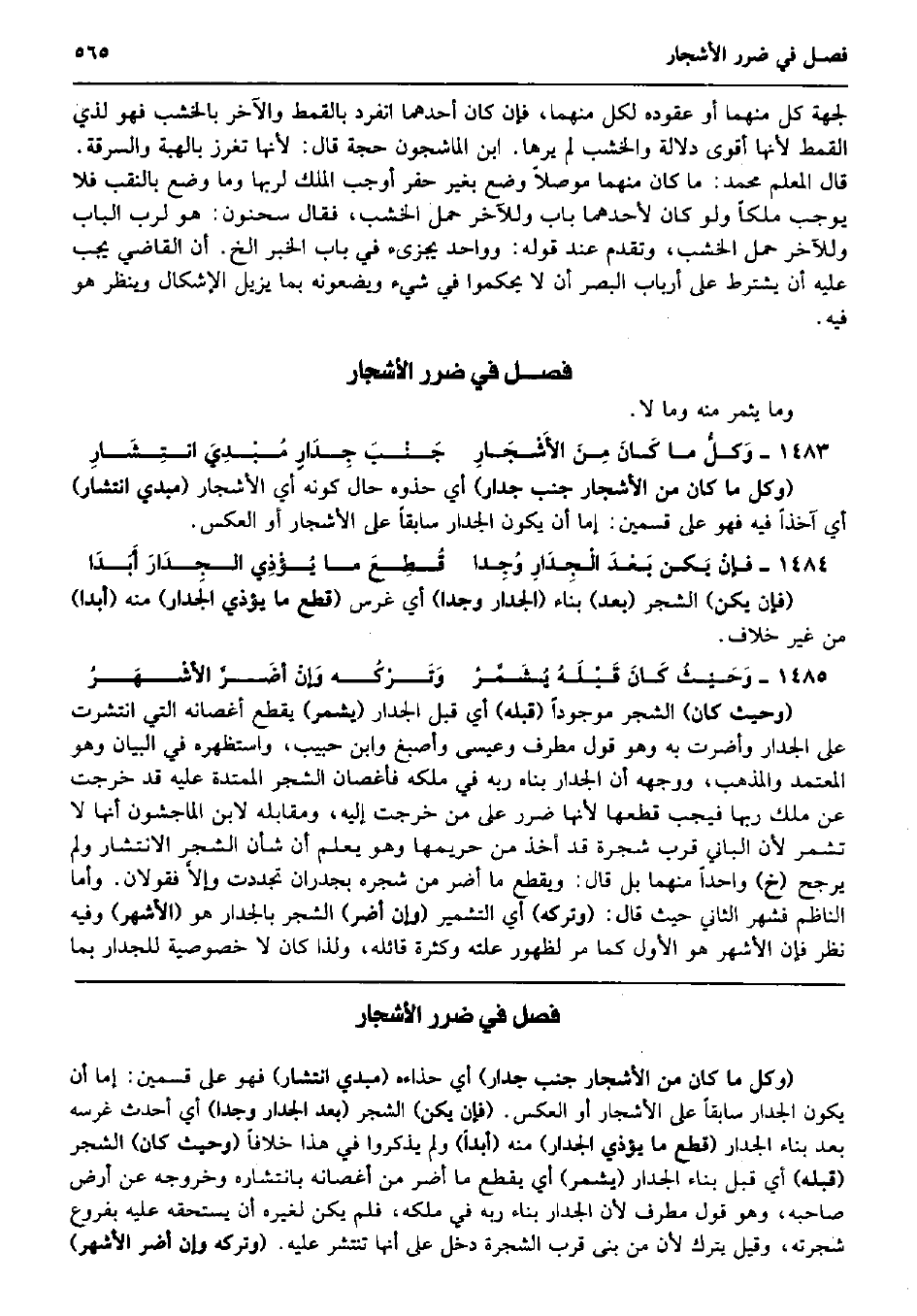وَمَا يُثمر مِنْهُ وَمَا لَا. وَكلُّ مَا كَانَ مِنَ الأَشْجَارِ جَنْبَ جِدَارٍ مُبْدِيَ انتِشَارِ (وكل مَا كَانَ من الْأَشْجَار جنب جِدَار) أَي حذوه حَال كَونه أَي الْأَشْجَار (مبدي انتشار) أَي آخِذا فِيهِ فَهُوَ على قسمَيْنِ: إِمَّا أَن يكون الْجِدَار سَابِقًا على الْأَشْجَار أَو الْعَكْس. فإنْ يَكن بَعْدَ الْجِدَارِ وُجِدا قُطِعَ مَا يُؤْذِي الجِدَارَ أَبَدَا (فَإِن يكن) الشّجر (بعد) بِنَاء (الْجِدَار وجدا) أَي غرس (قطع مَا يُؤْذِي الْجِدَار) مِنْهُ (أبدا) من غير خلاف. وَحَيْثُ كَانَ قَبْلَهُ يُشَمَّرُ وَتَرْكُه وَإنْ أضَرَّ الأشْهَرُ (وَحَيْثُ كَانَ) الشّجر مَوْجُودا (قبله) أَي قبل الْجِدَار (يشمر) يقطع أغصانه الَّتِي انتشرت على الْجِدَار وأضرت بِهِ وَهُوَ قَول مطرف وَعِيسَى وَأصبغ وَابْن حبيب، واستظهره فِي الْبَيَان وَهُوَ الْمُعْتَمد وَالْمذهب، وَوَجهه أَن الْجِدَار بناه ربه فِي ملكه فأغصان الشّجر الممتدة عَلَيْهِ قد خرجت عَن ملك رَبهَا فَيجب قطعهَا لِأَنَّهَا ضَرَر على من خرجت إِلَيْهِ، وَمُقَابِله لِابْنِ الْمَاجشون أَنَّهَا لَا تشمر لِأَن الْبَانِي قرب شَجَرَة قد أَخذ من حريمها وَهُوَ يعلم أَن شَأْن الشّجر الانتشار وَلم يرجح (خَ) وَاحِدًا مِنْهُمَا بل قَالَ: وَيقطع مَا أضرّ من شَجَره بجدران تَجَدَّدَتْ وإلاَّ فَقَوْلَانِ. وَأما النَّاظِم فشهر الثَّانِي حَيْثُ قَالَ: (وَتَركه) أَي التشمير (وَإِن أضرّ) الشّجر بالجدار هُوَ (الْأَشْهر) وَفِيه نظر فَإِن الْأَشْهر هُوَ الأول كَمَا مر لظُهُور علته وَكَثْرَة قَائِله، وَلذَا كَانَ لَا خُصُوصِيَّة للجدار بِمَا