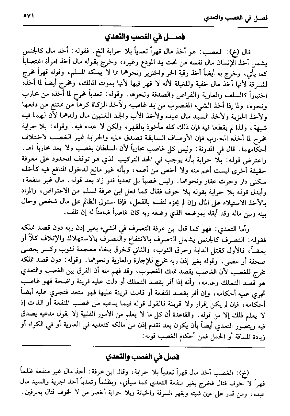 قَالَ (خَ) : الْغَصْب: هُوَ أَخذ مَال قهرا تَعَديا بِلَا حرابة الخ. فَقَوله: أَخذ مَال كالجنس يَشْمَل أَخذ الْإِنْسَان مَال نَفسه من تَحت يَد الْمُودع وَغَيره، وَخرج بقوله مَال أَخذ امْرَأَة اغتصاباً كَمَا يَأْتِي، وَخرج بِهِ أَيْضا أَخذ رَقَبَة الْحر وَالْخِنْزِير وَنَحْوهمَا مِمَّا لَا يملكهُ الْمُسلم، وَقَوله قهرا مخرج للسرقة لِأَنَّهَا أَخذ مَال خُفْيَة وللغيلة لِأَنَّهُ لَا قهر فِيهَا لِأَنَّهَا بِمَوْت الْمَالِك، ومخرج أَيْضا لما أَخذه اخْتِيَارا كالسلف وَالْعَارِية والقراض وَالصَّدَََقَة وَنَحْوهَا. وَقَوله: تَعَديا مخرج لما أَخذه من محَارب وَنَحْوه، وَلما إِذا أَخذ الشَّيْء الْمَغْصُوب من يَد غاصبه ولآخذ الزَّكَاة كرها من مُمْتَنع من دَفعهَا ولأخذ الْجِزْيَة ولأخذ السَّيِّد مَال عَبده ولأخذ الْأَب وَالْجد الغنيين مَال ولدهما لِأَن لَهما فِيهِ شُبْهَة، وَلذَا لم يقطعا فِيهِ فَإِن ذَلِك كُله مَأْخُوذ بالقهر، وَلَكِن لَا عداء فِيهِ. وَقَوله: بِلَا حرابة مخرج لما أَخذه الْمُحَارب فَإِن الْأَوْصَاف السَّابِقَة تصدق عَلَيْهِ والحرابة غير الْغَصْب لاخْتِلَاف أحكامهما. قَالَ فِي الْمُدَوَّنَة: وَلَيْسَ كل غَاصِب مُحَاربًا لِأَن السُّلْطَان يغصب وَلَا يعد مُحَاربًا اه. وَاعْترض قَوْله: بِلَا حرابة بِأَنَّهُ يُوجب فِي الْحَد التَّرْكِيب الَّذِي هُوَ توقف الْمَحْدُود على معرفَة حَقِيقَة أُخْرَى لَيست أَعم مِنْهُ وَلَا أخص من أعمه، وَبِأَنَّهُ غير مَانع لدُخُول الْمَنَافِع فِيهِ كأخذه سُكْنى دَار وحرث عقار وَنَحْوهمَا. وَلَيْسَ غصبا بل تَعَديا فَلَو زَاد بعد قَوْله: مَال غير مَنْفَعَة، وأبدل قَوْله بِلَا حرابة بقوله بِلَا خوف فَقَالَ كَمَا فعل ابْن عَرَفَة لسلم من الِاعْتِرَاض، وَالْمرَاد بِالْأَخْذِ الِاسْتِيلَاء على المَال وَإِن لم يحزه لنَفسِهِ بِالْفِعْلِ، فَإِذا استولى الظَّالِم على مَال شخص وَحَال بَينه وَبَين مَاله وَقد أبقاه بموضعه الَّذِي وَضعه ربه كَانَ غَاصبا ضَامِنا لَهُ إِن تلف. وَأما التَّعَدِّي: فَهُوَ كَمَا قَالَ ابْن عَرَفَة التَّصَرُّف فِي الشَّيْء بِغَيْر إِذن ربه دون قصد تملكه فَقَوله: التَّصَرُّف كالجنس يَشْمَل التَّصَرُّف بِالِانْتِفَاعِ وَالتَّصَرُّف بالاستهلاك والإتلاف كلا أَو بَعْضًا، فَالْأول كَقَتل الدَّابَّة وَحرق الثَّوْب، وَالثَّانِي كخرق بخاء مُعْجمَة لثوب وَكسر بعصى صَحْفَة أَو عصى، وَقَوله بِغَيْر إِذن ربه مخرج للإجارة وَالْعَارِية وَنَحْوهمَا. وَقَوله: دون قصد تملكه مخرج للغصب لِأَن الْغَاصِب يقْصد تملك الْمَغْصُوب، وَقد فهم مِنْهُ أَن الْفرق بَين الْغَصْب والتعدي هُوَ قصد التَّمَلُّك وَعَدَمه، وَأَنه إِذا أقرّ بِقصد التَّمَلُّك أَو دلّت عَلَيْهِ قرينَة وَاضِحَة فَهُوَ غَاصِب تجْرِي عَلَيْهِ أَحْكَامه، وَإِن أقرّ بِقصد الْمَنْفَعَة أَو قَامَت قرينَة عَلَيْهَا فَهُوَ مُتَعَدٍّ فتجري عَلَيْهِ أَيْضا أَحْكَامه، فَإِن لم يكن إِقْرَار وَلَا قرينَة فَالْقَوْل قَوْله فِيمَا يَدعِيهِ من غصب الْمَنْفَعَة أَو الذَّات إِذْ لَا يعلم ذَلِك إِلَّا من قَوْله. وَالْقَاعِدَة أَن كل مَا لَا يعلم من الْأُمُور القلبية إِلَّا بقول مدعيه يصدق فِيهِ وَيتَصَوَّر التَّعَدِّي أَيْضا بِأَن يكون بعد تقدم إِذن من مَالِكه كتعديه فِي الْعَارِية أَو فِي الْكِرَاء أَو زِيَادَة الْمسَافَة أَو الْحمل فَمن أَحْكَام الْغَصْب قَوْله: