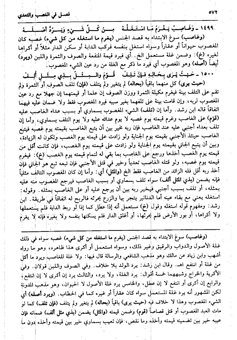 وَغَاصِبٌ يَغْرَمُ مَا اسْتَغَلَّهُ مِنْ كُلِّ شَيْءٍ وَيَرُدُّ أصْلَهُ (وغاصب) سوغ الِابْتِدَاء بِهِ قصد الْجِنْس (يغرم مَا استغله من كل شَيْء) غصبه كَانَ الْمَغْصُوب حَيَوَانا أَو عقارا وَسَوَاء استغل بِنَفسِهِ فَركب الدَّابَّة أَو سكن الدَّار مثلا أَو أكراها لغيره (خَ) : وَضمن غلَّة مُسْتَعْمل الخ. أَي فَيرد قيمَة الْمَنْفَعَة وَالصُّوف وَالثَّمَرَة وَاللَّبن (وَيرد) أَيْضا (أَصله) وَهُوَ الْمَغْصُوب أَي فَيرد مَا ذكر مَعَ الْغلَّة من رد عين الشَّيْء الْمَغْصُوب. حَيْثُ يُرَى بِحَالِهِ فإنْ تَلِفْ قُوِّمَ والمِثْلُ بِذِي مِثْلِ أُلِفْ (حَيْثُ يرى) كل مِنْهُمَا بَاقِيا (بِحَالهِ) لم يتَغَيَّر وَلم يتْلف (فَإِن) تلف الصُّوف أَو الثَّمَرَة وَلم تقم على التّلف بَيِّنَة فَيغرم مكيلة الثَّمَرَة وَوزن الصُّوف إِن علما أَو قيمتهمَا إِن جهلا مَعَ رد عين الْمَغْصُوب لرَبه، وَإِن قَامَت بَيِّنَة على تلفهما بِغَيْر سَببه فَيرد الْمَغْصُوب فَقَط وَلَا ضَمَان عَلَيْهِ فيهمَا اتِّفَاقًا قَالَه ابْن رشد. وَأما إِن (تلف) الشَّيْء الْمَغْصُوب بسماوي أَو بِسَبَب عداء الْغَاصِب عَلَيْهِ (قوّم) على الْغَاصِب وَغرم قِيمَته يَوْم غصبه لَا يَوْم عدائه عَلَيْهِ وَلَا يَوْم التّلف بسماوي، وَأما إِن تلف بعداء أَجْنَبِي عَلَيْهِ عِنْد الْغَاصِب فَإِن ربه مُخَيّر بَين أَن يتبع الْغَاصِب بِقِيمَتِه يَوْم غصبه فَيتبع الْغَاصِب حِينَئِذٍ الْأَجْنَبِيّ بِقِيمَتِه يَوْم الْجِنَايَة وَلَو زَادَت على قِيمَته يَوْم الْغَصْب وَتَكون لَهُ الزِّيَادَة، وَبَين أَن يتبع الْجَانِي بِقِيمَتِه يَوْم الْجِنَايَة وَلَو زَادَت على قِيمَته يَوْم الْغَصْب، فَإِن كَانَت أقل من قِيمَته يَوْم الْغَصْب أَخذهَا وَرجع على الْغَاصِب بِمَا بَقِي لَهُ لتَمام قِيمَته يَوْم الْغَصْب (خَ) : فَيغرم قِيمَته يَوْم غصبه، وَلَو قَتله الْغَاصِب تَعَديا وَخير فِي قتل الْأَجْنَبِيّ فَإِن تبعه تبع هُوَ الْجَانِي فَإِن أَخذ ربه أقل فَلهُ الزَّائِد من الْغَاصِب فَقَط الخ (والمثل) أَي: وَأما إِن كَانَ الْمَغْصُوب التَّالِف مثلِيا فَإِنَّهُ يضمن (بِذِي الْمثل ألف) سَوَاء تلف بسماوي أَو بِسَبَب الْغَاصِب فَيرجع الْمَغْصُوب مِنْهُ عَلَيْهِ بِمثلِهِ، أَو تلف بِسَبَب أَجْنَبِي فَيُخَير ربه بَين أَن يرجع عَلَيْهِ أَو على الْغَاصِب بِمثلِهِ. وَقَوله: استغله يَعْنِي مَعَ بَقَاء عينه أما الدَّنَانِير يتجر بهَا وَالزَّرْع يحرثه فَالرِّبْح لَهُ اتِّفَاقًا فِي طَريقَة. ابْن رشد: وَمَفْهُوم قَوْله استغله وَقَول (خَ) مُسْتَعْمل أَنه إِذا عطل كَمَا إِذا لَو ربط الدَّابَّة فَلم يستعملها وَلَا أكراها، أَو بور الأَرْض فَلم يحرثها، أَو أغلق الدَّار فَلم يسكنهَا بِنَفسِهِ وَلَا بِغَيْرِهِ فَإِنَّهُ لَا يغرم