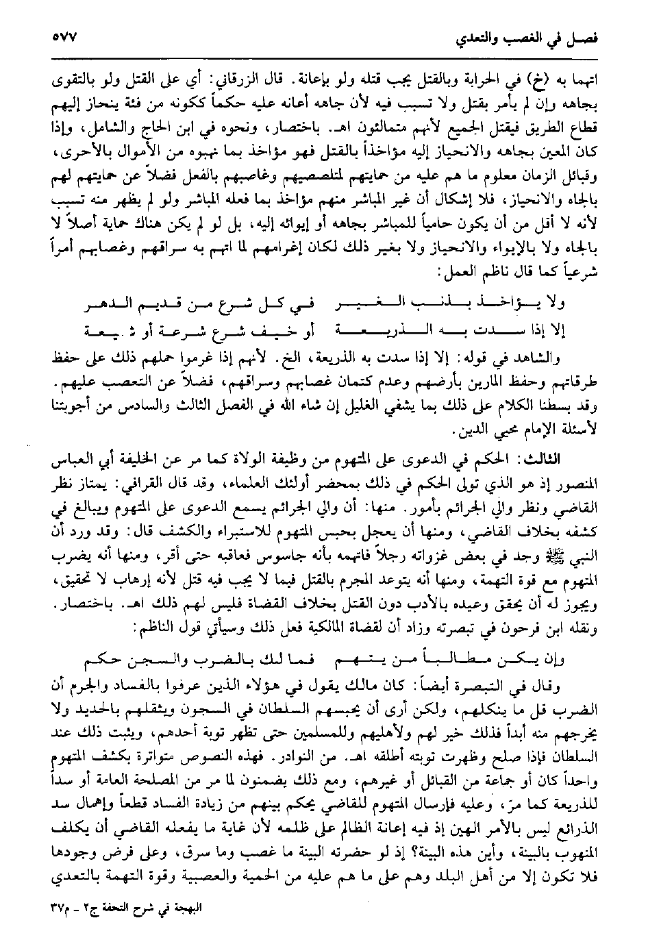 اتهما بِهِ (خَ) فِي الْحِرَابَة وبالقتل يجب قَتله وَلَو بإعانة. قَالَ الزّرْقَانِيّ: أَي على الْقَتْل وَلَو بالتقوى بجاهه وَإِن لم يَأْمر بقتل وَلَا تسبب فِيهِ لِأَن جاهه أَعَانَهُ عَلَيْهِ حكما كَكَوْنِهِ من فِئَة ينحاز إِلَيْهِم قطاع الطَّرِيق فَيقْتل الْجَمِيع لأَنهم متمالئون اه. بِاخْتِصَار، وَنَحْوه فِي ابْن الْحَاج والشامل، وَإِذا كَانَ الْمعِين بجاهه والانحياز إِلَيْهِ مؤاخذاً بِالْقَتْلِ فَهُوَ مؤاخذ بِمَا نهبوه من الْأَمْوَال بالأحرى، وقبائل الزَّمَان مَعْلُوم مَا هم عَلَيْهِ من حمايتهم لمتلصصيهم وغاصبهم بِالْفِعْلِ فضلا عَن حمايتهم لَهُم بالجاه والانحياز، فَلَا إِشْكَال أَن غير الْمُبَاشر مِنْهُم مؤاخذ بِمَا فعله الْمُبَاشر وَلَو لم يظْهر مِنْهُ تسبب لِأَنَّهُ لَا أقل من أَن يكون حامياً للمباشر بجاهه أَو إيوائه إِلَيْهِ بل لَو لم يكن هُنَاكَ حماية أصلا لَا بالجاه وَلَا بالإيواء والانحياز وَلَا بِغَيْر ذَلِك لَكَانَ إغرامهم لما اتهمَ بِهِ سراقهم وغصابهم أمرا شَرْعِيًّا كَمَا قَالَ ناظم الْعَمَل: وَلَا يُؤَاخذ بذنب الْغَيْر فِي كل شرع من قديم الدَّهْر إِلَّا إِذا سدت بِهِ الذريعة أَو خيف شرع شرعة أَو شيعَة وَالشَّاهِد فِي قَوْله: إِلَّا إِذا سدت بِهِ الذريعة، الخ. لأَنهم إِذا غرموا حملهمْ ذَلِك على حفظ طرقاتهم وَحفظ المارين بأرضهم وَعدم كتمان غصابهم وسراقهم، فضلا عَن التعصب عَلَيْهِم. وَقد بسطنا الْكَلَام على ذَلِك بِمَا يشفي الغليل إِن شَاءَ الله فِي الْفَصْل الثَّالِث وَالسَّادِس من أجوبتنا لأسئلة الإِمَام محيي الدّين. الثَّالِث: الحكم فِي الدَّعْوَى على المتهوم من وَظِيفَة الْوُلَاة كَمَا مر عَن الْخَلِيفَة أبي الْعَبَّاس الْمَنْصُور إِذْ هُوَ الَّذِي تولى الحكم فِي ذَلِك بِمحضر أُولَئِكَ الْعلمَاء، وَقد قَالَ الْقَرَافِيّ: يمتاز نظر القَاضِي وَنظر وَالِي الجرائم بِأُمُور. مِنْهَا: أَن وَالِي الجرائم يسمع الدَّعْوَى على المتهوم ويبالغ فِي كشفه بِخِلَاف القَاضِي، وَمِنْهَا أَن يعجل بِحَبْس المتهوم للاستبراء والكشف قَالَ: وَقد ورد أَن النَّبِي صلى الله عَلَيْهِ وَسلم وجد فِي بعض غَزَوَاته رجلا فاتهمه بِأَنَّهُ جاسوس فعاقبه حَتَّى أقرّ، وَمِنْهَا أَنه يضْرب المتهوم مَعَ قُوَّة التُّهْمَة، وَمِنْهَا أَنه يتوعد المجرم بِالْقَتْلِ فِيمَا لَا يجب فِيهِ قتل لِأَنَّهُ إرهاب لَا تَحْقِيق، وَيجوز لَهُ أَن يُحَقّق وعيده بالأدب دون الْقَتْل بِخِلَاف الْقُضَاة فَلَيْسَ لَهُم ذَلِك اه. بِاخْتِصَار. وَنَقله ابْن فَرِحُونَ فِي تبصرته وَزَاد أَن لقضاة الْمَالِكِيَّة فعل ذَلِك وَسَيَأْتِي قَول النَّاظِم: وَإِن يكن مطالباً من يتهم فَمَا لَك بِالضَّرْبِ والسجن حكم وَقَالَ فِي التَّبْصِرَة أَيْضا: كَانَ مَالك يَقُول فِي هَؤُلَاءِ الَّذين عرفُوا بِالْفَسَادِ والجرم أَن الضَّرْب قل مَا ينكلهم، وَلَكِن أرى أَن يحبسهم السُّلْطَان فِي السجون ويثقلهم بالحديد وَلَا يخرجهم مِنْهُ أبدا فَذَلِك خير لَهُم ولأهليهم وللمسلمين حَتَّى تظهر تَوْبَة أحدهم، وَيثبت ذَلِك عِنْد السُّلْطَان فَإِذا صلح وَظَهَرت تَوْبَته أطلقهُ اه. من النَّوَادِر. فَهَذِهِ النُّصُوص متواترة بكشف المتهوم وَاحِدًا كَانَ أَو جمَاعَة من الْقَبَائِل أَو غَيرهم، وَمَعَ ذَلِك يضمنُون لما مر من الْمصلحَة الْعَامَّة أَو سداً للذريعة كَمَا مرّ، وَعَلِيهِ فإرسال المتهوم للْقَاضِي يحكم بَينهم من زِيَادَة الْفساد قطعا وإهمال سد الذرائع لَيْسَ بِالْأَمر الهين إِذْ فِيهِ إِعَانَة الظَّالِم على ظلمه لِأَن غَايَة مَا يَفْعَله القَاضِي أَن يُكَلف المنهوب بِالْبَيِّنَةِ، وَأَيْنَ هَذِه الْبَيِّنَة؟ إِذْ لَو حَضرته الْبَيِّنَة مَا غصب وَمَا سرق، وعَلى فرض وجودهَا فَلَا تكون إِلَّا من أهل الْبَلَد وهم على مَا هم عَلَيْهِ من الحمية والعصبية وَقُوَّة التُّهْمَة بِ