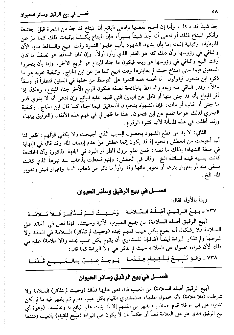 وَبَدَأَ بِالْأولِ فَقَالَ: بَيْعُ الرَّقِيقِ أَصْلُهُ السَّلامَهْ وَحَيْثُ لَمْ تُذْكَرْ فَلاَ مَلاَمَهْ (بيع الرَّقِيق أَصله السَّلامَة) من جَمِيع الْعُيُوب الْآتِيَة وَحِينَئِذٍ، فَإِذا نَص فِي العقد على السَّلامَة فَلَا إِشْكَال أَنه يقوم بِكُل عيب قديم يجده (وَحَيْثُ لم تذكر) السَّلامَة فِي العقد وَلَا شَرطهَا وَلم تذكر الْبَرَاءَة أَيْضا (ف) إِن للْمُشْتَرِي أَن يقوم بِكُل عيب يجده و (لَا ملامة) عَلَيْهِ فِي ذَلِك لِأَن شِرَاءَهُ مَحْمُول على السَّلامَة حَيْثُ لم تذكر هِيَ وَلَا الْبَرَاءَة كَمَا قَالَ: وَهُوَ مُبِيحٌ لِلْقِيَامِ عِنْدَمَا يُوجِدُ عَيْبٌ بِالمَبِيعِ قَدُمَا