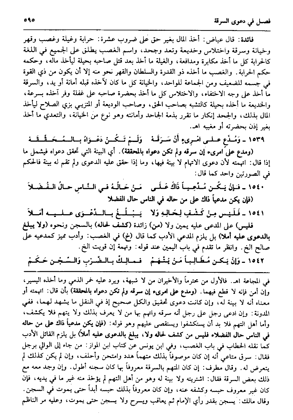 فَائِدَة: قَالَ عِيَاض: أَخذ المَال بِغَيْر حق على ضروب عشرَة: حرابة وغيلة وغصب وقهر وخيانة وسرقة واختلاس وخديعة وتعد وَجحد، وَاسم الْغَصْب يُطلق على الْجَمِيع فِي اللُّغَة كالحرابة كل مَا أَخذ مُكَابَرَة ومدافعة، والغيلة مَا أَخذ بعد قتل صَاحبه بحيلة ليَأْخُذ مَاله، وَحكمه حكم الْحِرَابَة. وَالْغَصْب مَا أَخذه ذُو الْقُدْرَة وَالسُّلْطَان والقهر نَحْو مِنْهُ إِلَّا أَن يكون من ذِي الْقُوَّة فِي جِسْمه للضعيف وَمن الْجَمَاعَة للْوَاحِد، والخيانة كل مَا كَانَ لآخذه قبله أَمَانَة أَو يَد، وَالسَّرِقَة مَا أَخذ على وَجه الاختفاء، والاختلاس كل مَا أَخذ بِحَضْرَة صَاحبه على غَفلَة وفر آخذه بِسُرْعَة، والخديعة مَا أَخذه بحيلة كالتشبه بِصَاحِب الْحق، وَصَاحب الْوَدِيعَة أَو المتزيي بزِي الصّلاح ليَأْخُذ المَال بذلك، والجحد إِنْكَار مَا تقرر بِذِمَّة الجاحد وأمانته وَهُوَ نوع من الْخِيَانَة، والتعدي مَا أَخذ بِغَيْر إِذن بِحَضْرَتِهِ أَو مغيبه اه. وَمُدَّعٍ على امْرِىءٍ أَنْ سَرَقَهْ وَلَمْ تَكُنْ دَعْوَاهُ بالمُحَقَّقَهْ (ومدع على امرىء إِن سَرقه وَلم تكن دَعْوَاهُ بالمحققة) . أَي الْبَيِّنَة الَّتِي تحقق دَعْوَاهُ فَيشْمَل مَا إِذا قَالَ: اتهمته لِأَن دَعْوَى الاتهام لَا بَيِّنَة فِيهَا، وَمَا إِذا حقق عَلَيْهِ الدَّعْوَى وَلم تقم لَهُ بَيِّنَة فَالْحكم فِي الصُّورَتَيْنِ وَاحِد كَمَا قَالَ: فإنْ يَكُن مُدَّعِياً ذَاكَ عَلَى مَنْ حَالُهُ فِي النَّاسِ حالُ الفُضَلاَ (فَإِن يكن مُدعيًا ذَاك على من حَاله فِي النَّاس حَال الفضلا فَلَيْس مِنْ كَشْفٍ لِحَالِهِ وَلا يَبْلُغُ بالدَّعْوَى عَلَيْهِ أمَلاَ فَلَيْسَ) على الْمُدعى عَلَيْهِ يَمِين وَلَا (من) زَائِدَة (كشف لحاله) بالسجن وَنَحْوه (وَلَا يبلغ بِالدَّعْوَى عَلَيْهِ أملا) بل يلْزم الْمُدَّعِي الْأَدَب كَمَا قَالَ (خَ) فِي الْغَصْب: وأدب مُمَيّز كمدعيه على صَالح الخ. وَانْظُر مَا تقدم فِي بَاب الْيَمين عِنْد قَوْله: وتهمة إِن قويت الخ. وَإنْ يَكن مُطَالِباً مَنْ يُتَّهَمْ فمالِكٌ بالضَّرْبِ وَالسِّجْن حَكَمْ