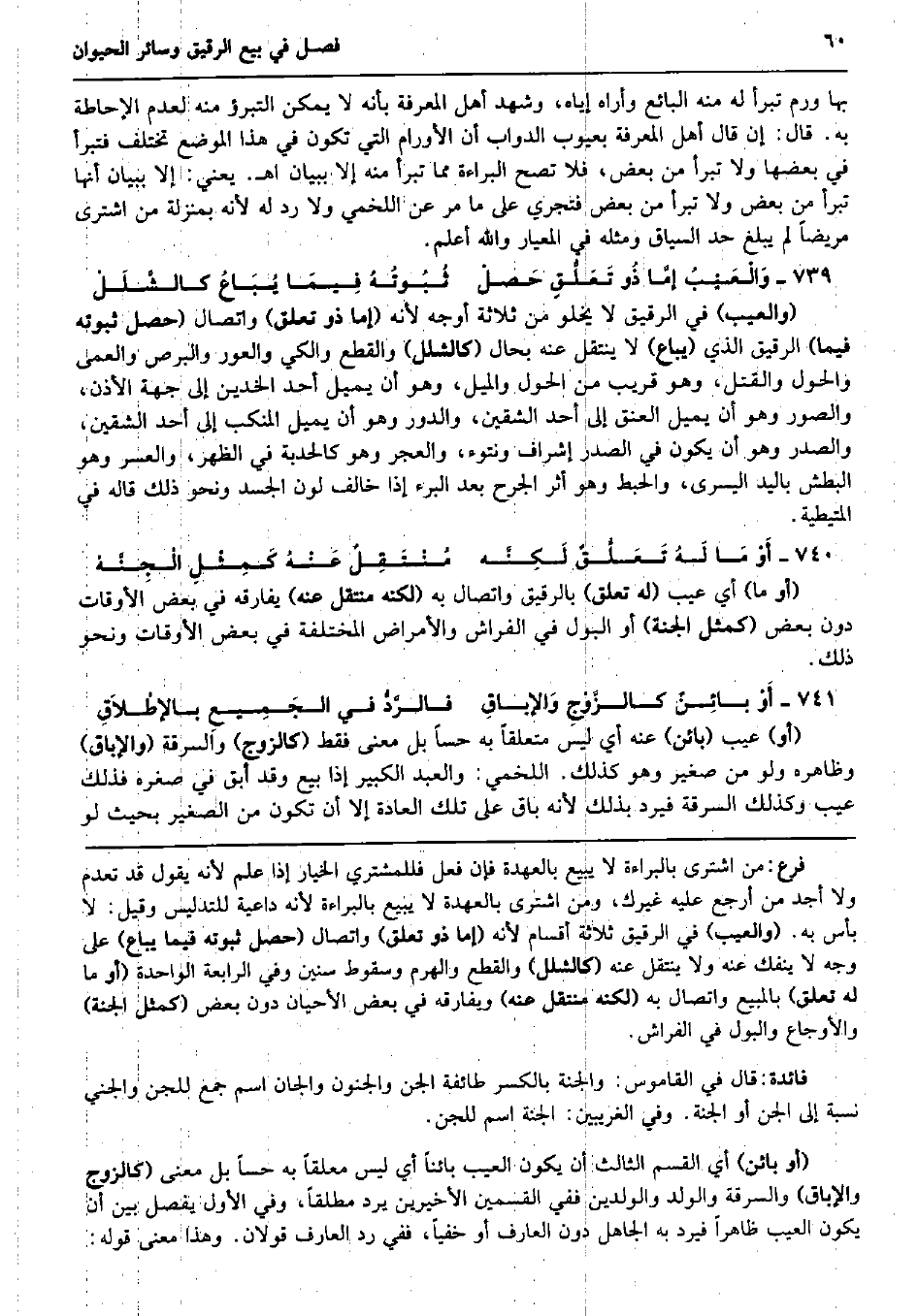 بهَا ورم تَبرأ لَهُ مِنْهُ البَائِع وَأرَاهُ إِيَّاه، وَشهد أهل الْمعرفَة بِأَنَّهُ لَا يُمكن التبرؤ مِنْهُ لعدم الْإِحَاطَة بِهِ. قَالَ: إِن قَالَ أهل الْمعرفَة بعيوب الدَّوَابّ أَن الأورام الَّتِي تكون فِي هَذَا الْموضع تخْتَلف فتبرأ فِي بَعْضهَا وَلَا تَبرأ من بعض، فَلَا تصح الْبَرَاءَة مِمَّا تَبرأ مِنْهُ إِلَّا بِبَيَان اه. يَعْنِي: إِلَّا بِبَيَان أَنَّهَا تَبرأ من بعض وَلَا تَبرأ من بعض فتجري على مَا مر عَن اللَّخْمِيّ وَلَا رد لَهُ لِأَنَّهُ بِمَنْزِلَة من اشْترى مَرِيضا لم يبلغ حد السِّيَاق وَمثله فِي المعيار وَالله أعلم. وَالْعَيْبُ إمَّا ذُو تَعَلُّقٍ حَصلْ ثُبُوتُهُ فِيمَا يُبَاعُ كالشَّلَلْ (وَالْعَيْب) فِي الرَّقِيق لَا يَخْلُو من ثَلَاثَة أوجه لِأَنَّهُ (إِمَّا ذُو تعلق) واتصال (حصل ثُبُوته فِيمَا) الرَّقِيق الَّذِي (يُبَاع) لَا ينْتَقل عَنهُ بِحَال (كالشلل) وَالْقطع والكي والعور والبرص والعمى والحول وَالْقَتْل، وَهُوَ قريب من الْحول والميل، وَهُوَ أَن يمِيل أحد الْخَدين إِلَى جِهَة الْأذن، والصور وَهُوَ أَن يمِيل الْعُنُق إِلَى أحد الشقين، والدور وَهُوَ أَن يمِيل الْمنْكب إِلَى أحد الشقين، والصدر وَهُوَ أَن يكون فِي الصَّدْر إشراف ونتوء، والعجر وَهُوَ كالحدبة فِي الظّهْر، والعسر وَهُوَ الْبَطْش بِالْيَدِ الْيُسْرَى، والحبط وَهُوَ أثر الْجرْح بعد الْبُرْء إِذا خَالف لون الْجَسَد وَنَحْو ذَلِك قَالَه فِي الْمُتَيْطِيَّة. أَوْ مَا لَهُ تَعَلُّقٌ لَكِنَّه مُنْتَقِلٌ عَنْهُ كَمِثْلِ الْجِنَّهْ (أَو مَا) أَي عيب (لَهُ تعلق) بالرقيق واتصال بِهِ (لكنه منتقل عَنهُ) يُفَارِقهُ فِي بعض الْأَوْقَات دون بعض (كَمثل الْجنَّة) أَو الْبَوْل فِي الْفراش والأمراض الْمُخْتَلفَة فِي بعض الْأَوْقَات وَنَحْو ذَلِك. أَوْ بائِنٌ كالزَّوْجِ وَالإباقِ فالرَّدُّ فِي الجَمِيعِ بالإطْلاَقِ (أَو) عيب (بَائِن) عَنهُ أَي لَيْسَ مُتَعَلقا بِهِ حسا بل معنى فَقَط (كالزوج) وَالسَّرِقَة (والإباق) وَظَاهره وَلَو من صَغِير وَهُوَ كَذَلِك. اللَّخْمِيّ: وَالْعَبْد الْكَبِير إِذا بيع وَقد أبق فِي صغره فَذَلِك عيب وَكَذَلِكَ السّرقَة فَيرد بذلك لِأَنَّهُ بَاقٍ على تِلْكَ الْعَادة إِلَّا أَن تكون من الصَّغِير بِحَيْثُ لَو