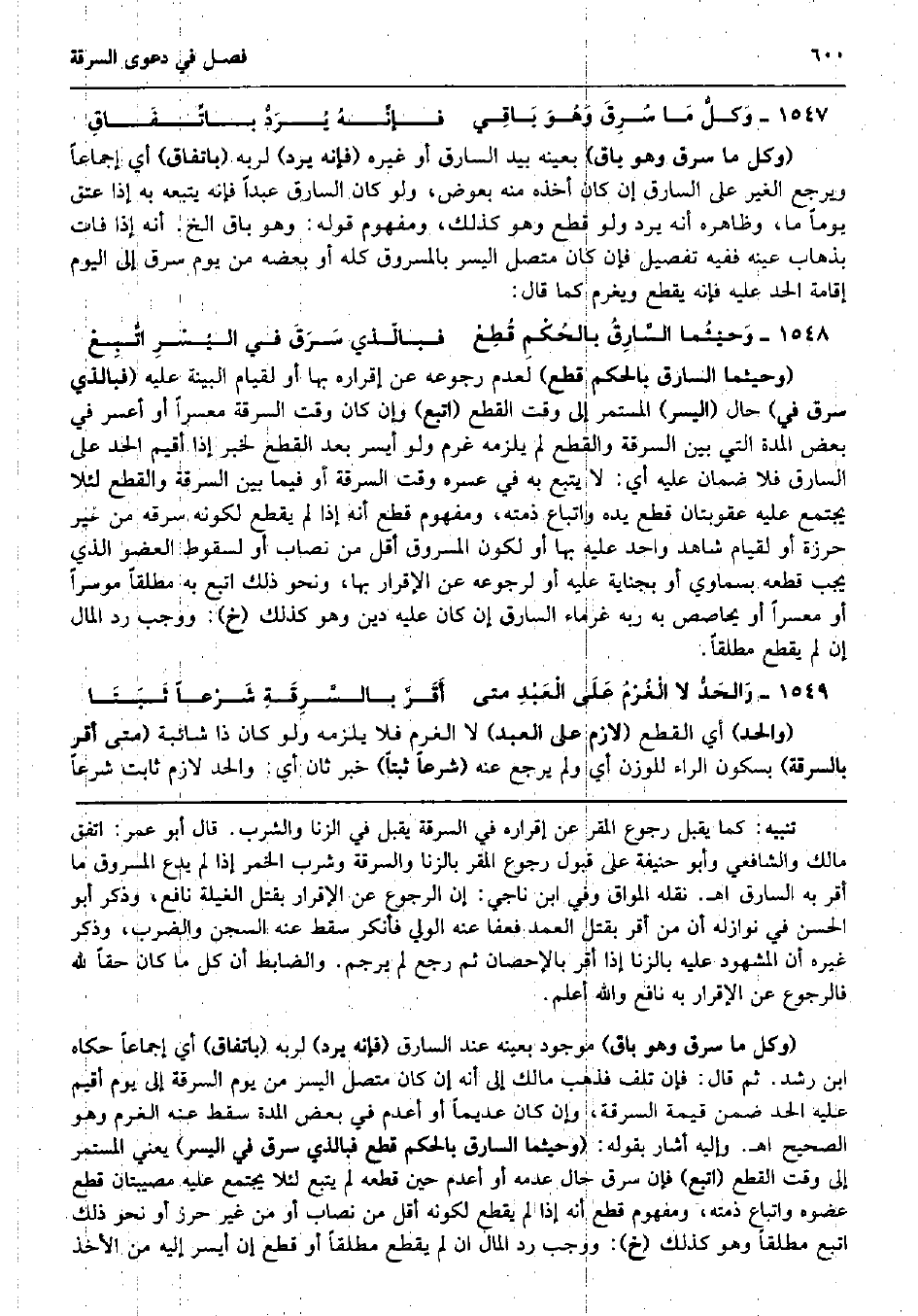 وَكلُّ مَا سُرِقَ وَهُوَ بَاقِي فإنَّهُ يُرَدُّ باتِّفَاقِ (وكل مَا سرق وَهُوَ بَاقٍ) بِعَيْنِه بيد السَّارِق أَو غَيره (فَإِنَّهُ يرد) لرَبه (بِاتِّفَاق) أَي إِجْمَاعًا وَيرجع الْغَيْر على السَّارِق إِن كَانَ أَخذه مِنْهُ بعوض، وَلَو كَانَ السَّارِق عبدا فَإِنَّهُ يتبعهُ بِهِ إِذا عتق يَوْمًا مَا، وَظَاهره أَنه يرد وَلَو قطع وَهُوَ كَذَلِك، وَمَفْهُوم قَوْله: وَهُوَ بَاقٍ الخ. أَنه إِذا فَاتَ بذهاب عينه فَفِيهِ تَفْصِيل فَإِن كَانَ مُتَّصِل الْيُسْر بالمسروق كُله أَو بعضه من يَوْم سرق إِلَى الْيَوْم إِقَامَة الْحَد عَلَيْهِ فَإِنَّهُ يقطع وَيغرم كَمَا قَالَ: وَحيْثُما السَّارِقُ بالحُكْمِ قُطِعْ فبالّذي سَرَقَ فِي اليُسْرِ اتُّبِعْ (وحيثما السَّارِق بالحكم قطع) لعدم رُجُوعه عَن إِقْرَاره بهَا أَو لقِيَام الْبَيِّنَة عَلَيْهِ (فبالذي سرق فِي) حَال (الْيُسْر) المستمر إِلَى وَقت الْقطع (اتبع) وَإِن كَانَ وَقت السّرقَة مُعسرا أَو أعْسر فِي بعض الْمدَّة الَّتِي بَين السّرقَة وَالْقطع لم يلْزمه غرم وَلَو أيسر بعد الْقطع لخَبر إِذا أقيم الْحَد على السَّارِق فَلَا ضَمَان عَلَيْهِ أَي: لَا يتبع بِهِ فِي عسره وَقت السّرقَة أَو فِيمَا بَين السّرقَة وَالْقطع لِئَلَّا يجْتَمع عَلَيْهِ عقوبتان قطع يَده وَاتِّبَاع ذمَّته، وَمَفْهُوم قطع أَنه إِذا لم يقطع لكَونه سَرقه من غير حرزة أَو لقِيَام شَاهد وَاحِد عَلَيْهِ بهَا أَو لكَون الْمَسْرُوق أقل من نِصَاب أَو لسُقُوط الْعُضْو الَّذِي يجب قطعه بسماوي أَو بِجِنَايَة عَلَيْهِ أَو لرجوعه عَن الْإِقْرَار بهَا، وَنَحْو ذَلِك اتبع بِهِ مُطلقًا مُوسِرًا أَو مُعسرا أَو يحاصص بِهِ ربه غُرَمَاء السَّارِق إِن كَانَ عَلَيْهِ دين وَهُوَ كَذَلِك (خَ) : وَوَجَب رد المَال إِن لم يقطع مُطلقًا. وَالحَدُّ لَا الْغُرْمُ عَلَى الْعَبْدِ مَتى أَقَرَّ بالسَّرِقَةِ شَرْعاً ثَبَتَا (وَالْحَد) أَي الْقطع (لَازم على العَبْد) لَا الْغرم فَلَا يلْزمه وَلَو كَانَ ذَا شَائِبَة (مَتى أقرّ بِالسَّرقَةِ) بِسُكُون الرَّاء للوزن أَي وَلم يرجع عَنهُ (شرعا ثبتاً) خبر ثَان أَي: وَالْحَد لَازم ثَابت شرعا