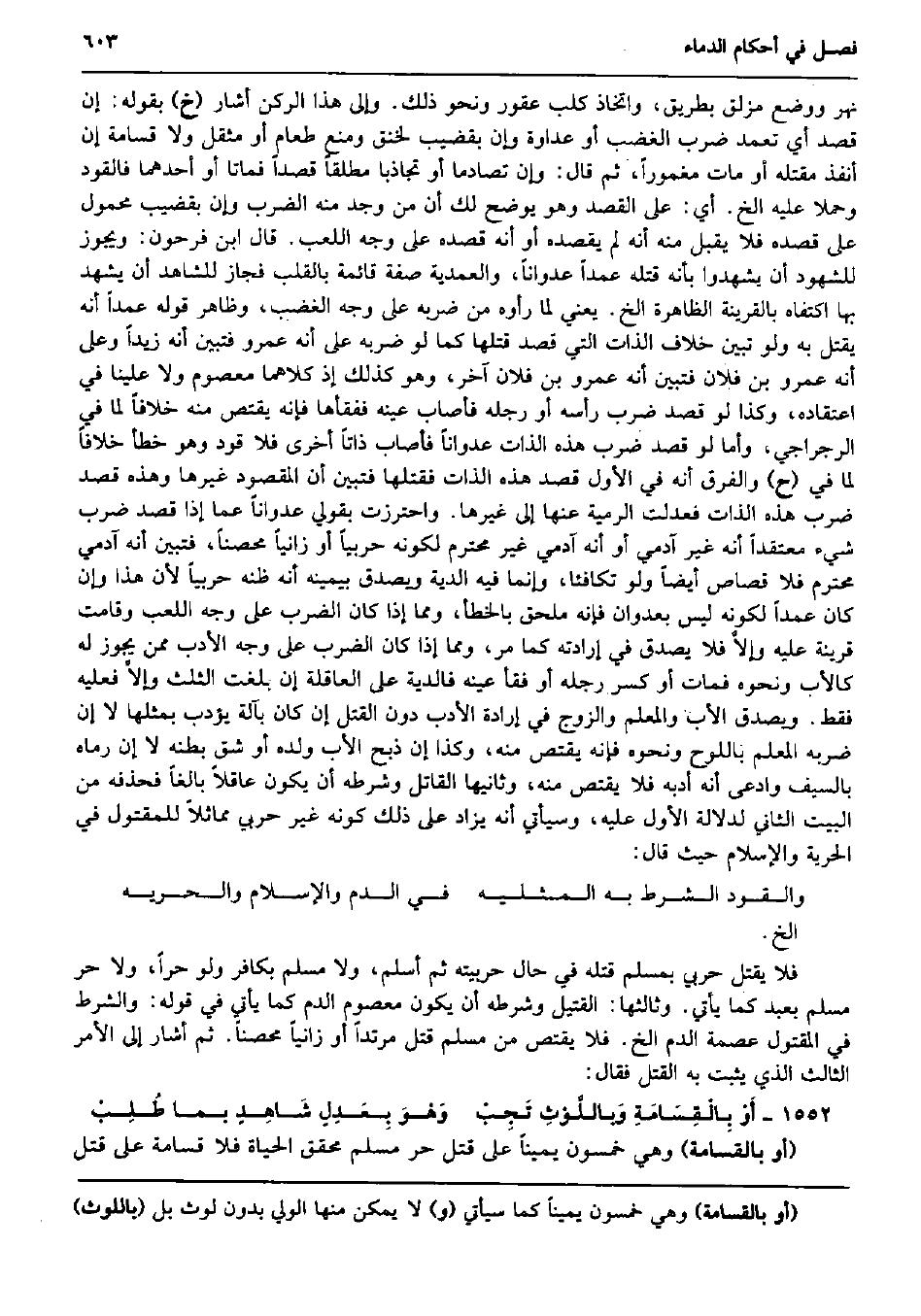 نهر وَوضع مزلق بطرِيق، واتخاذ كلب عقور وَنَحْو ذَلِك. وَإِلَى هَذَا الرُّكْن أَشَارَ (خَ) بقوله: إِن قصد أَي تعمد ضرب الْغَضَب أَو عَدَاوَة وَإِن بقضيب لخنق وَمنع طَعَام أَو مثقل وَلَا قسَامَة إِن أنفذ مَقْتَله أَو مَاتَ مغموراً، ثمَّ قَالَ: وَإِن تصادما أَو تجاذبا مُطلقًا قصدا فماتا أَو أَحدهمَا فالقود وحملا عَلَيْهِ الخ. أَي: على الْقَصْد وَهُوَ يُوضح لَك أَن من وجد مِنْهُ الضَّرْب وَإِن بقضيب مَحْمُول على قَصده فَلَا يقبل مِنْهُ أَنه لم يَقْصِدهُ أَو أَنه قَصده على وَجه اللّعب. قَالَ ابْن فَرِحُونَ: وَيجوز للشُّهُود أَن يشْهدُوا بِأَنَّهُ قَتله عمدا عُدْوانًا، والعمدية صفة قَائِمَة بِالْقَلْبِ فَجَاز للشَّاهِد أَن يشْهد بهَا اكتفاه بِالْقَرِينَةِ الظَّاهِرَة الخ. يَعْنِي لما رَأَوْهُ من ضربه على وَجه الْغَضَب، وَظَاهر قَوْله عمدا أَنه يقتل بِهِ وَلَو تبين خلاف الذَّات الَّتِي قصد قَتلهَا كَمَا لَو ضربه على أَنه عَمْرو فَتبين أَنه زيدا وعَلى أَنه عَمْرو بن فلَان فَتبين أَنه عَمْرو بن فلَان آخر، وَهُوَ كَذَلِك إِذْ كِلَاهُمَا مَعْصُوم وَلَا علينا فِي اعْتِقَاده، وَكَذَا لَو قصد ضرب رَأسه أَو رجله فَأصَاب عينه ففقأها فَإِنَّهُ يقْتَصّ مِنْهُ خلافًا لما فِي الرجراجي، وَأما لَو قصد ضرب هَذِه الذَّات عُدْوانًا فَأصَاب ذاتاً أُخْرَى فَلَا قَود وَهُوَ خطأ خلافًا لما فِي (ح) وَالْفرق أَنه فِي الأول قصد هَذِه الذَّات فَقَتلهَا فَتبين أَن الْمَقْصُود غَيرهَا وَهَذِه قصد ضرب هَذِه الذَّات فعدلت الرَّمية عَنْهَا إِلَى غَيرهَا. واحترزت بِقَوْلِي عُدْوانًا عَمَّا إِذا قصد ضرب شَيْء مُعْتَقدًا أَنه غير آدَمِيّ أَو أَنه آدَمِيّ غير مُحْتَرم لكَونه حَرْبِيّا أَو زَانيا مُحصنا، فَتبين أَنه آدَمِيّ مُحْتَرم فَلَا قصاص أَيْضا وَلَو تكافئا، وَإِنَّمَا فِيهِ الدِّيَة وَيصدق بِيَمِينِهِ أَنه ظَنّه حَرْبِيّا لِأَن هَذَا وَإِن كَانَ عمدا لكَونه لَيْسَ بعدوان فَإِنَّهُ مُلْحق بالْخَطَأ، وَمِمَّا إِذا كَانَ الضَّرْب على وَجه اللّعب وَقَامَت قرينَة عَلَيْهِ وإلاَّ فَلَا يصدق فِي إِرَادَته كَمَا مر، وَمِمَّا إِذا كَانَ الضَّرْب على وَجه الْأَدَب مِمَّن يجوز لَهُ كَالْأَبِ وَنَحْوه فَمَاتَ أَو كسر رجله أَو فَقَأَ عينه فَالدِّيَة على الْعَاقِلَة إِن بلغت الثُّلُث وإلاَّ فَعَلَيهِ فَقَط. وَيصدق الْأَب والمعلم وَالزَّوْج فِي إِرَادَة الْأَدَب دون الْقَتْل إِن كَانَ بِآلَة يُؤَدب بِمِثْلِهَا لَا إِن ضربه الْمعلم باللوح وَنَحْوه فَإِنَّهُ يقْتَصّ مِنْهُ، وَكَذَا إِن ذبح الْأَب وَلَده أَو شقّ بَطْنه لَا إِن رَمَاه بِالسَّيْفِ وَادّعى أَنه أدبه فَلَا يقْتَصّ مِنْهُ، وَثَانِيها الْقَاتِل وَشَرطه أَن يكون عَاقِلا بَالغا فَحَذفهُ من الْبَيْت الثَّانِي لدلَالَة الأول عَلَيْهِ، وَسَيَأْتِي أَنه يُزَاد على ذَلِك كَونه غير حَرْبِيّ مماثلاً للمقتول فِي الْحُرِّيَّة وَالْإِسْلَام حَيْثُ قَالَ: والقود الشَّرْط بِهِ المثليه فِي الدَّم وَالْإِسْلَام والحريه الخ. فَلَا يقتل حَرْبِيّ بِمُسلم قَتله فِي حَال حربيته ثمَّ أسلم، وَلَا مُسلم بِكَافِر وَلَو حرا، وَلَا حر مُسلم بِعَبْد كَمَا يَأْتِي. وَثَالِثهَا: الْقَتِيل وَشَرطه أَن يكون مَعْصُوم الدَّم كَمَا يَأْتِي فِي قَوْله: وَالشّرط فِي الْمَقْتُول عصمَة الدَّم الخ. فَلَا يقْتَصّ من مُسلم قتل مُرْتَدا أَو زَانيا مُحصنا. ثمَّ أَشَارَ إِلَى الْأَمر الثَّالِث الَّذِي يثبت بِهِ الْقَتْل فَقَالَ: أَوْ بِالْقِسَامَةِ وَباللَّوْثِ تَجِبْ وَهْوَ بِعَدِلٍ شَاهِدٍ بِمَا طُلِبْ (أَو بالقسامة) وَهِي خَمْسُونَ يَمِينا على قتل حر مُسلم مُحَقّق الْحَيَاة فَلَا قسَامَة على قتل