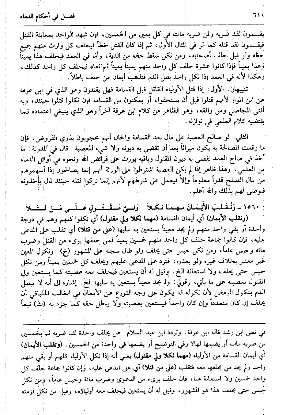 يقسمون لقد ضربه وَلمن ضربه مَاتَ فِي كل يَمِين من الْخمسين، فَإِن شهد الْوَاحِد بمعاينة الْقَتْل فيقسمون لقد قَتله كَمَا مّر فِي الْمِثَال الأول، ثمَّ إِذا كَانَ الْقَتْل خطأ فَيحلف كل وَارِث مِنْهُم جَمِيع حَظه وَلَو قبل حلف أَصْحَابه، وَمن نكل سقط حَظه من الدِّيَة، وأمّا فِي الْعمد فَيحلف هَذَا يَمِينا وَهَذَا يَمِينا فَإِذا كَانُوا عشرَة حلف كل وَاحِد مِنْهُم يَمِينا يَمِينا ثمَّ تُعَاد فَيحلف كل وَاحِد كَذَلِك، وَهَكَذَا لِأَنَّهُ فِي الْعمد إِذا نكل وَاحِد بَطل الدَّم فتذهب أَيْمَان من حلف بَاطِلا. تَنْبِيهَانِ. الأول: إِذا قتل الْأَوْلِيَاء الْقَاتِل قبل الْقسَامَة فَهَل يقتلُون وَهُوَ الَّذِي فِي ابْن عَرَفَة عَن ابْن الْمَوَّاز لأَنهم قتلوا قبل أَن يستحقوا، أَو يمكنون من الْقسَامَة فَإِن نكلوا قتلوا حِينَئِذٍ، وَبِه أفتى المجاصي وَمن وَافقه، وَهُوَ الظَّاهِر من كَلَام ابْن عَرَفَة آخرا وَهُوَ الَّذِي يَنْبَغِي اعْتِمَاده كَمَا يَقْتَضِيهِ كَلَام العلمي فِي نوازله. الثَّانِي: لَو صَالح الْعصبَة على مَال بعد الْقسَامَة وَالْحَال أَنهم محجوبون بذوي الْفُرُوض، فَإِن مَا وَقعت الْمُصَالحَة بِهِ يكون مِيرَاثا بعد أَن تقضى بِهِ دُيُونه وَلَا شَيْء للْعصبَةِ. قَالَ فِي الْمُدَوَّنَة: مَا أَخذ فِي صلح الْعمد تقضى بِهِ دُيُون الْمَقْتُول وَبَاقِيه يُورث على فَرَائض الله وَنَحْوه فِي أَوَائِل الدِّمَاء من العلمي، وَهَذَا ظَاهر إِذا لم يكن الْعصبَة اشترطوا على الْوَرَثَة أَنهم إِنَّمَا يصالحون إِذا أسهموهم من مَال الصُّلْح قدرا مَعْلُوما وإلاَّ فَيعْمل على شرطهم لأَنهم إِنَّمَا تركُوا قَتله حِينَئِذٍ لمَال يأخذونه فيوصى لَهُم بذلك وَالله أعلم. وَتُقْلَبُ الأَيْمَانُ مهما نَكَلاَ وَليُّ مَقْتُولٍ عَلَى مَنْ قَتَلاَ (وتقلب الْأَيْمَان) أَي أَيْمَان الْقسَامَة (مهما نكلا ولي مقتول) أَي نكلوا كلهم وهم فِي دَرَجَة وأحدة أَو بَقِي وَاحِد مِنْهُم وَلم يجد معينا يَسْتَعِين بِهِ عَلَيْهَا (على من قتلا) أَي تقلب على الْمُدعى عَلَيْهِ، فَإِن كَانُوا جمَاعَة حلف كل وَاحِد مِنْهُم خمسين يَمِينا فَمن حَلفهَا برىء من الْقَتْل وَضرب مائَة وَحبس عَاما، وَمن نكل حبس حَتَّى يحلف وَلَو طَال سجنه على الْمَشْهُور (خَ) : ونكول الْمعِين غير مُعْتَبر بِخِلَاف غَيره وَلَو بعدوا، فَترد على الْمُدعى عَلَيْهِم وَيحلف كل خمسين يَمِينا وَمن نكل حبس حَتَّى يحلف وَلَا استعانة الخ. وَقيل لَهُ أَن يَسْتَعِين فَيحلف مَعَه عصبته كَمَا يَسْتَعِين ولي الْمَقْتُول بعصبته على مَا يَأْتِي، وَقَوْلِي: وَلم يجد معينا يَسْتَعِين بِهِ عَلَيْهَا الخ. إِشَارَة إِلَى أَنه لَا يبطل الدَّم بنكول الْبَعْض لِأَن نُكُوله قد يكون على وَجه التورع عَن الْأَيْمَان فِي الْغَالِب فللباقي أَن يحلف إِن كَانَ مُتَعَددًا وَإِن كَانَ وَاحِدًا فيستعين بعصبته وَلَا يبطل حَقه كَمَا جزم بِهِ (ت) تبعا