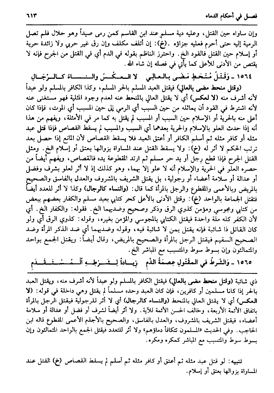 وَإِن ساواه حِين الْقَتْل، وَعَلِيهِ دِيَة مُسلم عِنْد ابْن الْقَاسِم كمن رمى صيدا وَهُوَ حَلَال فَلم تصل الرَّمية إِلَيْهِ حَتَّى أحرم فَعَلَيهِ جَزَاؤُهُ. (خَ) : إِن أتلف مُكَلّف وَإِن رق غير حَرْبِيّ وَلَا زَائِدَة حريَّة أَو إِسْلَام حِين الْقَتْل فالقود الخ. وَاحْترز النَّاظِم بقوله فِي الدَّم أَي فِي الْقَتْل من الْجرْح فَإِنَّهُ لَا يقْتَصّ من الْأَدْنَى للأعلى كَمَا يَأْتِي فِي فَصله إِن شَاءَ الله. وَقَتْلُ مُنْحَطٍ مَضَى بالعالِي لَا العكْسُ والنساءُ كالرِّجَالِ (وَقتل منحط مضى بالعالي) فَيقْتل العَبْد الْمُسلم بِالْحرِّ الْمُسلم، وَكَذَا الْكَافِر بِالْمُسلمِ وَلَو عبدا لِأَنَّهُ أشرف مِنْهُ (لَا لعكس) أَي لَا يقتل العالي بالمنحط عَنهُ لعدم وجود المثلية فَهُوَ مُسْتَغْنى عَنهُ لِأَنَّهُ اشْترط فِي الْقود أَن يماثله من حِين السَّبَب أَي الرَّمْي إِلَى حِين الْمُسَبّب أَي الْمَوْت، فَإِذا كَانَ أَعلَى مِنْهُ بِالْحُرِّيَّةِ أَو الْإِسْلَام حِين السَّبَب أَو الْمُسَبّب لم يقتل بِهِ كَمَا مر فِي الْأَمْثِلَة، وَيفهم من هَذَا أَنه إِذا حدث الْعُلُوّ بِالْإِسْلَامِ وَالْحريَّة بعدهمَا أَي السَّبَب والمسبب لم يسْقط الْقصاص فَإِذا قتل عبد مثله أَو كَافِر مثله ثمَّ أسلم الْكَافِر أَو أعتق العَبْد فَلَا يسْقط الْقصاص لِأَن الْمَانِع إِذا حصل بعد ترَتّب الحكم لَا أثر لَهُ (خَ) : وَلَا يسْقط الْقَتْل عِنْد الْمُسَاوَاة بزوالها بِعِتْق أَو إِسْلَام الخ. وَمثل الْقَتْل الْجرْح فَإِذا قطع رِجل أَو يَد حر مُسلم ثمَّ ارْتَدَّ المقطوعة يَده فالقصاص، وَيفهم أَيْضا من حصره الْعُلُوّ فِي الْحُرِّيَّة وَالْإِسْلَام أَنه لَا علو إِلَّا بهما، وَهُوَ كَذَلِك إِذْ لَا أثر لعلو بشرف وَفضل أَو عَدَالَة أَو سَلامَة أَعْضَاء أَو رجولية، بل يقتل الشريف بالمشروف وَالْعدْل بالفاسق وَالصَّحِيح بالمريض وبالأعمى والمقطوع وَالرجل بِالْمَرْأَةِ كَمَا قَالَ: (وَالنِّسَاء كالرجال) وَكَذَا لَا أثر للعدد أَيْضا فَتقْتل الْجَمَاعَة بِالْوَاحِدِ (خَ) : وَقتل الْأَدْنَى بالأعلى كحر كتابي بِعَبْد مُسلم وَالْكفَّار بَعضهم بِبَعْض من كتابي ومجوسي وَمُؤمن كذوي الرّقّ وَذكر وصحيح وضديهما الخ. فَقَوله: وَالْكفَّار الخ. أَي لِأَن الْكفْر كُله مِلَّة وَاحِدَة فَيقْتل الْكِتَابِيّ بالمجوسي وَالْمُؤمن بِغَيْرِهِ، وَقَوله: كذوي الرّقّ أَي وَلَو كَانَ الْقَاتِل ذَا شَائِبَة فَإِنَّهُ يقتل بِمن لَا شَائِبَة فِيهِ، وَقَوله وضديهما أَي ضد الذّكر الْمَرْأَة وضد الصَّحِيح السقيم فَيقْتل الرجل بِالْمَرْأَةِ وَالصَّحِيح بالمريض، وَقَالَ أَيْضا: وَيقتل الْجمع بِوَاحِد والمتمالئون وَإِن بِسَوْط سَوط والمتسبب مَعَ الْمُبَاشر الخ. وَالشّرطُ فِي المقْتُولِ عِصمَةُ الدَّمِ زِيادةٌ لِشَرْطِهِ الْمُسْتَقْدَمِ