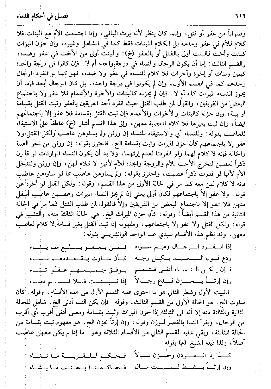 ودع قَول الْبعيد بِكُل وَجه كَأَن ساوت بقعددهم نسَاء فَإِن يكن النِّسَاء أدنى فتمم بوفق جَمِيعهم عفوا تشَاء وَإِن إِرْثا يحزن فدع رجَالًا إِذا ثبتَتْ فَلَا قسم دِمَاء فالبيت الأول وَشطر الثَّانِي هُوَ مَا احتوى عَلَيْهِ الْقسم الأول من هَذِه الْأَقْسَام، وَقَوله: كَأَن ساوت الخ. هُوَ الْحَالة الأولى من الْقسم الثَّالِث. وَقَوله: فَإِن يكن النسا أدنى الخ. شَامِل للحالة الثَّانِيَة وَالثَّالِثَة مِنْهُ إِلَّا أَنه فِي الثَّالِثَة إِذا حزن الْمِيرَاث وَثَبت بقسامة وَمعنى أدنى أقرب أَي أقرب من الرِّجَال، وَيقْرَأ النسا بِالْقصرِ للوزن وَقَوله: وَإِن إِرْثا يحزن الخ. هُوَ مَفْهُوم ثَبت بقسامة من الْحَالة الثَّالِثَة، وَبَقِي عَلَيْهِ الْقسم الثَّانِي من الْأَقْسَام الثَّلَاثَة وَهُوَ: مَا إِذا لم يكن مَعَهُنَّ عاصب أصلا، وَلذَا ذيله الشَّيْخ (م) بقوله: كَذَا إِذا انفردن وحزن مَالا فَحكم للقريبة مَا تشَاء وَإِن إِرْثا يشط لبيت مَال فحاكمنا يجنب مَا يَشَاء