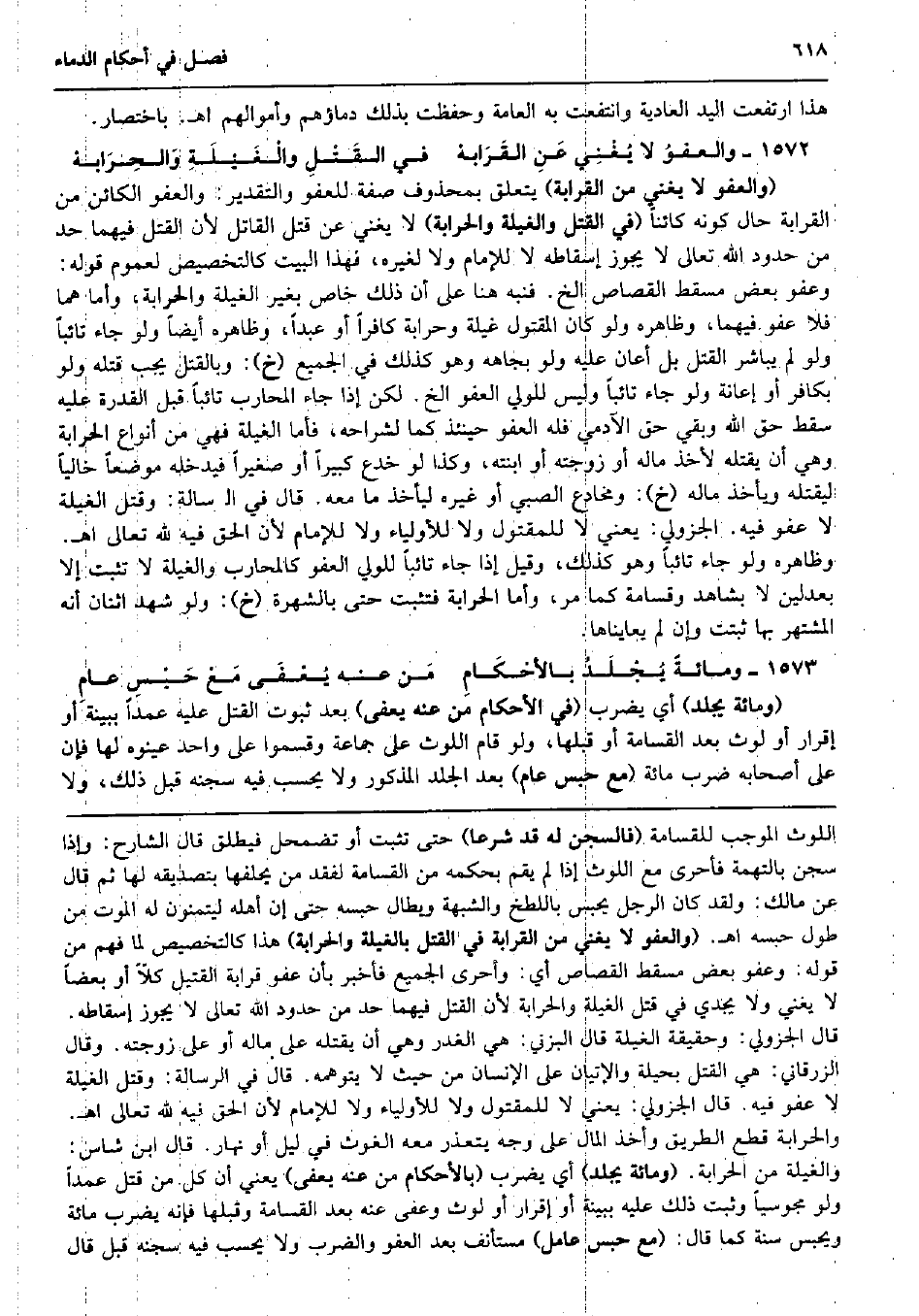 هَذَا ارْتَفَعت الْيَد العادية وانتفعت بِهِ الْعَامَّة وحفظت بذلك دِمَاؤُهُمْ وَأَمْوَالهمْ اه. بِاخْتِصَار. والعفوُ لَا يُغْنِي عَنِ القَرَابهْ فِي القَتْلِ والْغَيْلَةِ وَالحِرَابهْ (وَالْعَفو لَا يُغني من الْقَرَابَة) يتَعَلَّق بِمَحْذُوف صفة للعفو وَالتَّقْدِير: وَالْعَفو الْكَائِن من الْقَرَابَة حَال كَونه كَائِنا (فِي الْقَتْل والغيلة والحرابة) لَا يُغني عَن قتل الْقَاتِل لِأَن الْقَتْل فيهمَا حد من حُدُود الله تَعَالَى لَا يجوز إِسْقَاطه لَا للْإِمَام وَلَا لغيره، فَهَذَا الْبَيْت كالتخصيص لعُمُوم قَوْله: وعفو بعض مسْقط الْقصاص الخ. فنبه هُنَا على أَن ذَلِك خَاص بِغَيْر الغيلة والحرابة، وَأما هما فَلَا عَفْو فيهمَا، وَظَاهره وَلَو كَانَ الْمَقْتُول غيلَة وحرابة كَافِرًا أَو عبدا، وَظَاهره أَيْضا وَلَو جَاءَ تَائِبًا وَلَو لم يُبَاشر الْقَتْل بل أعَان عَلَيْهِ وَلَو بجاهه وَهُوَ كَذَلِك فِي الْجَمِيع (خَ) : وبالقتل يجب قَتله وَلَو بِكَافِر أَو إِعَانَة وَلَو جَاءَ تَائِبًا وَلَيْسَ للْوَلِيّ الْعَفو الخ. لَكِن إِذا جَاءَ الْمُحَارب تَائِبًا قبل الْقُدْرَة عَلَيْهِ سقط حق الله وَبَقِي حق الْآدَمِيّ فَلهُ الْعَفو حِينَئِذٍ كَمَا لشراحه فَأَما الغيلة فَهِيَ من أَنْوَاع الْحِرَابَة وَهِي أَن يقْتله لأخذ مَاله أَو زَوجته أَو ابْنَته، وَكَذَا لَو خدع كَبِيرا أَو صَغِيرا فيدخله موضعا خَالِيا ليَقْتُلهُ وَيَأْخُذ مَاله (خَ) : ومخادع الصَّبِي أَو غَيره ليَأْخُذ مَا مَعَه. قَالَ فِي الرسَالَة: وَقتل الغيلة لَا عَفْو فِيهِ. الْجُزُولِيّ: يَعْنِي لَا للمقتول وَلَا للأولياء وَلَا للْإِمَام لِأَن الْحق فِيهِ لله تَعَالَى اه. وَظَاهره وَلَو جَاءَ تَائِبًا وَهُوَ كَذَلِك، وَقيل إِذا جَاءَ تَائِبًا للْوَلِيّ الْعَفو كالمحارب والغيلة لَا تثبت إِلَّا بعدلين لَا بِشَاهِد وقسامة كَمَا مر، وَأما الْحِرَابَة فَتثبت حَتَّى بالشهرة (خَ) : وَلَو شهد اثْنَان أَنه المشتهر بهَا ثبتَتْ وَإِن لم يعايناها. وَمِائَة يُجْلَدُ بالأحْكَامِ مَن عَنهُ يُعْفَى مَعْ حَبْسِ عامِ (وَمِائَة يجلد) أَي يضْرب (فِي الْأَحْكَام من عَنهُ يُعْفَى) بعد ثُبُوت الْقَتْل عَلَيْهِ عمدا بِبَيِّنَة أَو إِقْرَار أَو لوث بعد الْقسَامَة أَو قبلهَا، وَلَو قَامَ اللوث على جمَاعَة وقسموا على وَاحِد عينوه لَهَا فَإِن على أَصْحَابه ضرب مائَة (مَعَ حبس عَام) بعد الْجلد الْمَذْكُور وَلَا يحْسب فِيهِ سجنه قبل ذَلِك، وَلَا