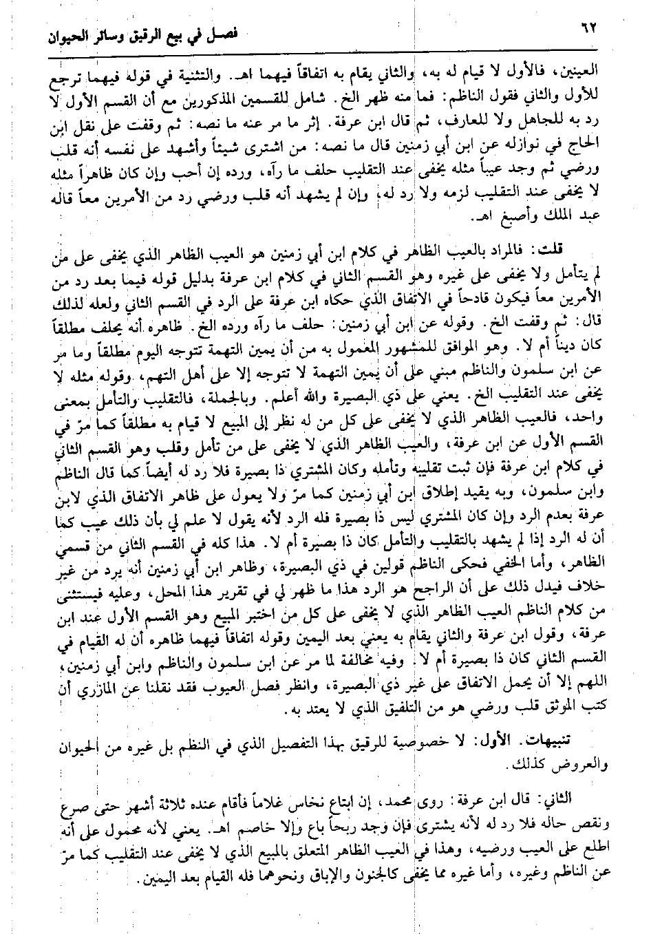 الْعَينَيْنِ، فَالْأول لَا قيام لَهُ بِهِ وَالثَّانِي يُقَام بِهِ اتِّفَاقًا فيهمَا اه. والتثنية فِي قَوْله فيهمَا ترجع للْأولِ وَالثَّانِي فَقَوْل النَّاظِم: فَمَا مِنْهُ ظهر الخ. شَامِل للقسمين الْمَذْكُورين مَعَ أَن الْقسم الأول لَا رد بِهِ للجاهل وَلَا للعارف، ثمَّ قَالَ ابْن عَرَفَة. إِثْر مَا مر عَنهُ مَا نَصه: ثمَّ وقفت على نقل ابْن الْحَاج فِي نوازله عَن ابْن أبي زمنين قَالَ مَا نَصه: من اشْترى شَيْئا وَأشْهد على نَفسه أَنه قلب وَرَضي ثمَّ وجد عَيْبا مثله يخفى عِنْد التقليب حلف مَا رَآهُ، ورده إِن أحب وَإِن كَانَ ظَاهرا مثله لَا يخفى عِنْد التقليب لزمَه وَلَا رد لَهُ، وَإِن لم يشْهد أَنه قلب وَرَضي رد من الْأَمريْنِ مَعًا قَالَه عبد الْملك وَأصبغ اه. قلت: فَالْمُرَاد بِالْعَيْبِ الظَّاهِر فِي كَلَام ابْن أبي زمنين هُوَ الْعَيْب الظَّاهِر الَّذِي يخفى على من لم يتَأَمَّل وَلَا يخفى على غَيره وَهُوَ الْقسم الثَّانِي فِي كَلَام ابْن عَرَفَة بِدَلِيل قَوْله فِيمَا بعد رد من الْأَمريْنِ مَعًا فَيكون قادحاً فِي الِاتِّفَاق الَّذِي حَكَاهُ ابْن عَرَفَة على الرَّد فِي الْقسم الثَّانِي وَلَعَلَّه لذَلِك قَالَ: ثمَّ وقفت الخ. وَقَوله عَن ابْن أبي زمنين: حلف مَا رَآهُ ورده الخ. ظَاهره أَنه يحلف مُطلقًا كَانَ دينا أم لَا. وَهُوَ الْمُوَافق للمشهور الْمَعْمُول بِهِ من أَن يَمِين التُّهْمَة تتَوَجَّه الْيَوْم مُطلقًا وَمَا مر عَن ابْن سَلمُون والناظم مَبْنِيّ على أَن يَمِين التُّهْمَة لَا تتَوَجَّه إِلَّا على أهل التهم، وَقَوله مثله لَا يخفى عِنْد التقليب الخ. يَعْنِي على ذِي البصيرة وَالله أعلم. وَبِالْجُمْلَةِ، فالتقليب والتأمل بِمَعْنى وَاحِد، فالعيب الظَّاهِر الَّذِي لَا يخفى على كل من لَهُ نظر إِلَى الْمَبِيع لَا قيام بِهِ مُطلقًا كَمَا مرّ فِي الْقسم الأول عَن ابْن عَرَفَة، وَالْعَيْب الظَّاهِر الَّذِي لَا يخفى على من تَأمل وقلب وَهُوَ الْقسم الثَّانِي فِي كَلَام ابْن عَرَفَة فَإِن ثَبت تقليبه وتأمله وَكَانَ المُشْتَرِي ذَا بَصِيرَة فَلَا رد لَهُ أَيْضا كَمَا قَالَ النَّاظِم وَابْن سَلمُون، وَبِه يُقيد إِطْلَاق ابْن أبي زمنين كَمَا مرّ وَلَا يعول على ظَاهر الِاتِّفَاق الَّذِي لِابْنِ عَرَفَة بِعَدَمِ الرَّد وَإِن كَانَ المُشْتَرِي لَيْسَ ذَا بَصِيرَة فَلهُ الرَّد لِأَنَّهُ يَقُول لَا علم لي بِأَن ذَلِك عيب كَمَا أَن لَهُ الرَّد إِذا لم يشْهد بالتقليب والتأمل كَانَ ذَا بَصِيرَة أم لَا. هَذَا كُله فِي الْقسم الثَّانِي من قسمي الظَّاهِر، وَأما الْخَفي فَحكى النَّاظِم قَوْلَيْنِ فِي ذِي البصيرة، وَظَاهر ابْن أبي زمنين أَنه يرد من غير خلاف فَيدل ذَلِك على أَن الرَّاجِح هُوَ الرَّد هَذَا مَا ظهر لي فِي تَقْرِير هَذَا الْمحل، وَعَلِيهِ فيستثنى من كَلَام النَّاظِم الْعَيْب الظَّاهِر الَّذِي لَا يخفى على كل من اختبر الْمَبِيع وَهُوَ الْقسم الأول عِنْد ابْن عَرَفَة، وَقَول ابْن عَرَفَة وَالثَّانِي يُقَام بِهِ يَعْنِي بعد الْيَمين وَقَوله اتِّفَاقًا فيهمَا ظَاهره أَن لَهُ الْقيام فِي الْقسم الثَّانِي كَانَ ذَا بَصِيرَة أم لَا. وَفِيه مُخَالفَة لما مر عَن ابْن سَلمُون والناظم وَابْن أبي زمنين، اللَّهُمَّ إِلَّا أَن يحمل الِاتِّفَاق على غير ذِي البصيرة، وَانْظُر فصل الْعُيُوب فقد نقلنا عَن الْمَازرِيّ أَن كتب الموثق قلب وَرَضي هُوَ من التلفيق الَّذِي لَا يعْتد بِهِ. تَنْبِيهَات. الأول: لَا خُصُوصِيَّة للرقيق بِهَذَا التَّفْصِيل الَّذِي فِي النّظم بل غَيره من الْحَيَوَان وَالْعرُوض كَذَلِك. الثَّانِي: قَالَ ابْن عَرَفَة: روى مُحَمَّد، إِن ابْتَاعَ نخاس غُلَاما فَأَقَامَ عِنْده ثَلَاثَة أشهر حَتَّى صرع وَنقص حَاله فَلَا رد لَهُ لِأَنَّهُ يشترى فَإِن وجد ربحا بَاعَ وَإِلَّا خَاصم اه. يَعْنِي لِأَنَّهُ مَحْمُول على أَنه اطلع ع