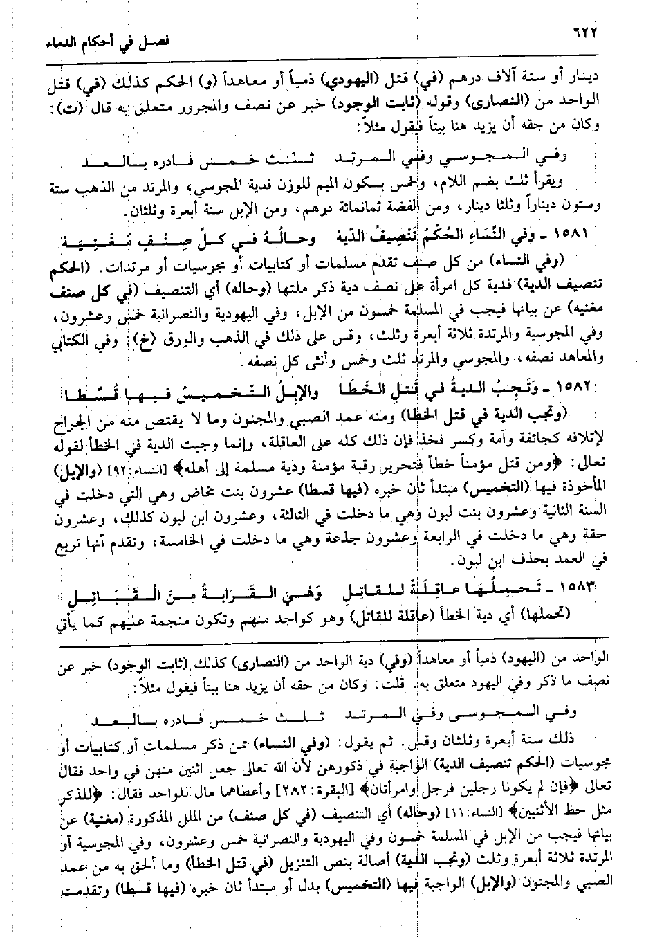 دِينَار أَو سِتَّة آلَاف دِرْهَم (فِي) قتل (الْيَهُودِيّ) ذِمِّيا أَو معاهداً (و) الحكم كَذَلِك (فِي) قتل الْوَاحِد من (النَّصَارَى) وَقَوله (ثَابت الْوُجُود) خبر عَن نصف وَالْمَجْرُور مُتَعَلق بِهِ قَالَ (ت) : وَكَانَ من حَقه أَن يزِيد هُنَا بَيْتا فَيَقُول مثلا: وَفِي الْمَجُوسِيّ وَفِي الْمُرْتَد ثلث خمس فادره بالعد وَيقْرَأ ثلث بِضَم اللَّام، وَخمْس بِسُكُون الْمِيم للوزن فديَة الْمَجُوسِيّ، وَالْمُرْتَدّ من الذَّهَب سِتَّة وَسِتُّونَ دِينَارا وَثلثا دِينَار، وَمن الْفضة ثَمَانمِائَة دِرْهَم، وَمن الْإِبِل سِتَّة أَبْعِرَة وَثُلُثَانِ. وَفِي النِّسَاءِ الحُكْمُ تَنْصِيفُ الدّيهْ وحالُهُ فِي كلِّ صِنْفٍ مُغْنِيَهْ (وَفِي النِّسَاء) من كل صنف تقدم مسلمات أَو كتابيات أَو مجوسيات أَو مرتدات. (الحكم تنصيف الدِّيَة) فديَة كل امْرَأَة على نصف دِيَة ذكر ملتها (وحاله) أَي التنصيف (فِي كل صنف مغنيه) عَن بَيَانهَا فَيجب فِي الْمسلمَة خَمْسُونَ من الْإِبِل، وَفِي الْيَهُودِيَّة والنصرانية خمس وَعِشْرُونَ، وَفِي الْمَجُوسِيَّة والمرتدة ثَلَاثَة أَبْعِرَة وَثلث، وَقس على ذَلِك فِي الذَّهَب وَالْوَرق (خَ) : وَفِي الْكِتَابِيّ والمعاهد نصفه، والمجوسي وَالْمُرْتَدّ ثلث وَخمْس وَأُنْثَى كل نصفه. وَتَجِبُ الديةُ فِي قَتلِ الخَطَا والإبِلُ التّخميسُ فِيهَا قُسِّطا (وَتجب الدِّيَة فِي قتل الخطا) وَمِنْه عمد الصَّبِي وَالْمَجْنُون وَمَا لَا يقْتَصّ مِنْهُ من الْجراح لإتلافه كجائفة وآمة وَكسر فَخذ فَإِن ذَلِك كُله على الْعَاقِلَة، وَإِنَّمَا وَجَبت الدِّيَة فِي الْخَطَأ لقَوْله تَعَالَى: وَمن قتل مُؤمنا خطأ فَتَحْرِير رَقَبَة مُؤمنَة ودية مسلمة إِلَى أَهله} (النِّسَاء: 92) (وَالْإِبِل) الْمَأْخُوذَة فِيهَا (التخميس) مُبْتَدأ ثَان خَبره (فِيهَا قسطا) عشرُون بنت مَخَاض وَهِي الَّتِي دخلت فِي السّنة الثَّانِيَة وَعِشْرُونَ بنت لبون وَهِي مَا دخلت فِي الثَّالِثَة، وَعِشْرُونَ ابْن لبون كَذَلِك، وَعِشْرُونَ حقة وَهِي مَا دخلت فِي الرَّابِعَة وَعِشْرُونَ جَذَعَة وَهِي مَا دخلت فِي الْخَامِسَة، وَتقدم أَنَّهَا تربع فِي الْعمد بِحَذْف ابْن لبون. تَحمِلُهَا عاقِلَةٌ للقاتِلِ وَهْيَ القَرَابةُ مِنَ الْقَبَائِلِ (تحملهَا) أَي دِيَة الْخَطَأ (عَاقِلَة للْقَاتِل) وَهُوَ كواحد مِنْهُم وَتَكون منجمة عَلَيْهِم كَمَا يَأْتِي