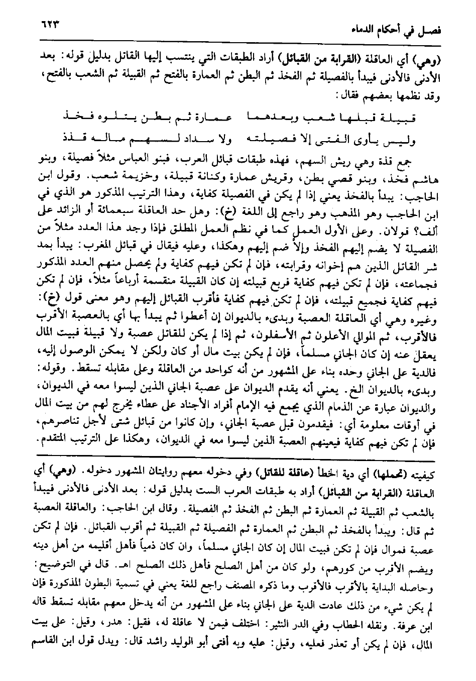 (وَهِي) أَي الْعَاقِلَة (الْقَرَابَة من الْقَبَائِل) أَرَادَ الطَّبَقَات الَّتِي ينتسب إِلَيْهَا الْقَاتِل بِدَلِيل قَوْله: بعد الْأَدْنَى فالأدنى فَيبْدَأ بالفصيلة ثمَّ الْفَخْذ ثمَّ الْبَطن ثمَّ الْعِمَارَة بِالْفَتْح ثمَّ الْقَبِيلَة ثمَّ الشّعب بِالْفَتْح، وَقد نظمها بَعضهم فَقَالَ: قَبيلَة قبلهَا شعب وبعدهما عمَارَة ثمَّ بطن يتلوه فَخذ وَلَيْسَ يأوى الْفَتى إِلَّا فصيلته وَلَا سداد لسهم مَاله قذذ جمع قُذَّة وَهِي ريش السهْم، فَهَذِهِ طَبَقَات قبائل الْعَرَب، فبنو الْعَبَّاس مثلا فصيلة، وَبَنُو هَاشم فَخذ، وَبَنُو قصي بطن، وقريش عمَارَة وكنانة قَبيلَة، وَخُزَيْمَة شعب. وَقَول ابْن الْحَاجِب: يبْدَأ بالفخذ يَعْنِي إِذا لم يكن فِي الفصيلة كِفَايَة، وَهَذَا التَّرْتِيب الْمَذْكُور هُوَ الَّذِي فِي ابْن الْحَاجِب وَهُوَ الْمَذْهَب وَهُوَ رَاجع إِلَى اللُّغَة (خَ) : وَهل حد الْعَاقِلَة سَبْعمِائة أَو الزَّائِد على ألف؟ قَولَانِ. وعَلى الأول الْعَمَل كَمَا فِي نظم الْعَمَل الْمُطلق فَإِذا وجد هَذَا الْعدَد مثلا من الفصيلة لَا يضم إِلَيْهِم الْفَخْذ وإلاَّ ضم إِلَيْهِم وَهَكَذَا، وَعَلِيهِ فَيُقَال فِي قبائل الْمغرب: يبْدَأ بِمد شَرّ الْقَاتِل الَّذين هم إخوانه وقرابته، فَإِن لم تكن فيهم كِفَايَة وَلم يحصل مِنْهُم الْعدَد الْمَذْكُور فجماعته، فَإِن لم تكن فيهم كِفَايَة فربع قبيلته إِن كَانَ الْقَبِيلَة منقسمة أَربَاعًا مثلا، فَإِن لم تكن فيهم كِفَايَة فَجَمِيع قبيلته، فَإِن لم تكن فيهم كِفَايَة فأقرب الْقَبَائِل إِلَيْهِم وَهُوَ معنى قَول (خَ) : وَغَيره وَهِي أَي الْعَاقِلَة الْعصبَة وبدىء بالديوان إِن أعْطوا ثمَّ يبْدَأ بهَا أَي بالعصبة الْأَقْرَب فَالْأَقْرَب، ثمَّ الموَالِي الأعلون ثمَّ الأسفلون، ثمَّ إِذا لم يكن للْقَاتِل عصبَة وَلَا قَبيلَة فبيت المَال يعقل عَنهُ إِن كَانَ الْجَانِي مُسلما، فَإِن لم يكن بَيت مَال أَو كَانَ وَلَكِن لَا يُمكن الْوُصُول إِلَيْهِ، فَالدِّيَة على الْجَانِي وَحده بِنَاء على الْمَشْهُور من أَنه كواحد من الْعَاقِلَة وعَلى مُقَابِله تسْقط. وَقَوله: وبدىء بالديوان الخ. يَعْنِي أَنه يقدم الدِّيوَان على عصبَة الْجَانِي الَّذين لَيْسُوا مَعَه فِي الدِّيوَان، والديوان عبارَة عَن الذمام الَّذِي يجمع فِيهِ الإِمَام أَفْرَاد الأجناد على عَطاء يخرج لَهُم من بَيت المَال فِي أَوْقَات مَعْلُومَة أَي: فيقدمون قبل عصبَة الْجَانِي، وَإِن كَانُوا من قبائل شَتَّى لأجل تناصرهم، فَإِن لم تكن فيهم كِفَايَة فيعينهم الْعصبَة الَّذين لَيْسُوا مَعَه فِي الدِّيوَان، وَهَكَذَا على التَّرْتِيب الْمُتَقَدّم.