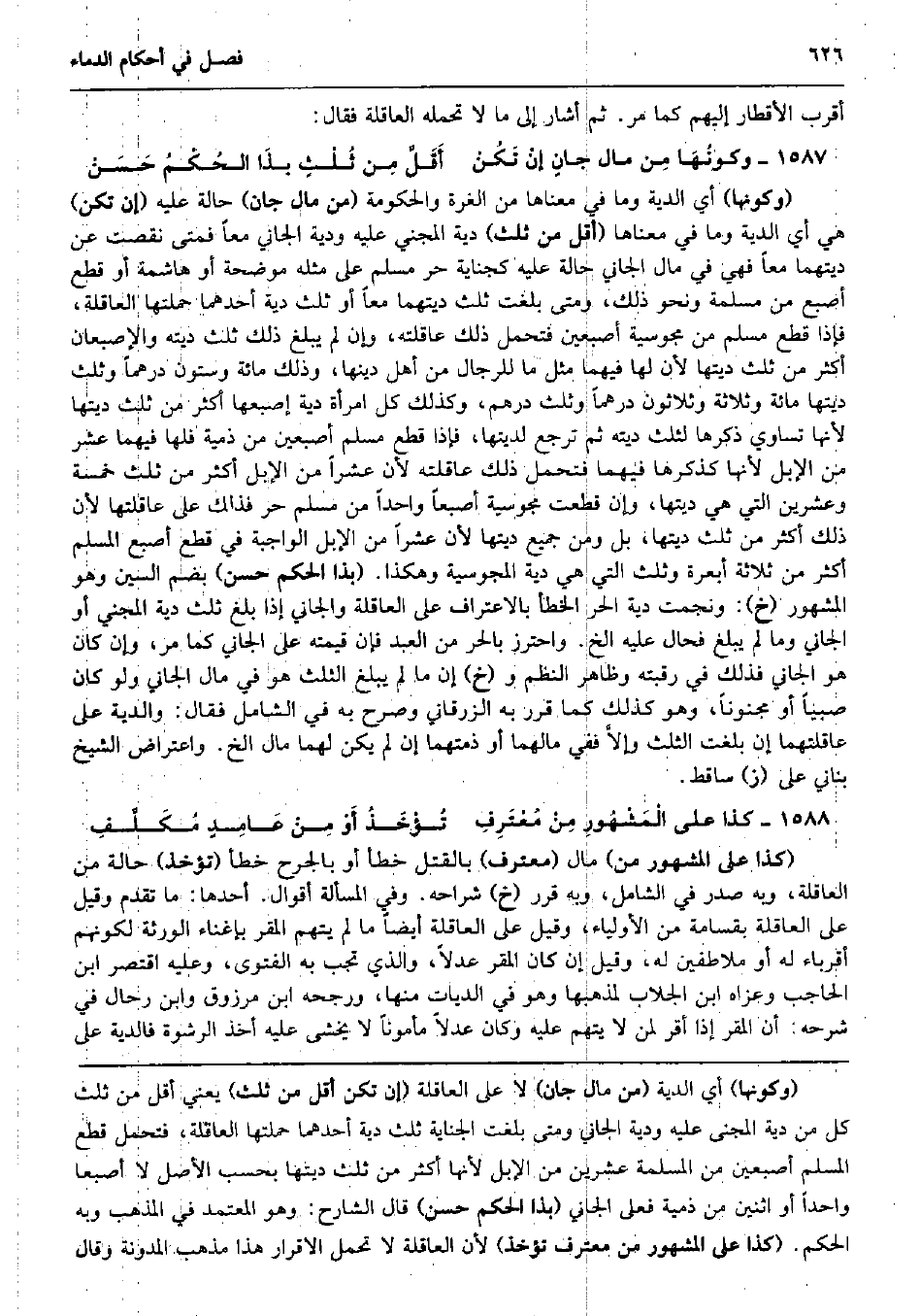 أقرب الأقطار إِلَيْهِم كَمَا مر. ثمَّ أَشَارَ إِلَى مَا لَا تحمله الْعَاقِلَة فَقَالَ: وكونُهَا مِن مَال جانٍ إنْ تَكُنْ أَقَلَّ مِن ثُلْثٍ بذَا الحُكْمُ حَسَنْ (وَكَونهَا) أَي الدِّيَة وَمَا فِي مَعْنَاهَا من الْغرَّة والحكومة (من مَال جَان) حَالَة عَلَيْهِ (إِن تكن) هِيَ أَي الدِّيَة وَمَا فِي مَعْنَاهَا (أقل من ثلث) دِيَة الْمَجْنِي عَلَيْهِ ودية الْجَانِي مَعًا فَمَتَى نقصت عَن دِيَتهمَا مَعًا فَهِيَ فِي مَال الْجَانِي حَالَة عَلَيْهِ كجناية حر مُسلم على مثله مُوضحَة أَو هاشمة أَو قطع أصْبع من مسلمة وَنَحْو ذَلِك، وَمَتى بلغت ثلث دِيَتهمَا مَعًا أَو ثلث دِيَة أَحدهمَا حملتها الْعَاقِلَة، فَإِذا قطع مُسلم من مَجُوسِيَّة أصبعين فَتحمل ذَلِك عَاقِلَته، وَإِن لم يبلغ ذَلِك ثلث دِيَته والإصبعان أَكثر من ثلث دِيَتهَا لِأَن لَهَا فيهمَا مثل مَا للرِّجَال من أهل دينهَا، وَذَلِكَ مائَة وَسِتُّونَ درهما وَثلث دِيَتهَا مائَة وَثَلَاثَة وَثَلَاثُونَ درهما وَثلث دِرْهَم، وَكَذَلِكَ كل امْرَأَة دِيَة إصبعها أَكثر من ثلث دِيَتهَا لِأَنَّهَا تَسَاوِي ذكرهَا لثلث دِيَته ثمَّ ترجع لديتها، فَإِذا قطع مُسلم أصبعين من ذِمِّيَّة فلهَا فيهمَا عشر من الْإِبِل لِأَنَّهَا كذكرها فيهمَا فَتحمل ذَلِك عَاقِلَته لِأَن عشرا من الْإِبِل أَكثر من ثلث خَمْسَة وَعشْرين الَّتِي هِيَ دِيَتهَا، وَإِن قطعت مَجُوسِيَّة أصبعاً وَاحِدًا من مُسلم حر فَذَلِك على عاقلتها لِأَن ذَلِك أَكثر من ثلث دِيَتهَا بل وَمن جَمِيع دِيَتهَا لِأَن عشرا من الْإِبِل الْوَاجِبَة فِي قطع أصْبع الْمُسلم أَكثر من ثَلَاثَة أَبْعِرَة وَثلث الَّتِي هِيَ دِيَة الْمَجُوسِيَّة وَهَكَذَا. (بذا الحكم حسن) بِضَم السِّين وَهُوَ الْمَشْهُور (خَ) : ونجمت دِيَة الْحر الْخَطَأ بالاعتراف على الْعَاقِلَة والجاني إِذا بلغ ثلث دِيَة الْمَجْنِي أَو الْجَانِي وَمَا لم يبلغ فحال عَلَيْهِ الخ. وَاحْترز بِالْحرِّ من العَبْد فَإِن قِيمَته على الْجَانِي كَمَا مر، وَإِن كَانَ هُوَ الْجَانِي فَذَلِك فِي رقبته وَظَاهر النّظم و (خَ) إِن مَا لم يبلغ الثُّلُث هُوَ فِي مَال الْجَانِي وَلَو كَانَ صَبيا أَو مَجْنُونا، وَهُوَ كَذَلِك كَمَا قرر بِهِ الزّرْقَانِيّ وَصرح بِهِ فِي الشَّامِل فَقَالَ: وَالدية على عاقلتهما إِن بلغت الثُّلُث وإلاَّ فَفِي مَالهمَا أَو ذمتهما إِن لم يكن لَهما مَال الخ. وَاعْتِرَاض الشَّيْخ بناني على (ز) سَاقِط. كَذَا على الْمَشْهُورِ مِنْ مُعْتَرِفِ تُؤْخَذُ أَوْ مِنْ عَامِدٍ مُكَلَّفِ (كَذَا على الْمَشْهُور من) مَال (معترف) بِالْقَتْلِ خطأ أَو بِالْجرْحِ خطأ (تُؤْخَذ) حَالَة من الْعَاقِلَة، وَبِه صدر فِي الشَّامِل، وَبِه قرر (خَ) شراحه. وَفِي الْمَسْأَلَة أَقْوَال. أَحدهَا: مَا تقدم وَقيل على الْعَاقِلَة بقسامة من الْأَوْلِيَاء، وَقيل على الْعَاقِلَة أَيْضا مَا لم يتهم الْمقر بإغناء الْوَرَثَة لكَوْنهم أقرباء لَهُ أَو ملاطفين لَهُ، وَقيل إِن كَانَ الْمقر عدلا، وَالَّذِي تجب بِهِ الْفَتْوَى، وَعَلِيهِ اقْتصر ابْن الْحَاجِب وَعَزاهُ ابْن الْجلاب لمذهبها وَهُوَ فِي الدِّيات مِنْهَا، وَرجحه ابْن مَرْزُوق وَابْن رحال فِي شَرحه: أَن الْمقر إِذا أقرّ لمن لَا يتهم عَلَيْهِ وَكَانَ عدلا مَأْمُونا لَا يخْشَى عَلَيْهِ أَخذ الرِّشْوَة فَالدِّيَة على