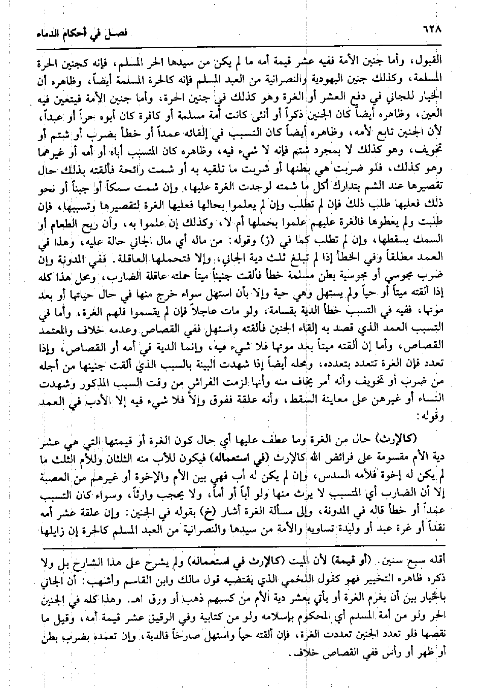 الْقبُول، وَأما جَنِين الْأمة فَفِيهِ عشر قيمَة أمه مَا لم يكن من سَيِّدهَا الْحر الْمُسلم، فَإِنَّهُ كجنين الْحرَّة الْمسلمَة، وَكَذَلِكَ جَنِين الْيَهُودِيَّة والنصرانية من العَبْد الْمُسلم فَإِنَّهُ كَالْحرَّةِ الْمسلمَة أَيْضا، وَظَاهره أَن الْخِيَار للجاني فِي دفع الْعشْر أَو الْغرَّة وَهُوَ كَذَلِك فِي جَنِين الْحرَّة، وَأما جَنِين الْأمة فَيتَعَيَّن فِيهِ الْعين، وَظَاهره أَيْضا كَانَ الْجَنِين ذكرا أَو أُنْثَى كَانَت أمة مسلمة أَو كَافِرَة كَانَ أَبوهُ حرا أَو عبدا، لِأَن الْجَنِين تَابع لأمه، وَظَاهره أَيْضا كَانَ التَّسَبُّب فِي إلقائه عمدا أَو خطأ بِضَرْب أَو شتم أَو تخويف، وَهُوَ كَذَلِك لَا بِمُجَرَّد شتم فَإِنَّهُ لَا شَيْء فِيهِ، وَظَاهره كَانَ المتسبب أَبَاهُ أَو أمه أَو غَيرهمَا وَهُوَ كَذَلِك، فَلَو ضربت هِيَ بَطنهَا أَو شربت مَا تلقيه بِهِ أَو شمت رَائِحَة فألقته بذلك حَال تَقْصِيرهَا عِنْد الشم بتدارك أكل مَا شمته لوجدت الْغرَّة عَلَيْهَا، وَإِن شمت سمكًا أَو جبنا أَو نَحْو ذَلِك فعلَيْهَا طلب ذَلِك فَإِن لم تطلب وَإِن لم يعلمُوا بِحَالِهَا فعلَيْهَا الْغرَّة لتقصيرها وتسببها، فَإِن طلبت وَلم يعطوها فالغرة عَلَيْهِم علمُوا بحملها أم لَا، وَكَذَلِكَ إِن علمُوا بِهِ، وَأَن ريح الطَّعَام أَو السّمك يُسْقِطهَا، وَإِن لم تطلب كَمَا فِي (ز) وَقَوله: من مَاله أَي مَال الْجَانِي حَالَة عَلَيْهِ، وَهَذَا فِي الْعمد مُطلقًا وَفِي الْخَطَأ إِذا لم تبلغ ثلث دِيَة الْجَانِي، وَإِلَّا فتحملها الْعَاقِلَة. فَفِي الْمُدَوَّنَة وَإِن ضرب مَجُوسِيّ أَو مَجُوسِيَّة بطن مسلمة خطأ فَأَلْقَت جَنِينا مَيتا حَملته عَاقِلَة الضَّارِب، وَمحل هَذَا كُله إِذا ألقته مَيتا أَو حَيا وَلم يستهل وَهِي حَيَّة وَإِلَّا بِأَن اسْتهلّ سَوَاء خرج مِنْهَا فِي حَال حَيَاتهَا أَو بعد مَوتهَا، فَفِيهِ فِي التَّسَبُّب خطأ الدِّيَة بقسامة، وَلَو مَاتَ عَاجلا فَإِن لم يقسموا فَلهم الْغرَّة، وَأما فِي التَّسَبُّب الْعمد الَّذِي قصد بِهِ إِلْقَاء الْجَنِين فألقته واستهل فَفِي الْقصاص وَعَدَمه خلاف وَالْمُعْتَمد الْقصاص، وَأما إِن ألقته مَيتا بعد مَوتهَا فَلَا شَيْء فِيهِ، وَإِنَّمَا الدِّيَة فِي أمه أَو الْقصاص، وَإِذا تعدد فَإِن الْغرَّة تَتَعَدَّد بتعدده، وَمحله أَيْضا إِذا شهِدت الْبَيِّنَة بِالسَّبَبِ الَّذِي أَلْقَت جَنِينهَا من أَجله من ضرب أَو تخويف وَأَنه أَمر يخَاف مِنْهُ وَأَنَّهَا لَزِمت الْفراش من وَقت السَّبَب الْمَذْكُور وَشهِدت النِّسَاء أَو غَيْرهنَّ على مُعَاينَة السقط، وَأَنه علقَة ففوق وإلاَّ فَلَا شَيْء فِيهِ إِلَّا الْأَدَب فِي الْعمد وَقَوله: (كَالْإِرْثِ) حَال من الْغرَّة وَمَا عطف عَلَيْهَا أَي حَال كَون الْغرَّة أَو قيمتهَا الَّتِي هِيَ عشر دِيَة الْأُم مقسومة على فَرَائض الله كَالْإِرْثِ (فِي اسْتِعْمَاله) فَيكون للْأَب مِنْهُ الثُّلُثَانِ وَللْأُمّ الثُّلُث مَا لم يكن لَهُ إخْوَة فلأمه السُّدس، وَإِن لم يكن لَهُ أَب فَهِيَ بَين الْأُم وَالإِخْوَة أَو غَيرهم من الْعصبَة إِلَّا أَن الضَّارِب أَي المتسبب لَا يَرث مِنْهَا وَلَو أَبَا أَو أما، وَلَا يحجب وَارِثا، وَسَوَاء كَانَ التَّسَبُّب عمدا أَو خطأ قَالَه فِي الْمُدَوَّنَة، وَإِلَى مَسْأَلَة الْغرَّة أَشَارَ (خَ) بقوله فِي الْجَنِين: وَإِن علقَة عشر أمه نَقْدا أَو غرَّة عبد أَو وليدة تساويه وَالْأمة من سَيِّدهَا والنصرانية من العَبْد الْمُسلم كَالْحرَّةِ إِن زايلها