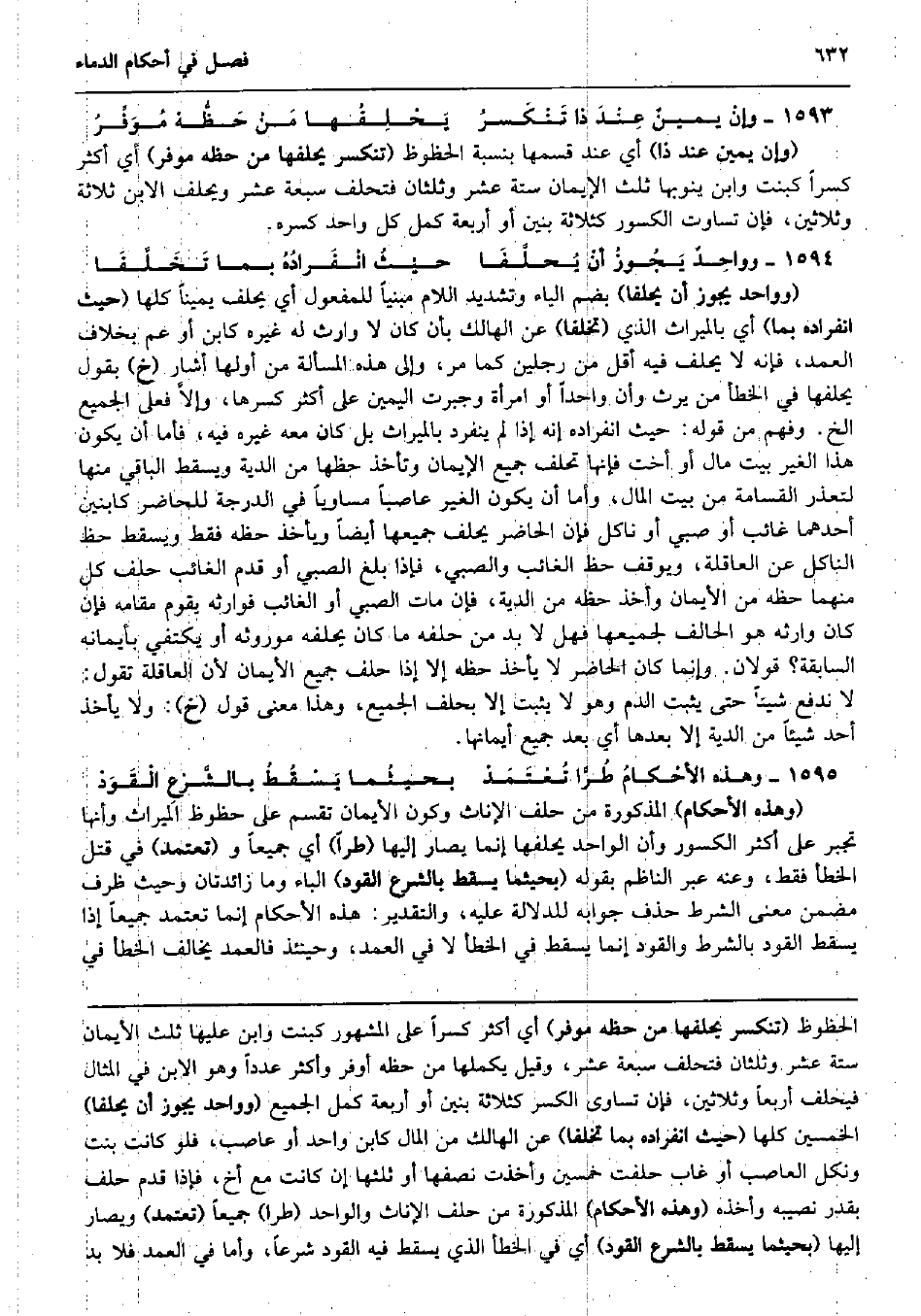 وإنْ يمينٌ عِنْدَ ذَا تَنْكَسرُ يَحْلِفُها مَنْ حَظُّهْ مُوَفِّرُ (وَإِن يَمِين عِنْد ذَا) أَي عِنْد قسمهَا بِنِسْبَة الحظوظ (تنكسر يحلفها من حَظه موفر) أَي أَكثر كسراً كَبِنْت وَابْن ينوبها ثلث الْإِيمَان سِتَّة عشر وَثُلُثَانِ فتحلف سَبْعَة عشر وَيحلف الابْن ثَلَاثَة وَثَلَاثِينَ، فَإِن تَسَاوَت الكسور كثلاثة بَنِينَ أَو أَرْبَعَة كمل كل وَاحِد كَسره. وواحِدٌ يَجُوزُ أنْ يُحلَّفَا حيْثُ انْفَرادُهُ بِمَا تَخَلَّفَا (وَوَاحِد يجوز أَن يحلفا) بِضَم الْيَاء وَتَشْديد اللَّام مَبْنِيا للْمَفْعُول أَي يحلف يَمِينا كلهَا (حَيْثُ انْفِرَاده بِمَا) أَي بِالْمِيرَاثِ الَّذِي (تخلفا) عَن الْهَالِك بِأَن كَانَ لَا وَارِث لَهُ غَيره كَابْن أَو عَم بِخِلَاف الْعمد، فَإِنَّهُ لَا يحلف فِيهِ أقل من رجلَيْنِ كَمَا مر، وَإِلَى هَذِه الْمَسْأَلَة من أَولهَا أَشَارَ (خَ) بقول يحلفها فِي الْخَطَأ من يَرث وَأَن وَاحِدًا أَو امْرَأَة وجبرت الْيَمين على أَكثر كسرهَا، وإلاَّ فعلى الْجَمِيع الخ. وَفهم من قَوْله: حَيْثُ انْفِرَاده إِنَّه إِذا لم ينْفَرد بِالْمِيرَاثِ بل كَانَ مَعَه غَيره فِيهِ، فَأَما أَن يكون هَذَا الْغَيْر بَيت مَال أَو أُخْت فَإِنَّهَا تحلف جَمِيع الْإِيمَان وَتَأْخُذ حظها من الدِّيَة وَيسْقط الْبَاقِي مِنْهَا لتعذر الْقسَامَة من بَيت المَال وَأما أَن يكون الْغَيْر عاصباً مُسَاوِيا فِي الدرجَة للحاضر كابنين أَحدهمَا غَائِب أَو صبي أَو ناكل فَإِن الْحَاضِر يحلف جَمِيعهَا أَيْضا وَيَأْخُذ حَظه فَقَط وَيسْقط حَظّ الناكل عَن الْعَاقِلَة، وَيُوقف حَظّ الْغَائِب وَالصَّبِيّ، فَإِذا بلغ الصَّبِي أَو قدم الْغَائِب حلف كل مِنْهُمَا حَظه من الْأَيْمَان وَأخذ حَظه من الدِّيَة، فَإِن مَاتَ الصَّبِي أَو الْغَائِب فوارثه يقوم مقَامه فَإِن كَانَ وَارثه هُوَ الْحَالِف لجميعها فَهَل لَا بُد من حلفه مَا كَانَ يحلفهُ موروثه أَو يَكْتَفِي بأيمانه السَّابِقَة؟ قَولَانِ. وَإِنَّمَا كَانَ الْحَاضِر لَا يَأْخُذ حَظه إِلَّا إِذا حلف جَمِيع الْأَيْمَان لِأَن الْعَاقِلَة تَقول: لَا ندفع شَيْئا حَتَّى يثبت الدَّم وَهُوَ لَا يثبت إِلَّا بِحلف الْجَمِيع، وَهَذَا معنى قَول (خَ) : وَلَا يَأْخُذ أحد شَيْئا من الدِّيَة إِلَّا بعْدهَا أَي بعد جَمِيع أيمانها. وَهَذِه الأحْكامُ طُرًّا تُعْتَمَدْ بحيثُما يَسْقُطُ بالشَّرْعِ الْقَوَدْ (وَهَذِه الْأَحْكَام) الْمَذْكُورَة من حلف الْإِنَاث وَكَون الْأَيْمَان تقسم على حظوظ الْمِيرَاث وَأَنَّهَا تجبر على أَكثر الكسور وَأَن الْوَاحِد يحلفها إِنَّمَا يُصَار إِلَيْهَا (طراً) أَي جَمِيعًا و (تعتمد) فِي قتل الْخَطَأ فَقَط، وَعنهُ عبر النَّاظِم بقوله (بحيثما يسْقط بِالشَّرْعِ الْقود) الْبَاء وَمَا زائدتان وَحَيْثُ ظرف مضمن معنى الشَّرْط حذف جَوَابه للدلالة عَلَيْهِ، وَالتَّقْدِير: هَذِه الْأَحْكَام إِنَّمَا تعتمد جَمِيعًا إِذا يسْقط الْقود بِالشّرطِ والقود إِنَّمَا يسْقط فِي الْخَطَأ لَا فِي الْعمد، وَحِينَئِذٍ فالعمد يُخَالف الْخَطَأ فِي