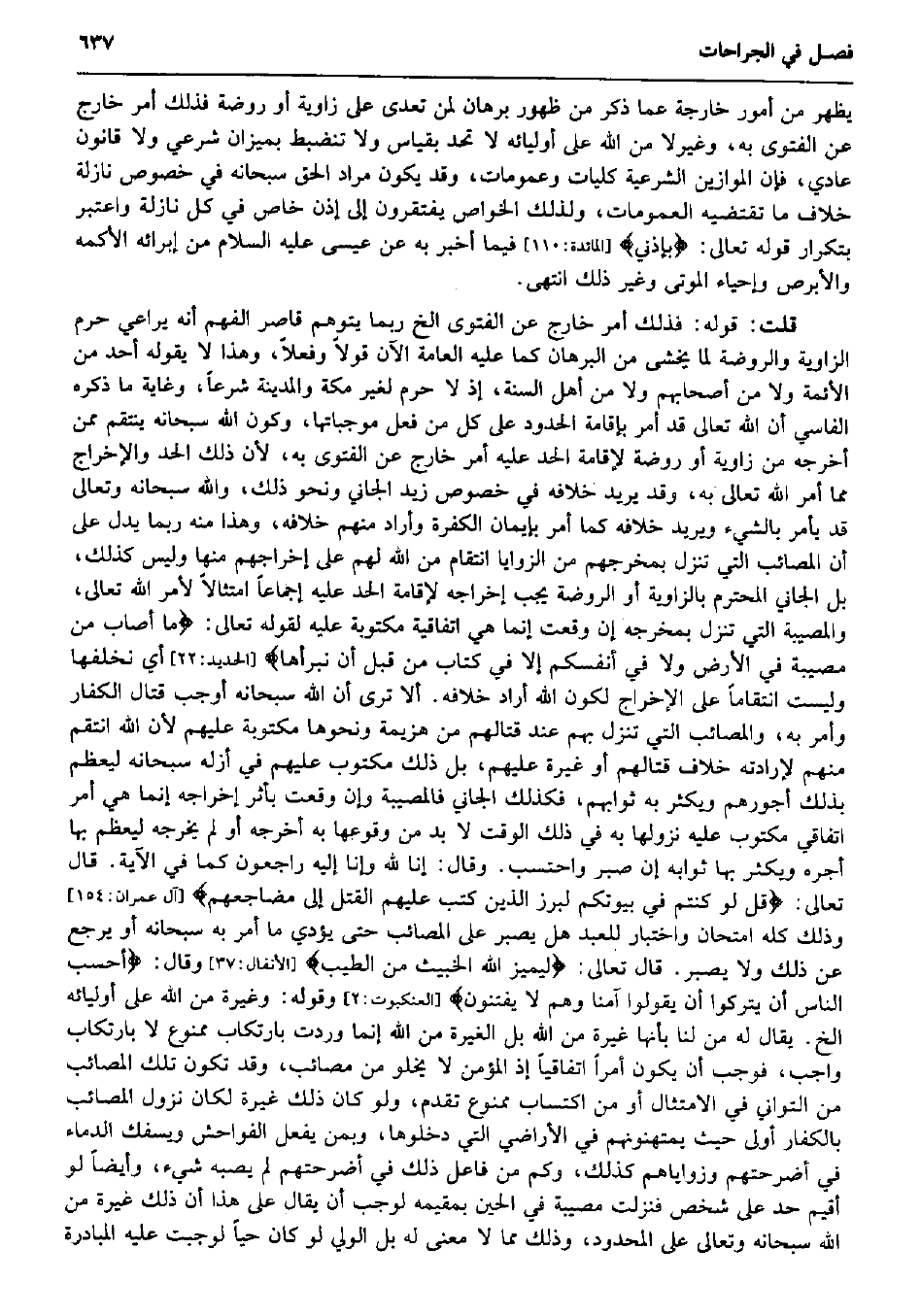 يظْهر من أُمُور خَارِجَة عَمَّا ذكر من ظُهُور برهَان لمن تعدى على زَاوِيَة أَو رَوْضَة فَذَلِك أَمر خَارج عَن الْفَتْوَى بِهِ، وغيرلا من الله على أوليائه لَا تحد بِقِيَاس وَلَا تنضبط بميزان شَرْعِي وَلَا قانون عادي، فَإِن الموازين الشَّرْعِيَّة كليات وعمومات، وَقد يكون مُرَاد الْحق سُبْحَانَهُ فِي خُصُوص نازلة خلاف مَا تَقْتَضِيه العمومات، وَلذَلِك الْخَواص يفتقرون إِلَى إِذن خَاص فِي كل نازلة وَاعْتبر بتكرار قَوْله تَعَالَى: بإذني} (الْمَائِدَة: 110) فِيمَا أخبر بِهِ عَن عِيسَى عَلَيْهِ السَّلَام من إبرائه الأكمه والأبرص وإحياء الْمَوْتَى وَغير ذَلِك انْتهى. قلت: قَوْله: فَذَلِك أَمر خَارج عَن الْفَتْوَى الخ رُبمَا يتَوَهَّم قَاصِر الْفَهم أَنه يُرَاعِي حرم الزاوية وَالرَّوْضَة لما يخْشَى من الْبُرْهَان كَمَا عَلَيْهِ الْعَامَّة الْآن قولا وفعلاً، وَهَذَا لَا يَقُوله أحد من الْأَئِمَّة وَلَا من أَصْحَابهم وَلَا من أهل السّنة، إِذْ لَا حرم لغير مَكَّة وَالْمَدينَة شرعا، وَغَايَة مَا ذكره الفاسي أَن الله تَعَالَى قد أَمر بِإِقَامَة الْحُدُود على كل من فعل موجباتها، وَكَون الله سُبْحَانَهُ ينْتَقم مِمَّن أخرجه من زَاوِيَة أَو رَوْضَة لإِقَامَة الْحَد عَلَيْهِ أَمر خَارج عَن الْفَتْوَى بِهِ، لِأَن ذَلِك الْحَد والإخراج مِمَّا أَمر الله تَعَالَى بِهِ، وَقد يُرِيد خِلَافه فِي خُصُوص زيد الْجَانِي وَنَحْو ذَلِك، وَالله سُبْحَانَهُ وَتَعَالَى قد يَأْمر بالشَّيْء وَيُرِيد خِلَافه كَمَا أَمر بِإِيمَان الْكَفَرَة وَأَرَادَ مِنْهُم خِلَافه، وَهَذَا مِنْهُ رُبمَا يدل على أَن المصائب الَّتِي تنزل بمخرجهم من الزوايا انتقام من الله لَهُم على إخراجهم مِنْهَا وَلَيْسَ كَذَلِك، بل الْجَانِي الْمُحْتَرَم بالزاوية أَو الرَّوْضَة يجب إِخْرَاجه لإِقَامَة الْحَد عَلَيْهِ إِجْمَاعًا امتثالاً لأمر الله تَعَالَى، والمصيبة الَّتِي تنزل بمخرجه إِن وَقعت إِنَّمَا هِيَ اتفاقية مَكْتُوبَة عَلَيْهِ لقَوْله تَعَالَى: مَا أصَاب من مُصِيبَة فِي الأَرْض وَلَا فِي أَنفسكُم إِلَّا فِي كتاب من قبل أَن نبرأها} (الْحَدِيد: 22) أَي نخلفها وَلَيْسَت انتقاماً على الْإِخْرَاج لكَون الله أَرَادَ خِلَافه. أَلا ترى أَن الله سُبْحَانَهُ أوجب قتال الْكفَّار وَأمر بِهِ، والمصائب الَّتِي تنزل بهم عِنْد قِتَالهمْ من هزيمَة وَنَحْوهَا مَكْتُوبَة عَلَيْهِم لِأَن الله انتقم مِنْهُم لإرادته خلاف قِتَالهمْ أَو غيرَة عَلَيْهِم، بل ذَلِك مَكْتُوب عَلَيْهِم فِي أزله سُبْحَانَهُ ليعظم بذلك أُجُورهم وَيكثر بِهِ ثوابهم، فَكَذَلِك الْجَانِي فالمصيبة وَإِن وَقعت بأثر إِخْرَاجه إِنَّمَا هِيَ أَمر اتفاقي مَكْتُوب عَلَيْهِ نُزُولهَا بِهِ فِي ذَلِك الْوَقْت لَا بُد من وُقُوعهَا بِهِ أخرجه أَو لم يُخرجهُ ليعظم بهَا أجره وَيكثر بهَا ثَوَابه إِن صَبر واحتسب. وَقَالَ: إِنَّا لله وَإِنَّا إِلَيْهِ رَاجِعُون كَمَا فِي الْآيَة. قَالَ تَعَالَى: قل لَو كُنْتُم فِي بُيُوتكُمْ لبرز الَّذين كتب عَلَيْهِم الْقَتْل إِلَى مضاجعهم} (آل عمرَان: 154) وَذَلِكَ كُله امتحان واختبار للْعَبد هَل يصبر على المصائب حَتَّى يُؤَدِّي مَا أَمر بِهِ سُبْحَانَهُ أَو يرجع عَن ذَلِك وَلَا يصبر. قَالَ تَعَالَى: ليميز الله الْخَبيث من الطّيب} (الْأَنْفَال: 37) وَقَالَ: أَحسب النَّاس أَن يتْركُوا أَن يَقُولُوا آمنا وهم لَا يفتنون} (العنكبوت: 2) وَقَوله: وغيرة من الله على أوليائه الخ. يُقَال لَهُ من لنا بِأَنَّهَا غيرَة من الله بل الْغيرَة من الله إِنَّمَا وَردت بارتكاب مَمْنُوع لَا بارتكاب وَاجِب، فَوَجَبَ أَن يكون أمرا اتفاقياً إِذْ الْمُؤمن لَا يَخْلُو من مصائب، وَقد تكون تِلْكَ المصائب من التواني فِي الِامْتِثَال أَو من اكْتِسَاب مَمْنُوع تقدم، وَلَو كَانَ ذَلِك غيرَة لَكَانَ نزُول المصائب بالكفار أولى حَيْث
