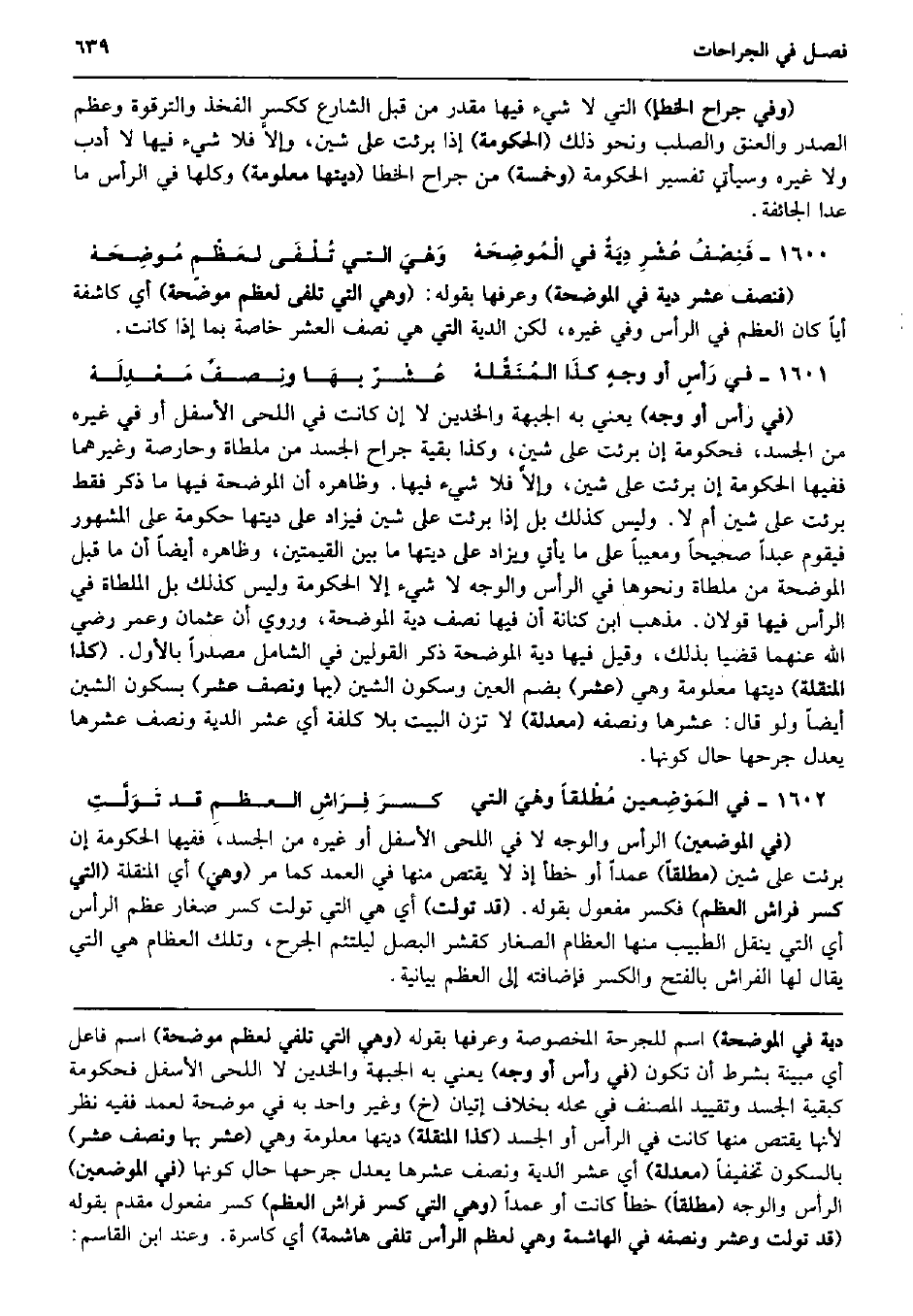 (وَفِي جراح الْخَطَإِ) الَّتِي لَا شَيْء فِيهَا مُقَدّر من قبل الشَّارِع ككسر الْفَخْذ والترقوة وَعظم الصَّدْر والعنق والصلب وَنَحْو ذَلِك (الْحُكُومَة) إِذا بَرِئت على شين، وإلاَّ فَلَا شَيْء فِيهَا لَا أدب وَلَا غَيره وَسَيَأْتِي تَفْسِير الْحُكُومَة (وَخَمْسَة) من جراح الخطا (دِيَتهَا مَعْلُومَة) وَكلهَا فِي الرَّأْس مَا عدا الْجَائِفَة. فَنِصْفُ عُشْرِ دِيَةٌ فِي الْمُوضِحَهْ وَهْيَ الَّتِي تُلْفَى لعَظْمٍ مُوضِحَهْ (فَنصف عشر دِيَة فِي الْمُوَضّحَة) وَعرفهَا بقوله: (وَهِي الَّتِي تلفى لعظم مُوضحَة) أَي كاشفة أياً كَانَ الْعظم فِي الرَّأْس وَفِي غَيره، لَكِن الدِّيَة الَّتِي هِيَ نصف الْعشْر خَاصَّة بِمَا إِذا كَانَت. فِي رَأسٍ أَو وجهٍ كذَا المُنَقِّلهْ عُشْرٌ بهَا ونِصفٌ مَعْدِلَهْ (فِي رَأس أَو وَجه) يَعْنِي بِهِ الْجَبْهَة والخدين لَا إِن كَانَت فِي اللحى الْأَسْفَل أَو فِي غَيره من الْجَسَد، فَحُكُومَة إِن بَرِئت على شين، وَكَذَا بَقِيَّة جراح الْجَسَد من ملطاة وحارصة وَغَيرهمَا فَفِيهَا الْحُكُومَة إِن بَرِئت على شين، وإلاَّ فَلَا شَيْء فِيهَا. وَظَاهره أَن الْمُوَضّحَة فِيهَا مَا ذكر فَقَط بَرِئت على شين أم لَا. وَلَيْسَ كَذَلِك بل إِذا بَرِئت على شين فيزاد على دِيَتهَا حُكُومَة على الْمَشْهُور فَيقوم عبدا صَحِيحا ومعيباً على مَا يَأْتِي وَيُزَاد على دِيَتهَا مَا بَين الْقِيمَتَيْنِ، وَظَاهره أَيْضا أَن مَا قبل الْمُوَضّحَة من ملطاة وَنَحْوهَا فِي الرَّأْس وَالْوَجْه لَا شَيْء إِلَّا الْحُكُومَة وَلَيْسَ كَذَلِك بل الملطاة فِي الرَّأْس فِيهَا قَولَانِ. مَذْهَب ابْن كنَانَة أَن فِيهَا نصف دِيَة الْمُوَضّحَة، وَرُوِيَ أَن عُثْمَان وَعمر رَضِي الله عَنْهُمَا قضيا بذلك، وَقيل فِيهَا دِيَة الْمُوَضّحَة ذكر الْقَوْلَيْنِ فِي الشَّامِل مصدرا بِالْأولِ. (كَذَا المنقلة) دِيَتهَا مَعْلُومَة وَهِي (عشر) بِضَم الْعين وَسُكُون الشين (بهَا وَنصف عشر) بِسُكُون الشين أَيْضا وَلَو قَالَ: عشرهَا وَنصفه (معدلة) لَا تزن الْبَيْت بِلَا كلفة أَي عشر الدِّيَة وَنصف عشرهَا يعدل جرحها حَال كَونهَا. فِي المَوْضِعين مُطْلقاً وهْيَ الَّتِي كسرَ فِرَاشِ العظمِ قد تَوَلَّتِ (فِي الْمَوْضِعَيْنِ) الرَّأْس وَالْوَجْه لَا فِي اللحى الْأَسْفَل أَو غَيره من الْجَسَد، فَفِيهَا الْحُكُومَة إِن بَرِئت على شين (مُطلقًا) عمدا أَو خطأ إِذْ لَا يقْتَصّ مِنْهَا فِي الْعمد كَمَا مر (وَهِي) أَي المنقلة (الَّتِي كسر فرَاش الْعظم) فَكسر مفعول بقوله. (قد تولت) أَي هِيَ الَّتِي تولت كسر صغَار عظم الرَّأْس أَي الَّتِي ينْقل الطَّبِيب مِنْهَا الْعِظَام الصغار كقشر البصل ليلتئم الْجرْح، وَتلك الْعِظَام هِيَ الَّتِي يُقَال لَهَا الْفراش بِالْفَتْح وَالْكَسْر فإضافته إِلَى الْعظم بَيَانِيَّة.