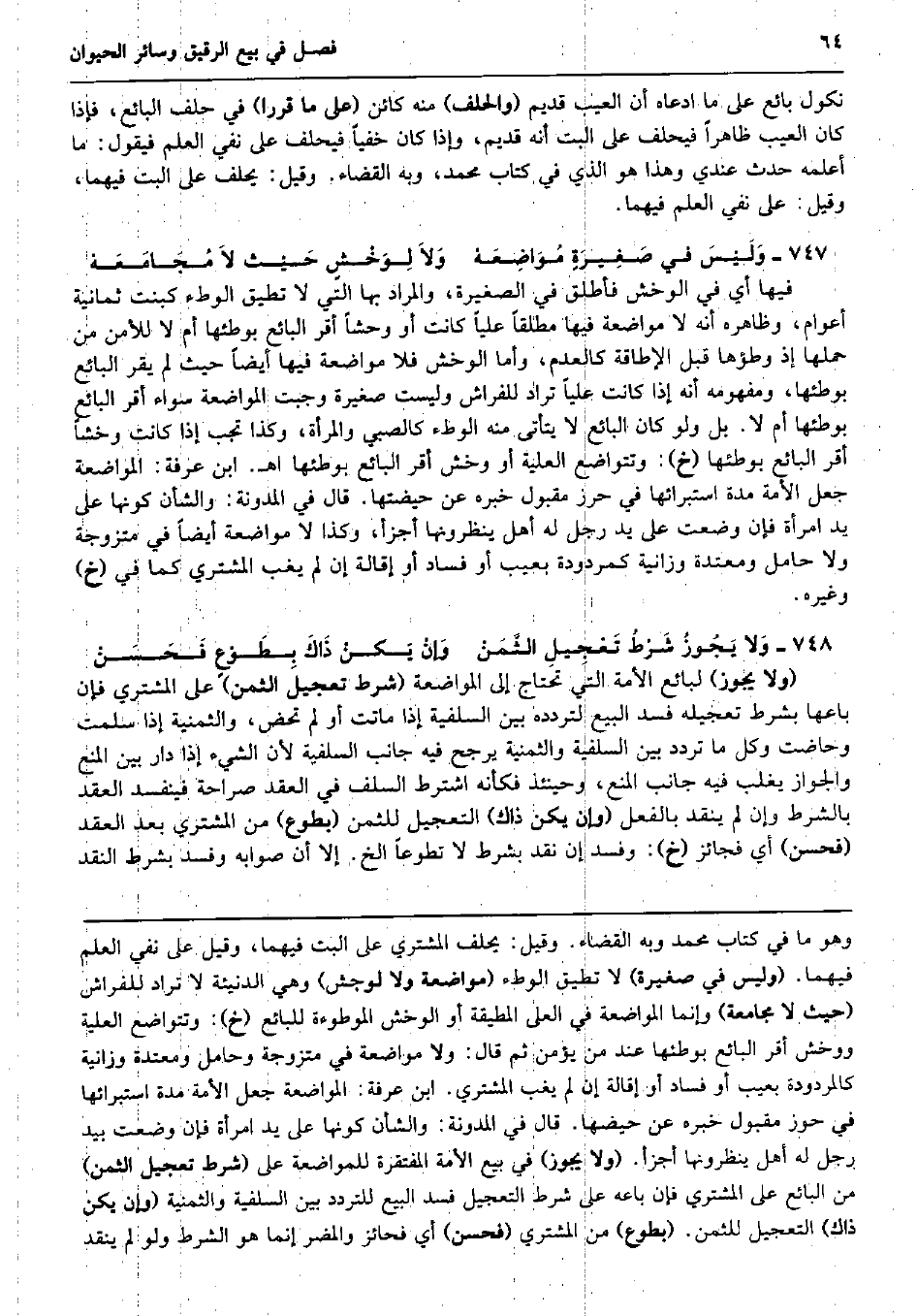 نُكُول بَائِع على مَا ادَّعَاهُ أَن الْعَيْب قديم (وَالْحلف) مِنْهُ كَائِن (على مَا قررا) فِي حلف البَائِع، فَإِذا كَانَ الْعَيْب ظَاهرا فَيحلف على الْبَتّ أَنه قديم، وَإِذا كَانَ خفِيا فَيحلف على نفي الْعلم فَيَقُول: مَا أعلمهُ حدث عِنْدِي وَهَذَا هُوَ الَّذِي فِي كتاب مُحَمَّد، وَبِه الْقَضَاء. وَقيل: يحلف على الْبَتّ فيهمَا، وَقيل: على نفي الْعلم فيهمَا. وَلَيْسَ فِي صَغِيرَةٍ مُوَاضِعَهْ وَلاَ لِوَخْشٍ حَيْث لاَ مُجَامَعَهْ فِيهَا أَي فِي الوخش فَأطلق فِي الصَّغِيرَة، وَالْمرَاد بهَا الَّتِي لَا تطِيق الْوَطْء كَبِنْت ثَمَانِيَة أَعْوَام، وَظَاهره أَنه لَا مواضعة فِيهَا مُطلقًا عليا كَانَت أَو وحشاً أقرّ البَائِع بِوَطْئِهَا أم لَا للأمن من حملهَا إِذْ وَطْؤُهَا قبل الإطاقة كَالْعدمِ، وَأما الوخش فَلَا مواضعة فِيهَا أَيْضا حَيْثُ لم يقر البَائِع بِوَطْئِهَا، وَمَفْهُومه أَنه إِذا كَانَت عليا ترَاد للْفراش وَلَيْسَت صَغِيرَة وَجَبت الْمُوَاضَعَة سَوَاء أقرّ البَائِع بِوَطْئِهَا أم لَا. بل وَلَو كَانَ البَائِع لَا يَتَأَتَّى مِنْهُ الْوَطْء كَالصَّبِيِّ وَالْمَرْأَة، وَكَذَا تجب إِذا كَانَت وخشاً أقرّ البَائِع بِوَطْئِهَا (خَ) : وتتواضع الْعلية أَو وخش أقرّ البَائِع بِوَطْئِهَا اه. ابْن عَرَفَة: الْمُوَاضَعَة جعل الْأمة مُدَّة استبرائها فِي حرز مَقْبُول خَبره عَن حَيْضَتهَا. قَالَ فِي الْمُدَوَّنَة: والشأن كَونهَا على يَد امْرَأَة فَإِن وضعت على يَد رجل لَهُ أهل ينظرونها أَجْزَأَ، وَكَذَا لَا مواضعة أَيْضا فِي متزوجة وَلَا حَامِل ومعتدة وزانية كمردودة بِعَيْب أَو فَسَاد أَو إِقَالَة إِن لم يغب المُشْتَرِي كَمَا فِي (خَ) وَغَيره. وَلاَ يَجُوزُ شَرْطُ تَعْجِيلِ الثَّمَنْ وَإنْ يَكنْ ذَاكَ بِطَوْعٍ فَحَسَنْ (وَلَا يجوز) لبائع الْأمة الَّتِي تحْتَاج إِلَى الْمُوَاضَعَة (شَرط تَعْجِيل الثّمن) على المُشْتَرِي فَإِن بَاعهَا بِشَرْط تَعْجِيله فسد البيع لتردده بَين السلفية إِذا مَاتَت أَو لم تَحض والثمنية إِذا سلمت وحاضت وكل مَا تردد بَين السلفية والثمنية يرجح فِيهِ جَانب السلفية لِأَن الشَّيْء إِذا دَار بَين الْمَنْع وَالْجَوَاز يغلب فِيهِ جَانب الْمَنْع، وَحِينَئِذٍ فَكَأَنَّهُ اشْترط السّلف فِي العقد صَرَاحَة فينفسد العقد بِالشّرطِ وَإِن لم ينْقد بِالْفِعْلِ (وَإِن يكن ذَاك) التَّعْجِيل للثّمن (بطوع) من المُشْتَرِي بعد العقد (فَحسن) أَي فَجَائِز (خَ) : وَفَسَد إِن نقد بِشَرْط لَا تَطَوّعا الخ. إِلَّا أَن صَوَابه وَفَسَد بِشَرْط النَّقْد