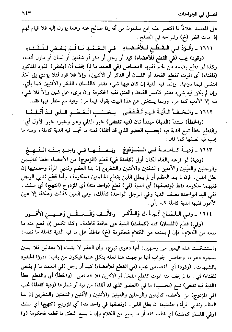 على الْمُعْتَمد خلافًا لما اقْتصر عَلَيْهِ ابْن سَلمُون من أَنه إِذا صَالح عَنهُ وَعَما يؤول إِلَيْهِ فَلَا قيام لَهُم إِذا مَاتَ انْظُر (خَ) وشراحه فِي الصُّلْح. وقَوَدٌ فِي القَطْعِ للأَعْضاءِ فِي العَمْدِ مَا لَمْ يُفْضِ لِلْفَنَاءِ (وقود) يجب (فِي الْقطع للأعضاء) كيد أَو رجل أَو ذكر أَو شفتين أَو لِسَان أَو مارن أنف وَكَذَا لَو قطع بضعَة من لحم فَفِيهَا الْقصاص (فِي الْعمد مَا لم) يخف أَن (يفض) الْقود الْمَذْكُور (للفناء) أَي الْمَوْت كَقطع الْفَخْذ أَو اللِّسَان أَو الذّكر أَو الْأُنْثَيَيْنِ، وَإِلَّا فَلَا قَود لِئَلَّا يُؤَدِّي إِلَى أَخذ النَّفس فِيمَا دونهَا. وَإِنَّمَا فِيهِ الدِّيَة إِن كَانَ فِيهَا شَيْء مُقَدّر كاللسان وَالذكر والأنثيين كَمَا يَأْتِي، وَإِن لم يكن فِيهِ شَيْء مُقَدّر ككسر الْفَخْذ والعنق فَفِيهِ الْحُكُومَة وَإِن برىء على شين وإلاَّ فَلَا شَيْء فِيهِ إِلَّا الْأَدَب كَمَا مر، وَرُبمَا يسْتَغْنى عَن هَذَا الْبَيْت بقوله فِيمَا مر: ودية مَعَ خطر فِيهَا فقد. وَالْخَطَأ الدِّيَةُ فيهِ تُقْتَفَى بحَسَبِ الْعُضْوِ الَّذِي قدْ أُتْلِفَا (وَالْخَطَأ) مُبْتَدأ (الدِّيَة) مُبْتَدأ ثَان (فِيهِ تقتفى) خبر الثَّانِي وَهُوَ وَخَبره خبر الأول أَي: وَالْقطع خطأ تتبع الدِّيَة فِيهِ (بِحَسب الْعُضْو الَّذِي قد أتلفا) فَمِنْهُ مَا تجب فِيهِ الدِّيَة كَامِلَة، وَمِنْه مَا يجب فِيهِ نصفهَا كَمَا قَالَ: وَديةٌ كاملةٌ فِي المُزْدَوِجْ ونِصفُها فِي واحِدٍ مِنْه انْتُهِجْ (ودية) لَو فَرعه بِالْفَاءِ لَكَانَ أولى (كَامِلَة فِي) قطع (المزدوج) من الْأَعْضَاء خطا كاليدين وَالرّجلَيْنِ والعينين والأذنين والشفتين والأنثيين والشفرين إِن بدا الْعظم وثديي الْمَرْأَة وحلمتيها إِن بَطل اللَّبن، فَإِن لم يبد الْعظم أَو لم يبطل اللَّبن بِقطع الحلمتين فَحُكُومَة، وَأما قطع ثديي الرجل ففيهما حُكُومَة فَقَط (وَنِصْفهَا) أَي الدِّيَة (فِي) قطع (وَاحِد مِنْهُ) أَي المزدوج (انتهج) أَي سلك. فَفِي الْيَد الْوَاحِدَة نصف الدِّيَة وَفِي الرجل الْوَاحِدَة كَذَلِك، وَفِي الْعين كَذَلِك وَهَكَذَا إِلَّا عين الْأَعْوَر فَفِيهَا الدِّيَة كَامِلَة كَمَا يَأْتِي. وَفي اللسَانِ كُمِلَتْ وَالذَّكَرِ والأَنْفِ وَالْعَقْلِ وَعينِ الأَعْوَرِ (وَفِي) قطع (اللِّسَان) كُله (كملت) الدِّيَة على عَاقِلَة قَاطِعَة، وَكَذَا تكمل إِن قطع مِنْهُ مَا مَنعه من الْكَلَام، فَإِن لم يمنعهُ من الْكَلَام فَحُكُومَة (خَ) عاطفاً على مَا فِيهِ الدِّيَة كَامِلَة مَا نَصه: