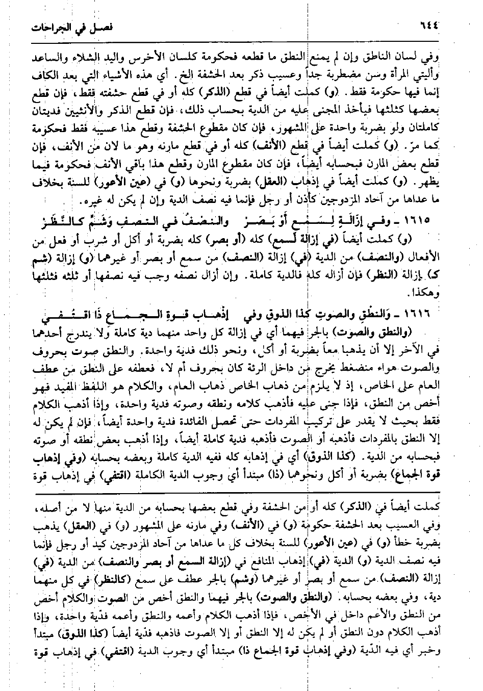 وَفِي لِسَان النَّاطِق وَإِن لم يمْنَع النُّطْق مَا قطعه فَحُكُومَة كلسان الْأَخْرَس وَالْيَد الشلاء والساعد وأليتي الْمَرْأَة وَسن مضطربة جدا وعسيب ذكر بعد الْحَشَفَة الخ. أَي هَذِه الْأَشْيَاء الَّتِي بعد الْكَاف إِنَّمَا فِيهَا حُكُومَة فَقَط. (و) كملت أَيْضا فِي قطع (الذّكر) كُله أَو فِي قطع حشفته فَقَط، فَإِن قطع بَعْضهَا كثلثها فَيَأْخُذ المجنى عَلَيْهِ من الدِّيَة بِحِسَاب ذَلِك، فَإِن قطع الذّكر والأنثيين فديتان كاملتان وَلَو بضربة وَاحِدَة على الْمَشْهُور، فَإِن كَانَ مَقْطُوع الْحَشَفَة وَقطع هَذَا عسيبه فَقَط فَحُكُومَة كَمَا مرّ. (و) كملت أَيْضا فِي قطع (الْأنف) كُله أَو فِي قطع مارنه وَهُوَ مَا لَان من الْأنف، فَإِن قطع بعض المارن فبحسابه أَيْضا، فَإِن كَانَ مَقْطُوع المارن وَقطع هَذَا بَاقِي الْأنف فَحُكُومَة فِيمَا يظْهر. (و) كملت أَيْضا فِي إذهاب (الْعقل) بضربة وَنَحْوهَا (و) فِي (عين الْأَعْوَر) للسّنة بِخِلَاف مَا عَداهَا من آحَاد المزدوجين كأذن أَو رجل فَإِنَّمَا فِيهِ نصف الدِّيَة وَإِن لم يكن لَهُ غَيره. وَفِي إزَالَةٍ لِسَمْعٍ أَوْ بَصَرْ والنصْفُ فِي النصفِ وَشَمَ كالنَّظَرْ (و) كملت أَيْضا (فِي إِزَالَة لسمع) كُله (أَو بصر) كُله بضربة أَو أكل أَو شرب أَو فعل من الْأَفْعَال (وَالنّصف) من الدِّيَة (فِي) إِزَالَة (النّصْف) من سمع أَو بصر أَو غَيرهمَا (و) إِزَالَة (شم ك) إِزَالَة (النّظر) فَإِن أزاله كُله فَالدِّيَة كَامِلَة. وَإِن أَزَال نصفه وَجب فِيهِ نصفهَا أَو ثلثه فثلثها وَهَكَذَا. وَالنطْقِ والصوتِ كَذَا الذوقِ وَفِي إذْهاب قوةِ الجماعِ ذَا اقتُفي (والنطق وَالصَّوْت) بِالْجَرِّ فيهمَا أَي فِي إِزَالَة كل وَاحِد مِنْهُمَا دِيَة كَامِلَة وَلَا ينْدَرج أَحدهمَا فِي الآخر إِلَّا أَن يذهبا مَعًا بضربة أَو أكل، وَنَحْو ذَلِك فديَة وَاحِدَة. والنطق صَوت بحروف وَالصَّوْت هَوَاء منضغط يخرج من دَاخل الرئة كَانَ بحروف أم لَا، فعطفه على النُّطْق من عطف الْعَام على الْخَاص، إِذْ لَا يلْزم من ذهَاب الْخَاص ذهَاب الْعَام وَالْكَلَام هُوَ اللَّفْظ الْمُفِيد فَهُوَ أخص من النُّطْق، فَإِذا جنى عَلَيْهِ فَأذْهب كَلَامه ونطقه وصوته فديَة وَاحِدَة، وَإِذا أذهب الْكَلَام فَقَط بِحَيْثُ لَا يقدر على تركيب الْمُفْردَات حَتَّى تحصل الْفَائِدَة فديَة وَاحِدَة أَيْضا، فَإِن لم يكن لَهُ إِلَّا النُّطْق بالمفردات فأذهبه أَو الصَّوْت فأذهبه فديَة كَامِلَة أَيْضا، وَإِذا أذهب بعض نطقه أَو صَوته فبحسابه من الدِّيَة. (كَذَا الذَّوْق) أَي فِي إذهابه كُله فَفِيهِ الدِّيَة كَامِلَة وَبَعضه بِحِسَابِهِ (وَفِي إذهاب قُوَّة الْجِمَاع) بضربة أَو أكل وَنَحْوهمَا (ذَا) مُبْتَدأ أَي وجوب الدِّيَة الْكَامِلَة (اقتفي) فِي إذهاب قُوَّة
