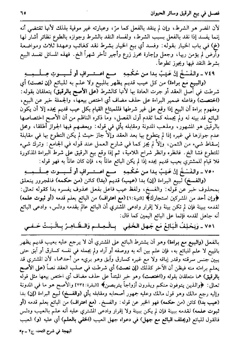 لِأَن المضر هُوَ الشَّرْط، وَإِن لم ينْقد بِالْفِعْلِ كَمَا مرّ، وَعبارَته غير موفية بذلك لِأَنَّهَا تَقْتَضِي أَنه إِنَّمَا يفْسد إِذا نقد بِالْفِعْلِ بِسَبَب الشَّرْط، ولفساد النَّقْد بِالشّرطِ وجوازه بالطوع نَظَائِر أَشَارَ لَهَا (خَ) فِي بَاب الْخِيَار بقوله: وَفَسَد أَي بيع الْخِيَار بِشَرْط نقد كغائب وعهدة ثَلَاث ومواضعة وَأَرْض لم يُؤمن ريها، وَجعل وَإِجَارَة مُحرز زرع وأجير تَأَخّر شهرا الخ. فَهَذِهِ الْمسَائِل تفْسد البيع بِشَرْط النَّقْد فِيهَا وَيجوز تَطَوّعا. والفَسْخُ إنْ عَيْبٌ بدا من حُكْمِهِ مَعَ اعترافٍ أَو ثُبوتِ عِلْمِهِ (وَالْبيع مَعَ بَرَاءَة) من كل عيب قديم يظْهر بِالْمَبِيعِ وَلَا علم بِهِ للْبَائِع (إِن نصت) أَي شرطت فِي أصل العقد أَو جرت الْعَادة بهَا لِأَنَّهَا كالشرط (على الْأَصَح بالرقيق) يتعلقان بقوله: (اخْتصّت) وفاعله ضمير الْبَرَاءَة على حذف مُضَاف أَي اخْتصَّ بيعهَا، وَالْجُمْلَة خبر عَن البيع، وَمَفْهُوم بَرَاءَة أَن البيع إِذا وَقع على غير شَرطهَا فللمبتاع الْقيام بِكُل عيب قديم يجده إِلَّا أَن يكون البَائِع قد بَينه لَهُ وَلم يجمله كَمَا تقدم أول الْفَصْل، وَمَا ذكره النَّاظِم من أَن الْأَصَح اختصاصها بالرقيق هُوَ الْمَشْهُور، وَمذهب الْمُدَوَّنَة وَمُقَابِله يَأْتِي فِي قَوْله: وَبَعْضهمْ فِيهَا الْجَوَاز أطلقا، وَمحل عدم جَوَازهَا فِي غَيره إِذا لم يتَطَوَّع بهَا بعد العقد وإلاَّ جَازَ حَيْثُ لم يكن التَّطَوُّع بهَا فِي مُقَابلَة إِسْقَاط شَيْء من الثّمن، وإلاَّ لم يجز كَمَا فِي شَارِح الْعَمَل عِنْد قَوْله فِي الْجَامِع: وَترك شَيْء للتطوع فَشَا الخ. فَانْظُرْهُ وَانْظُر شرَّاح اللامية، ثمَّ إِذا وَقع بيع الرَّقِيق على شَرط الْبَرَاءَة الْمَذْكُورَة فَلَا قيام للْمُشْتَرِي بِعَيْب قديم يجده إِذا لم يكن البَائِع عَالما بِهِ، فَإِن كَانَ عَالما بِهِ فَهُوَ قَوْله: والفَسْخُ إنْ عَيْبٌ بدا من حُكْمِهِ مَعَ اعترافٍ أَو ثُبوتٌ عِلْمِهِ (وَالْفَسْخ) لبيع الْبَرَاءَة (إِن) بدا (عيب) قديم (بدا) كَائِن (من حكمه) فالمجرور يتَعَلَّق بِمَحْذُوف خبر عَن قَوْله: وَالْفَسْخ، وَلَفظ عيب فَاعل بِفعل مَحْذُوف يفسره بدا كَقَوْلِه تَعَالَى: وَإِن أحد من الْمُشْركين استجارك} (التَّوْبَة: 6) (مَعَ اعْتِرَاف) من البَائِع بِعلم قدمه (أَو ثُبُوت علمه) لقدمه بِبَيِّنَة فَإِن لم تكن بَيِّنَة وَلَا إِقْرَار وَادّعى المُشْتَرِي أَن البَائِع عَالم بقدمه ودلس، وَادّعى البَائِع أَنه جَاهِل لقدمه فَإِنَّمَا على البَائِع الْيَمين كَمَا قَالَ: وَيَحْلِفُ الْبَائِعُ مَع جَهل الخَفِي بِالْعِلم وَالظّاهِرُ بِالْبَتِّ حَفِي
