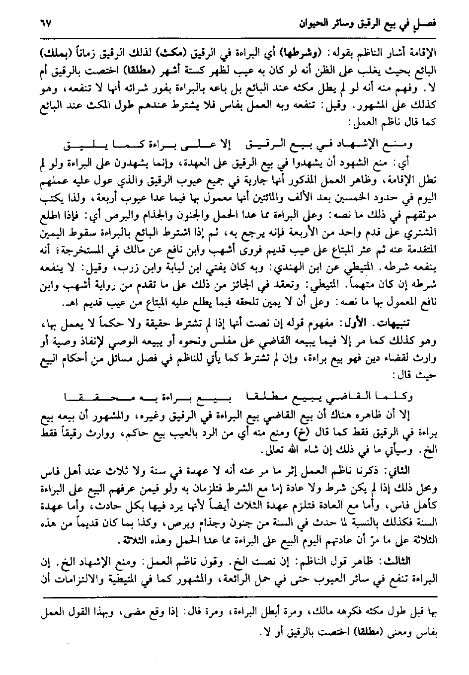 الْإِقَامَة أَشَارَ النَّاظِم بقوله: (وَشَرطهَا) أَي الْبَرَاءَة فِي الرَّقِيق (مكث) لذَلِك الرَّقِيق زَمَانا (بِملك) البَائِع بِحَيْثُ يغلب على الظَّن أَنه لَو كَانَ بِهِ عيب لظهر كستة أشهر (مُطلقًا) اخْتصّت بالرقيق أم لَا. وَفهم مِنْهُ أَنه لَو لم يطلّ مكثه عِنْد البَائِع بل بَاعه بِالْبَرَاءَةِ بفور شِرَائِهِ أَنَّهَا لَا تَنْفَعهُ، وَهُوَ كَذَلِك على الْمَشْهُور. وَقيل: تَنْفَعهُ وَبِه الْعَمَل بفاس فَلَا يشْتَرط عِنْدهم طول الْمكْث عِنْد البَائِع كَمَا قَالَ ناظم الْعَمَل: وَمنع الْإِشْهَاد فِي بيع الرَّقِيق إِلَّا على بَرَاءَة كَمَا يَلِيق أَي: منع الشُّهُود أَن يشْهدُوا فِي بيع الرَّقِيق على الْعهْدَة، وَإِنَّمَا يشْهدُونَ على الْبَرَاءَة وَلَو لم تطل الْإِقَامَة، وَظَاهر الْعَمَل الْمَذْكُور أَنَّهَا جَارِيَة فِي جَمِيع عُيُوب الرَّقِيق وَالَّذِي عول عَلَيْهِ عَمَلهم الْيَوْم فِي حُدُود الْخمسين بعد الْألف والمائتين أَنَّهَا مَعْمُول بهَا فِيمَا عدا عُيُوب أَرْبَعَة، وَلذَا يكْتب موثقهم فِي ذَلِك مَا نَصه: وعَلى الْبَرَاءَة مِمَّا عدا الْحمل وَالْجُنُون والجذام والبرص أَي: فَإِذا اطلع المُشْتَرِي على قدم وَاحِد من الْأَرْبَعَة فَإِنَّهُ يرجع بِهِ، ثمَّ إِذا اشْترط البَائِع بِالْبَرَاءَةِ سُقُوط الْيَمين الْمُتَقَدّمَة عَنهُ ثمَّ عثر الْمُبْتَاع على عيب قديم فروى أَشهب وَابْن نَافِع عَن مَالك فِي المستخرجة؛ أَنه يَنْفَعهُ شَرطه. المتيطي عَن ابْن الْهِنْدِيّ: وَبِه كَانَ يُفْتِي ابْن لبَابَة وَابْن زرب، وَقيل: لَا يَنْفَعهُ شَرطه إِن كَانَ مُتَّهمًا. المتيطي: وتعقد فِي الْجَائِز من ذَلِك على مَا تقدم من رِوَايَة أَشهب وَابْن نَافِع الْمَعْمُول بهَا مَا نَصه: وعَلى أَن لَا يَمِين تلْحقهُ فِيمَا يطلع عَلَيْهِ الْمُبْتَاع من عيب قديم اه. تَنْبِيهَات. الأول: مَفْهُوم قَوْله إِن نصت أَنَّهَا إِذا لم تشْتَرط حَقِيقَة وَلَا حكما لَا يعْمل بهَا، وَهُوَ كَذَلِك كَمَا مر إِلَّا فِيمَا يَبِيعهُ القَاضِي على مُفلس وَنَحْوه أَو يَبِيعهُ الْوَصِيّ لإنفاذ وَصِيَّة أَو وَارِث لقَضَاء دين فَهُوَ بيع بَرَاءَة، وَإِن لم تشْتَرط كَمَا يَأْتِي للناظم فِي فصل مسَائِل من أَحْكَام البيع حَيْثُ قَالَ: وَكلما القَاضِي يَبِيع مُطلقًا بيع بَرَاءَة بِهِ محققا إِلَّا أَن ظَاهره هُنَاكَ أَن بيع القَاضِي بيع الْبَرَاءَة فِي الرَّقِيق وَغَيره، وَالْمَشْهُور أَن بَيْعه بيع بَرَاءَة فِي الرَّقِيق فَقَط كَمَا قَالَ (خَ) وَمنع مِنْهُ أَي من الرَّد بِالْعَيْبِ بيع حَاكم، ووارث رَقِيقا فَقَط الخ. وَسَيَأْتِي مَا فِي ذَلِك إِن شَاءَ الله تَعَالَى. الثَّانِي: ذكرنَا ناظم الْعَمَل إِثْر مَا مر عَنهُ أَنه لَا عُهْدَة فِي سنة وَلَا ثَلَاث عِنْد أهل فاس وَمحل ذَلِك إِذا لم يكن شَرط وَلَا عَادَة إِمَّا مَعَ الشَّرْط فتلزمان بِهِ وَلَو فِيمَن عرفهم البيع على الْبَرَاءَة كَأَهل فاس، وَأما مَعَ الْعَادة فتلزم عُهْدَة الثَّلَاث أَيْضا لِأَنَّهَا يرد فِيهَا بِكُل حَادث، وَأما عُهْدَة السّنة فَكَذَلِك بِالنِّسْبَةِ لما حدث فِي السّنة من جُنُون وجذام وبرص، وَكَذَا بِمَا كَانَ قَدِيما من هَذِه الثَّلَاثَة على مَا مرّ أَن عَادَتهم الْيَوْم البيع على الْبَرَاءَة مِمَّا عدا الْحمل وَهَذِه الثَّلَاثَة. الثَّالِث: ظَاهر قَول النَّاظِم: إِن نصت الخ. وَقَول ناظم الْعَمَل: وَمنع الْإِشْهَاد الخ. إِن الْبَرَاءَة تَنْفَع فِي سَائِر الْعُيُوب حَتَّى فِي حمل الرائعة، وَالْمَشْهُور كَمَا فِي الْمُتَيْطِيَّة والالتزامات أَن