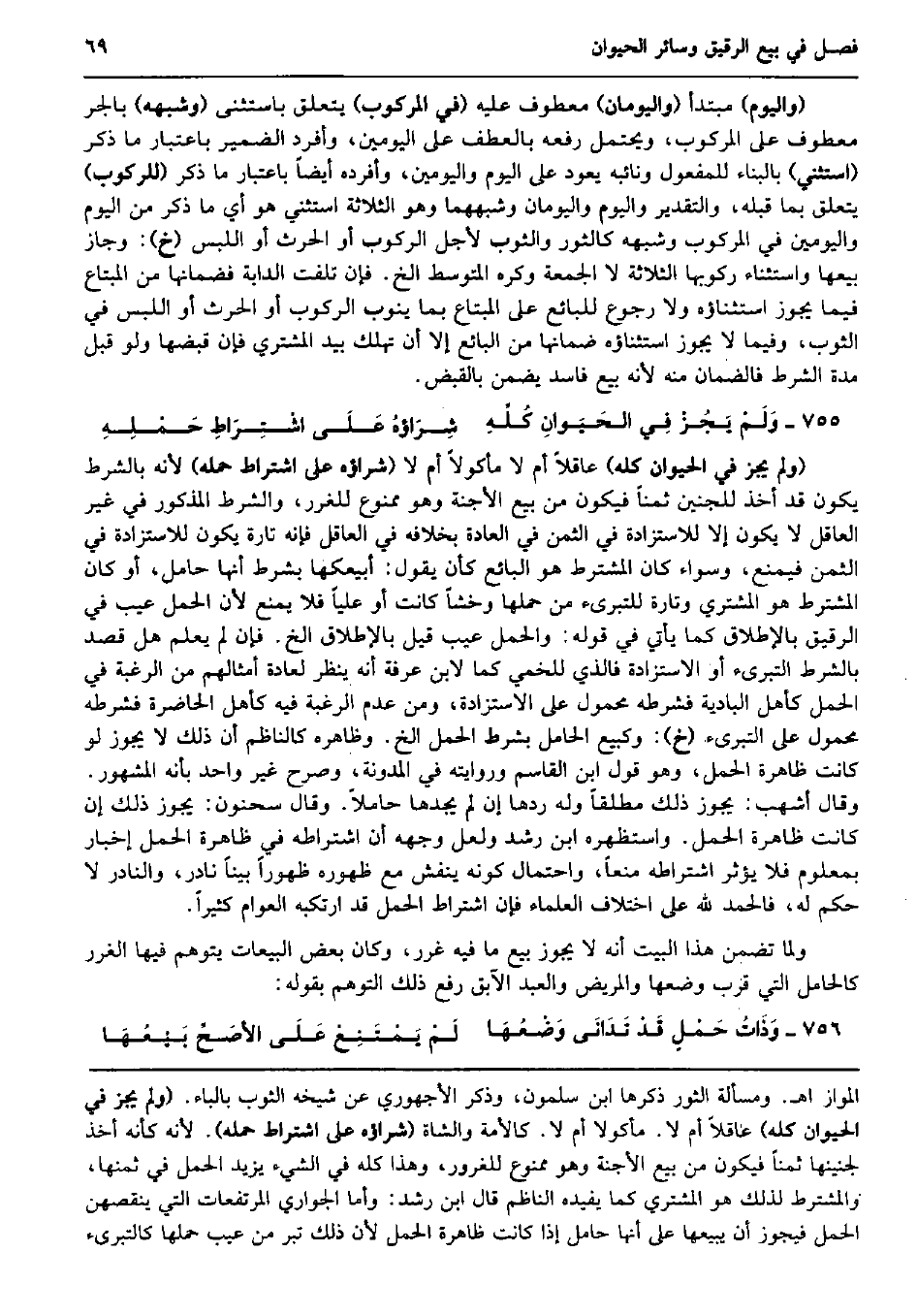 (وَالْيَوْم) مُبْتَدأ (واليومان) مَعْطُوف عَلَيْهِ (فِي المركوب) يتَعَلَّق باستثنى (وَشبهه) بِالْجَرِّ مَعْطُوف على المركوب، وَيحْتَمل رَفعه بالْعَطْف على الْيَوْمَيْنِ، وأفرد الضَّمِير بِاعْتِبَار مَا ذكر (اسْتثْنِي) بِالْبِنَاءِ للْمَفْعُول ونائبه يعود على الْيَوْم واليومين، وأفرده أَيْضا بِاعْتِبَار مَا ذكر (للرُّكُوب) يتَعَلَّق بِمَا قبله، وَالتَّقْدِير وَالْيَوْم واليومان وشبههما وَهُوَ الثَّلَاثَة اسْتثْنِي هُوَ أَي مَا ذكر من الْيَوْم واليومين فِي المركوب وَشبهه كالثور وَالثَّوْب لأجل الرّكُوب أَو الْحَرْث أَو اللّبْس (خَ) : وَجَاز بيعهَا واستثناء ركُوبهَا الثَّلَاثَة لَا الْجُمُعَة وَكره الْمُتَوَسّط الخ. فَإِن تلفت الدَّابَّة فضمانها من الْمُبْتَاع فِيمَا يجوز اسْتِثْنَاؤُهُ وَلَا رُجُوع للْبَائِع على الْمُبْتَاع بِمَا يَنُوب الرّكُوب أَو الْحَرْث أَو اللّبْس فِي الثَّوْب، وَفِيمَا لَا يجوز اسْتِثْنَاؤُهُ ضَمَانهَا من البَائِع إِلَّا أَن تهْلك بيد المُشْتَرِي فَإِن قبضهَا وَلَو قبل مُدَّة الشَّرْط فَالضَّمَان مِنْهُ لِأَنَّهُ بيع فَاسد يضمن بِالْقَبْضِ. وَلَمْ يَجُزْ فِي الحَيَوانِ كُلِّهِ شِرَاؤهُ عَلَى اشْتِرَاطِ حَمْلِهِ (وَلم يجز فِي الْحَيَوَان كُله) عَاقِلا أم لَا مَأْكُولا أم لَا (شِرَاؤُهُ على اشْتِرَاط حمله) لِأَنَّهُ بِالشّرطِ يكون قد أَخذ للجنين ثمنا فَيكون من بيع الأجنة وَهُوَ مَمْنُوع للغرر، وَالشّرط الْمَذْكُور فِي غير الْعَاقِل لَا يكون إِلَّا للاستزادة فِي الثّمن فِي الْعَادة بِخِلَافِهِ فِي الْعَاقِل فَإِنَّهُ تَارَة يكون للاستزادة فِي الثّمن فَيمْنَع، وَسَوَاء كَانَ الْمُشْتَرط هُوَ البَائِع كَأَن يَقُول: أبيعكها بِشَرْط أَنَّهَا حَامِل، أَو كَانَ الْمُشْتَرط هُوَ المُشْتَرِي وَتارَة للتبرىء من حملهَا وخشاً كَانَت أَو عليا فَلَا يمْنَع لِأَن الْحمل عيب فِي الرَّقِيق بِالْإِطْلَاقِ كَمَا يَأْتِي فِي قَوْله: وَالْحمل عيب قيل بِالْإِطْلَاقِ الخ. فَإِن لم يعلم هَل قصد بِالشّرطِ التبرىء أَو الاستزادة فَالَّذِي للخمي كَمَا لِابْنِ عَرَفَة أَنه ينظر لعادة أمثالهم من الرَّغْبَة فِي الْحمل كَأَهل الْبَادِيَة فشرطه مَحْمُول على الاستزادة، وَمن عدم الرَّغْبَة فِيهِ كَأَهل الْحَاضِرَة فشرطه مَحْمُول على التبرىء (خَ) : وكبيع الْحَامِل بِشَرْط الْحمل الخ. وَظَاهره كالناظم أَن ذَلِك لَا يجوز لَو كَانَت ظَاهِرَة الْحمل، وَهُوَ قَول ابْن الْقَاسِم وَرِوَايَته فِي الْمُدَوَّنَة، وَصرح غير وَاحِد بِأَنَّهُ الْمَشْهُور. وَقَالَ أَشهب: يجوز ذَلِك مُطلقًا وَله ردهَا إِن لم يجدهَا حَامِلا. وَقَالَ سَحْنُون: يجوز ذَلِك إِن كَانَت ظَاهِرَة الْحمل. واستظهره ابْن رشد وَلَعَلَّ وَجهه أَن اشْتِرَاطه فِي ظَاهِرَة الْحمل إِخْبَار بِمَعْلُوم فَلَا يُؤثر اشْتِرَاطه منعا، وَاحْتِمَال كَونه ينفش مَعَ ظُهُوره ظهوراً بَينا نَادِر، والنادر لَا حكم لَهُ، فَالْحَمْد لله على اخْتِلَاف الْعلمَاء فَإِن اشْتِرَاط الْحمل قد ارْتَكَبهُ الْعَوام كثيرا. وَلما تضمن هَذَا الْبَيْت أَنه لَا يجوز بيع مَا فِيهِ غرر، وَكَانَ بعض البيعات يتَوَهَّم فِيهَا الْغرَر كالحامل الَّتِي قرب وَضعهَا وَالْمَرِيض وَالْعَبْد الْآبِق رفع ذَلِك التَّوَهُّم بقوله: وَذَاتُ حَمْلٍ قَدْ تَدَانَى وَضْعُهَا لَمْ يَمْتَنِعْ عَلَى الأصَحِّ بَيْعُهَا