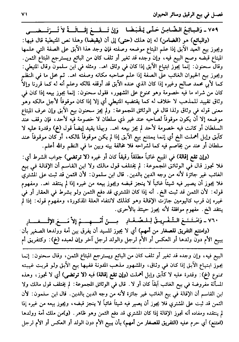 وَالبائِعُ الضَّامِنُ حَتَّى يُقْبَضَا وَإنْ تَقَعْ إقَالَةٌ لاَ تُرْتَضى (وَالْبَائِع) هُوَ (الضَّامِن) لَهُ إِن هلك (حَتَّى) إِلَى أَن (يقبضا) وَهَذَا نَص الْمُتَيْطِيَّة قَالَ فِيهَا: وَيجوز بيع العَبْد الْآبِق إِذا علم الْمُبْتَاع مَوْضِعه وَصفته فَإِن وجد هَذَا الْآبِق على الصّفة الَّتِي علمهَا الْمُبْتَاع قَبضه وَصَحَّ البيع فِيهِ، وَإِن وجده قد تغير أَو تلف كَانَ من البَائِع ويسترجع الْمُبْتَاع الثّمن. وَقَالَ سَحْنُون: إِنَّمَا يجوز ابتياع الْآبِق إِذا كَانَ فِي وثاق اه. وَمثله فِي ابْن سَلمُون وَقَالَ المتيطي: وَيجوز بيع الْحَيَوَان الْغَائِب على الصّفة إِذا علم صَاحبه مَكَانَهُ وَصفته اه. ثمَّ مَحل مَا فِي النّظم كَمَا لأبي مُحَمَّد صَالح وَغَيره إِذا كَانَ الَّذِي عِنْده الْآبِق قد أوقفهُ لمَالِكه وَعلم أَنه لَهُ كَمَا قَررنَا وإلاَّ كَانَ من شِرَاء مَا فِيهِ خُصُومَة وَهُوَ مَمْنُوع على الْمَشْهُور، فَقَوْل سَحْنُون: إِنَّمَا يجوز بَيْعه إِذا كَانَ فِي وثاق تَقْيِيد للْمَذْهَب لَا خلاف لَهُ كَمَا يَقْتَضِيهِ المتيطي أَي إِلَّا إِذا كَانَ مَوْقُوفا لأجل مَالِكه وَهُوَ معنى قَوْله فِي وثاق وَلذَا قَالَ فِي الوثائق الْمَجْمُوعَة: وَلم يجز سَحْنُون بيع الْآبِق وَإِن عرف الْمُبْتَاع مَوْضِعه إِلَّا أَن يكون مَوْقُوفا لصَاحبه عِنْد غير ذِي سُلْطَان لَا خُصُومَة فِيهِ لأحد، فَإِن وقف عِنْد السُّلْطَان أَو كَانَت فِيهِ خُصُومَة لأحد لم يجز بَيْعه اه. وَبِهَذَا يُقيد إيضاً قَول (خَ) وقدرة عَلَيْهِ لَا كآبق وإبل أهملت الخ أَي إِنَّمَا يمْتَنع بيع الْآبِق إِذا لم يكن مَوْقُوفا لمَالِكه، أَو كَانَ مَوْقُوفا عِنْد سُلْطَان أَو عِنْد من يُخَاصم فِيهِ كَمَا لشراحه فَلَا مُخَالفَة بَينه وَبَين مَا فِي النّظم وَالله أعلم. (وَإِن تقع إِقَالَة) فِي الْمَبِيع غَائِبا مُطلقًا رَقِيقا كَانَ أَو غَيره (لَا ترتضى) جَوَاب الشَّرْط أَي: فَلَا تجوز قَالَ فِي الوثائق الْمَجْمُوعَة: لم يخْتَلف قَول مَالك وَلَا ابْن الْقَاسِم أَن الْإِقَالَة فِي بيع الْغَائِب غير جَائِزَة لِأَنَّهُ من وَجه الدّين بِالدّينِ. قَالَ ابْن سَلمُون: لِأَن الثّمن قد ثَبت على المُشْتَرِي فَلَا يجوز أَن يصير فِيهِ شَيْئا غَائِبا لَا ينجز قَبضه وَيجوز بَيْعه من غَيره إِذا لم ينْتَقد اه. وَمَفْهُوم قَوْله: لِأَن الثّمن قد ثَبت الخ. أَنه إِذا كَانَ المُشْتَرِي قد دفع الثّمن وَلَو بِشَرْط فِي الْعقار أَو فِي غَيره إِن قرب كاليومين جَازَت الْإِقَالَة وَهُوَ كَذَلِك لانْتِفَاء الْعلَّة الْمَذْكُورَة، وَمَفْهُوم قَوْله: إِذا لم ينْتَقد الخ. مَفْهُوم مُوَافقَة لِأَنَّهُ يجوز حِينَئِذٍ بالأحرى. وَامْتَنَعَ التَّفْرِيقُ لِلصِّغَارِ مِنْ أُمِّهِمْ إلاَّ مَعَ الإثْغارِ (وَامْتنع التَّفْرِيق للصغار من أمّهم) أَي لَا يجوز للسَّيِّد أَن يفرق بَين أمة وَوَلدهَا الصَّغِير بِأَن يَبِيع الْأُم دون وَلَدهَا أَو الْعَكْس أَو الْأُم لرجل وَالْولد لرجل آخر وَإِن لعَبْدِهِ (خَ) : وكتفريق أم