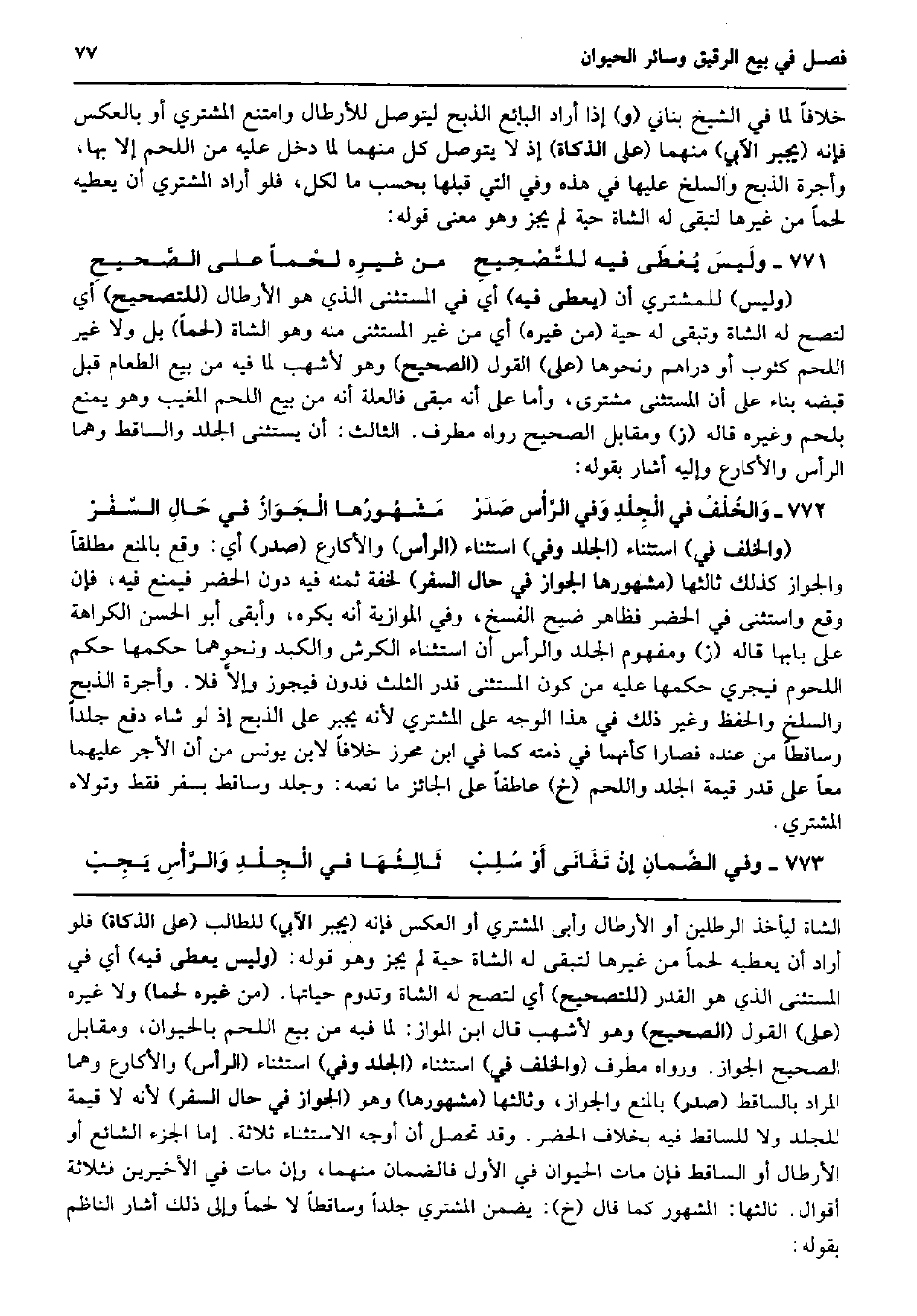 خلافًا لما فِي الشَّيْخ بناني (و) إِذا أَرَادَ البَائِع الذّبْح ليتوصل للأرطال وَامْتنع المُشْتَرِي أَو بِالْعَكْسِ فَإِنَّهُ (يجْبر الآبي) مِنْهُمَا (على الذَّكَاة) إِذْ لَا يتَوَصَّل كل مِنْهُمَا لما دخل عَلَيْهِ من اللَّحْم إِلَّا بهَا، وَأُجْرَة الذّبْح والسلخ عَلَيْهَا فِي هَذِه وَفِي الَّتِي قبلهَا بِحَسب مَا لكل، فَلَو أَرَادَ المُشْتَرِي أَن يُعْطِيهِ لَحْمًا من غَيرهَا لتبقى لَهُ الشَّاة حَيَّة لم يجز وَهُوَ معنى قَوْله: ولَيسَ يُعْطَى فِيهِ للتَّصْحِيحِ من غيرِه لحْماً على الصَّحيحِ (وَلَيْسَ) للْمُشْتَرِي أَن (يعْطى فِيهِ) أَي فِي الْمُسْتَثْنى الَّذِي هُوَ الأرطال (للتصحيح) أَي لتصح لَهُ الشَّاة وَتبقى لَهُ حَيَّة (من غَيره) أَي من غير الْمُسْتَثْنى مِنْهُ وَهُوَ الشَّاة (لَحْمًا) بل وَلَا غير اللَّحْم كَثوب أَو دَرَاهِم وَنَحْوهَا (على) القَوْل (الصَّحِيح) وَهُوَ لأَشْهَب لما فِيهِ من بيع الطَّعَام قبل قَبضه بِنَاء على أَن الْمُسْتَثْنى مشترى، وَأما على أَنه مبقى فالعلة أَنه من بيع اللَّحْم المغيب وَهُوَ يمْنَع بِلَحْم وَغَيره قَالَه (ز) وَمُقَابل الصَّحِيح رَوَاهُ مطرف. الثَّالِث: أَن يسْتَثْنى الْجلد والساقط وهما الرَّأْس والأكارع وَإِلَيْهِ أَشَارَ بقوله: وَالخُلْفُ فِي الْجِلْدِ وَفي الرَّأْس صَدَرْ مَشْهُورُها الْجَوَازُ فِي حَالِ السَّفْرْ (وَالْخلف فِي) اسْتثِْنَاء (الْجلد وَفِي) اسْتثِْنَاء (الرَّأْس) والأكارع (صدر) أَي: وَقع بِالْمَنْعِ مُطلقًا وَالْجَوَاز كَذَلِك ثَالِثهَا (مشهورها الْجَوَاز فِي حَال السّفر) لخفة ثمنه فِيهِ دون الْحَضَر فَيمْنَع فِيهِ، فَإِن وَقع وَاسْتثنى فِي الْحَضَر فَظَاهر ضيح الْفَسْخ، وَفِي الْمُوازِية أَنه يكره، وَأبقى أَبُو الْحسن الْكَرَاهَة على بَابهَا قَالَه (ز) وَمَفْهُوم الْجلد وَالرَّأْس أَن اسْتثِْنَاء الكرش والكبد وَنَحْوهمَا حكمهَا حكم اللحوم فَيجْرِي حكمهَا عَلَيْهِ من كَون الْمُسْتَثْنى قدر الثُّلُث فدون فَيجوز وإلاَّ فَلَا. وَأُجْرَة الذّبْح والسلخ وَالْحِفْظ وَغير ذَلِك فِي هَذَا الْوَجْه على المُشْتَرِي لِأَنَّهُ يجْبر على الذّبْح إِذْ لَو شَاءَ دفع جلدا وساقطاً من عِنْده فصارا كَأَنَّهُمَا فِي ذمَّته كَمَا فِي ابْن مُحرز خلافًا لِابْنِ يُونُس من أَن الْأجر عَلَيْهِمَا مَعًا على قدر قيمَة الْجلد وَاللَّحم (خَ) عاطفاً على الْجَائِز مَا نَصه: وَجلد وساقط بسفر فَقَط وتولاه المُشْتَرِي. وَفِي الضَّمانِ إنْ تَفَانَى أَوْ سُلِبْ ثَالِثُهَا فِي الْجِلْدِ وَالرَّأْسِ يَجِبْ