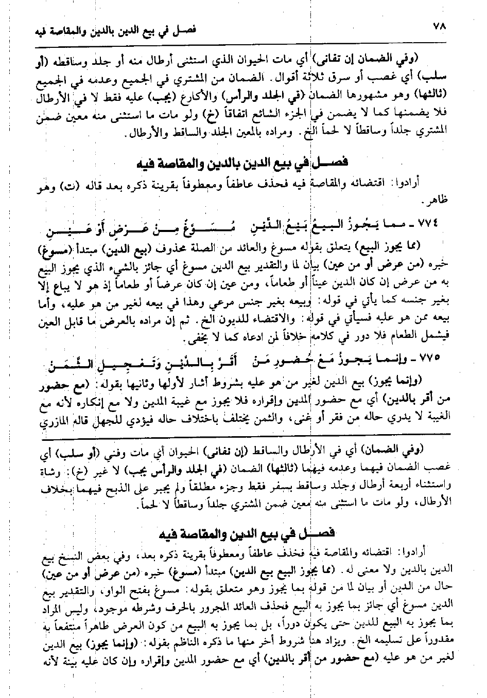 أَرَادوا: اقتضائه والمقاصة فِيهِ فَحذف عاطفاً ومعطوفاً بِقَرِينَة ذكره بعد قَالَه (ت) وَهُوَ ظَاهر. مِمَّا يَجُوزُ البيعُ بَيْعُ الدَّيْنِ مُسَوَّغٌ مِنْ عَرْضٍ أَوْ عَيْنِ (مِمَّا يجوز البيع) يتَعَلَّق بقوله مسوغ والعائد من الصِّلَة مَحْذُوف (بيع الدّين) مُبْتَدأ (مسوغ) خَبره (من عرض أَو من عين) بَيَان لما وَالتَّقْدِير بيع الدّين مسوغ أَي جَائِز بالشَّيْء الَّذِي يجوز البيع بِهِ من عرض إِن كَانَ الدّين عينا أَو طَعَاما، وَمن عين إِن كَانَ عرضا أَو طَعَاما إِذْ هُوَ لَا يُبَاع إِلَّا بِغَيْر جنسه كَمَا يَأْتِي فِي قَوْله: وَبيعه بِغَيْر جنس مرعي وَهَذَا فِي بَيْعه لغير من هُوَ عَلَيْهِ، وَأما بَيْعه مِمَّن هُوَ عَلَيْهِ فَسَيَأْتِي فِي قَوْله: والاقتضاء للديون الخ. ثمَّ إِن مُرَاده بِالْعرضِ مَا قَابل الْعين فَيشْمَل الطَّعَام فَلَا دور فِي كَلَامه خلافًا لمن ادَّعَاهُ كَمَا لَا يخفى. وَإِنَّمَا يَجوزُ مَعْ حُضورِ مَنْ أَقَرَّ بِالدَّيْنِ وَتَعْجِيلِ الثَّمَنْ (وَإِنَّمَا يجوز) بيع الدّين لغير من هُوَ عَلَيْهِ بِشُرُوط أَشَارَ لأولها وَثَانِيها بقوله: (مَعَ حُضُور من أقرّ بِالدّينِ) أَي مَعَ حُضُور الْمَدِين وَإِقْرَاره فَلَا يجوز مَعَ غيبَة الْمَدِين وَلَا مَعَ إِنْكَاره لِأَنَّهُ مَعَ الْغَيْبَة لَا يدْرِي حَاله من فقر أَو غنى، وَالثمن يخْتَلف باخْتلَاف حَاله فَيُؤَدِّي للْجَهْل قَالَه الْمَازرِيّ