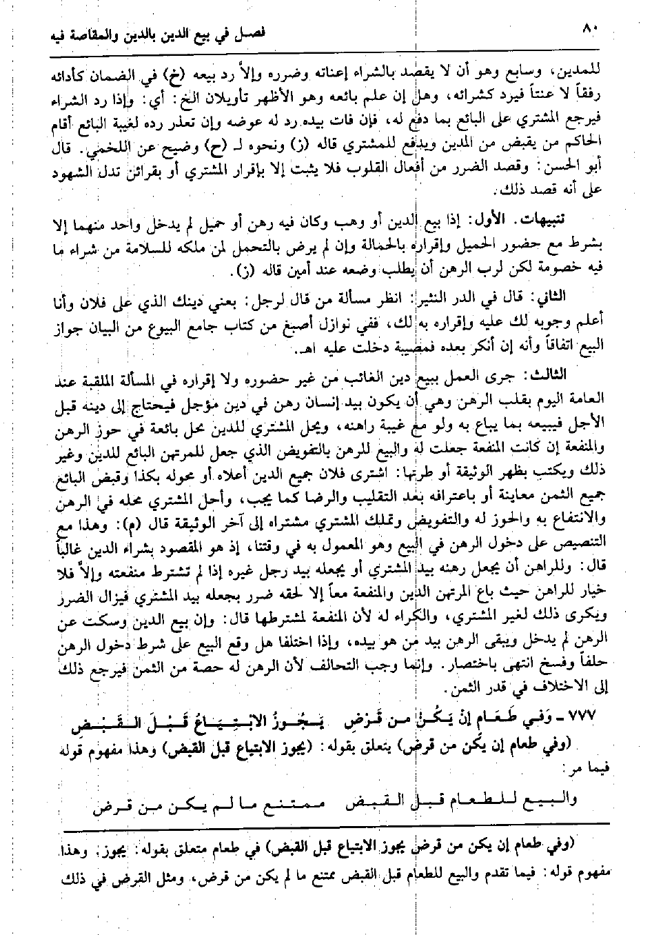 للْمَدِين، وسابع وَهُوَ أَن لَا يقْصد بِالشِّرَاءِ إعناته وضرره وإلاَّ رد بَيْعه (خَ) فِي الضَّمَان كأدائه رفقا لَا عنتاً فَيرد كشرائه، وَهل إِن علم بَائِعه وَهُوَ الْأَظْهر تَأْوِيلَانِ الخ: أَي: وَإِذا رد الشِّرَاء فَيرجع المُشْتَرِي على البَائِع بِمَا دفع لَهُ، فَإِن فَاتَ بِيَدِهِ رد لَهُ عوضه وَإِن تعذر رده لغيبة البَائِع أَقَامَ الْحَاكِم من يقبض من الْمَدِين وَيدْفَع للْمُشْتَرِي قَالَه (ز) وَنَحْوه ل (ح) وضيح عَن اللَّخْمِيّ. قَالَ أَبُو الْحسن: وَقصد الضَّرَر من أَفعَال الْقُلُوب فَلَا يثبت إِلَّا بِإِقْرَار المُشْتَرِي أَو بقرائن تدل الشُّهُود على أَنه قصد ذَلِك. تَنْبِيهَات. الأول: إِذا بيع الدّين أَو وهب وَكَانَ فِيهِ رهن أَو حميل لم يدْخل وَاحِد مِنْهُمَا إِلَّا بِشَرْط مَعَ حُضُور الْحميل وَإِقْرَاره بالحمالة وَإِن لم يرض بالتحمل لمن ملكه للسلامة من شِرَاء مَا فِيهِ خُصُومَة لَكِن لرب الرَّهْن أَن يطْلب وَضعه عِنْد أَمِين قَالَه (ز) . الثَّانِي: قَالَ فِي الدّرّ النثير: انْظُر مَسْأَلَة من قَالَ لرجل: بِعني دينك الَّذِي على فلَان وَأَنا أعلم وُجُوبه لَك عَلَيْهِ وَإِقْرَاره بِهِ لَك، فَفِي نَوَازِل أصبغ من كتاب جَامع الْبيُوع من الْبَيَان جَوَاز البيع اتِّفَاقًا وَأَنه إِن أنكر بعده فمصيبة دخلت عَلَيْهِ اه. الثَّالِث: جرى الْعَمَل بِبيع دين الْغَائِب من غير حُضُوره وَلَا إِقْرَاره فِي الْمَسْأَلَة الملقبة عِنْد الْعَامَّة الْيَوْم بقلب الرَّهْن وَهِي أَن يكون بيد إِنْسَان رهن فِي دين مُؤَجل فَيحْتَاج إِلَى دينه قبل الْأَجَل فيبيعه بِمَا يُبَاع بِهِ وَلَو مَعَ غيبَة راهنه، وَيحل المُشْتَرِي للدّين مَحل بائعة فِي حوز الرَّهْن وَالْمَنْفَعَة إِن كَانَت الْمَنْفَعَة جعلت لَهُ وَالْبيع للرَّهْن بالتفويض الَّذِي جعل للْمُرْتَهن البَائِع للدّين وَغير ذَلِك وَيكْتب بِظهْر الْوَثِيقَة أَو طرتها: اشْترى فلَان جَمِيع الدّين أَعْلَاهُ أَو محوله بِكَذَا وَقبض البَائِع جَمِيع الثّمن مُعَاينَة أَو باعترافه بعد التقليب وَالرِّضَا كَمَا يجب، وَأحل المُشْتَرِي مَحَله فِي الرَّهْن وَالِانْتِفَاع بِهِ والحوز لَهُ والتفويض وتملك المُشْتَرِي مشتراه إِلَى آخر الْوَثِيقَة قَالَ (م) : وَهَذَا مَعَ التَّنْصِيص على دُخُول الرَّهْن فِي البيع وَهُوَ الْمَعْمُول بِهِ فِي وقتنا، إِذْ هُوَ الْمَقْصُود بشرَاء الدّين غَالِبا قَالَ: وللراهن أَن يَجْعَل رَهنه بيد المُشْتَرِي أَو يَجعله بيد رجل غَيره إِذا لم تشْتَرط منفعَته وإلاَّ فَلَا خِيَار للرَّاهِن حَيْثُ بَاعَ الْمُرْتَهن الدّين وَالْمَنْفَعَة مَعًا إِلَّا لحقه ضَرَر بجعله بيد المُشْتَرِي فيزال الضَّرَر ويكرى ذَلِك لغير المُشْتَرِي، والكراء لَهُ لِأَن الْمَنْفَعَة لمشترطها قَالَ: وَإِن بيع الدّين وَسكت عَن الرَّهْن لم يدْخل وَيبقى الرَّهْن بيد من هُوَ بِيَدِهِ، وَإِذا اخْتلفَا هَل وَقع البيع على شَرط دُخُول الرَّهْن حلفا وَفسخ انْتهى بِاخْتِصَار. وَإِنَّمَا وَجب التَّحَالُف لِأَن الرَّهْن لَهُ حِصَّة من الثّمن فَيرجع ذَلِك إِلَى الِاخْتِلَاف فِي قدر الثّمن. وَفي طَعَامٍ إنْ يَكُنْ من قَرْضِ يَجُوزُ الابْتِيَاعُ قَبْلَ القَبْضِ (وَفِي طَعَام إِن يكن من قرض) يتَعَلَّق بقوله: (يجوز الابتياع قبل الْقَبْض) وَهَذَا مَفْهُوم قَوْله فِيمَا مر: وَالْبيع للطعام قبل الْقَبْض مُمْتَنع مَا لم يكن من قرض