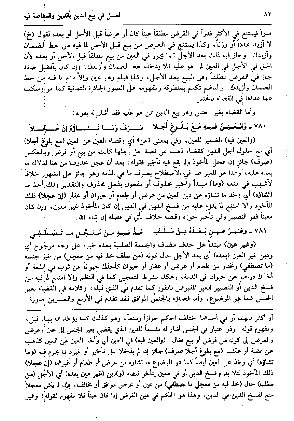 قدرا فَيمْتَنع فِي الْأَكْثَر قدرا فِي الْقَرْض مُطلقًا عينا كَانَ أَو عرضا قبل الْأَجَل أَو بعده لقَوْل (خَ) لَا أَزِيد عددا أَو وزنا، وَكَذَا يمْتَنع فِي الْعرض من بيع قبل الْأَجَل لما فِيهِ من حط الضَّمَان وَأَزِيدك: وَجَاز فِيهِ ذَلِك بعد الْأَجَل كَمَا يجوز فِي الْعين من بيع مُطلقًا قبل الْأَجَل أَو بعده لِأَن الْحق فِي الْأَجَل فِي الْعين لمن هُوَ عَلَيْهِ فَلَا يدْخلهُ حط الضَّمَان وَأَزِيدك: وَإِن كَانَ بِأَفْضَل صفة جَازَ فِي الْقَرْض مُطلقًا وَفِي البيع بعد الْأَجَل، وَكَذَا قبله وَهُوَ عين وإلاَّ منع لما فِيهِ من حط الضَّمَان وَأَزِيدك. والناظم تكلم بمنطوقه وَمَفْهُومه على الصُّور الْجَائِزَة الثَّمَانِية كَمَا مر وَسكت عَمَّا عَداهَا فِي الْقَضَاء بِالْجِنْسِ. وَأما الْقَضَاء بِغَيْر الْجِنْس وَهُوَ بيع الدّين مِمَّن هُوَ عَلَيْهِ فقد أَشَارَ لَهُ بقوله: وَالعَيْنُ فيهِ مَعْ بُلُوغٍ أَجَلا صَرْفٌ وَمَا تَشَاؤُهُ إنْ عُجِّلاَ (وَالْعين فِيهِ) الضَّمِير للعين، وَفِي بِمَعْنى (عَن) أَي وَقَضَاء الْعين عَن الْعين (مَعَ بُلُوغ أَََجَلًا) أَي مَعَ حُلُول أجل الدّين كقضاء ذهب عَن فضَّة حل أجلهَا كَانَت من بيع أَو قرض وَبِالْعَكْسِ (صرف) جَائِز إِن عجل الْمَأْخُوذ وَلم يَقع فِيهِ تَأْخِير فَقَوله: بعد أَن عجل مَحْذُوف من هُنَا لدلَالَة مَا بعده عَلَيْهِ، وَهَذَا هُوَ الْمعبر عَنهُ فِي الِاصْطِلَاح بِصَرْف مَا فِي الذِّمَّة وَهُوَ جَائِز على الْمَشْهُور خلافًا لأَشْهَب فِي مَنعه (وَمَا) مُبْتَدأ وَالْخَبَر مَحْذُوف أَو مفعول بِفعل مَحْذُوف وَالتَّقْدِير وَلَك أَخذ مَا (تشاؤه) أَي وَخذ مَا تشاؤه عَن دين الْعين من عرض أَو طَعَام أَو حَيَوَان أَو عقار (إِن عجلا) ذَلِك الْمَأْخُوذ والا امْتنع لما يلْزم عَلَيْهِ من فسخ الدّين فِي الدّين إِن كَانَ الْمَأْخُوذ غير معِين، وَإِن كَانَ معينا فَهُوَ التصيير وَفِي تَأْخِير حوزه وَقَبضه خلاف يَأْتِي فِي فَصله إِن شَاءَ الله. وغيرُ عينٍ بَعْدَهُ مِنْ سَلَفِ خُذْ فيهِ مِنْ مُعَجَّل مَا تَصْطَفِي (وَغير عين) مُبْتَدأ على حذف مُضَاف وَالْجُمْلَة الطلبية بعده خَبره على وَجه مَرْجُوح أَي وَدين غير الْعين (بعده) أَي بعد الْأَجَل حَال كَونه (من سلف خُذ فِيهِ من معجل) من غير جنسه (مَا تصطفي) وتختار من طَعَام أَو عرض أَو عقار أَو حَيَوَان كأخذك حَيَوَانا عَن ثوب فِي الذِّمَّة أَو أخذك دَرَاهِم عَن حَيَوَان فِي الذِّمَّة، وَهَكَذَا بِشَرْط التَّعْجِيل كَمَا فِي النّظم وَإِلَّا امْتنع لما فِيهِ من فسخ الدّين أَو التصيير الْغَيْر الْمَقْبُوض بالفور كَمَا تقدم فِي الَّذِي قبله، وَكَلَامه فِي الْقَضَاء بِغَيْر الْجِنْس كَمَا هُوَ الْمَوْضُوع، وَأما قَضَاؤُهُ بِالْجِنْسِ الْمُوَافق فقد تقدم فِي الْأَرْبَع وَالْعِشْرين صُورَة.