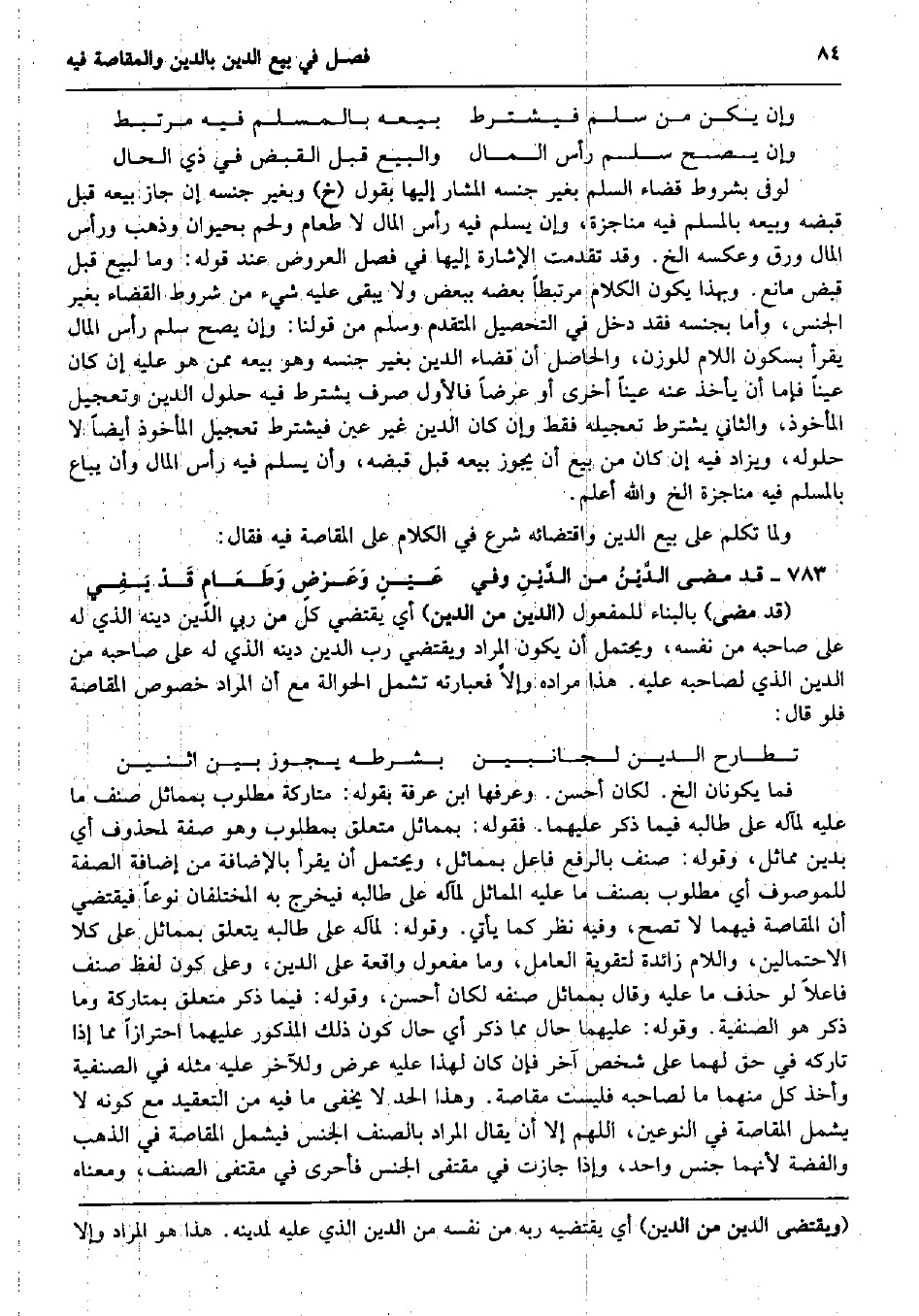 وَإِن يكن من سلم فَيشْتَرط بَيْعه بِالْمُسلمِ فِيهِ مُرْتَبِط وَإِن يَصح سلم رَأس المَال وَالْبيع قبل الْقَبْض فِي ذِي الْحَال لوفى بِشُرُوط قَضَاء السّلم بِغَيْر جنسه الْمشَار إِلَيْهَا بقول (خَ) وَبِغير جنسه إِن جَازَ بَيْعه قبل قَبضه وَبيعه بِالْمُسلمِ فِيهِ مناجزة، وَإِن يسلم فِيهِ رَأس المَال لَا طَعَام وَلحم بحيوان وَذهب وَرَأس المَال ورق وَعَكسه الخ. وَقد تقدّمت الْإِشَارَة إِلَيْهَا فِي فصل الْعرُوض عِنْد قَوْله: وَمَا لبيع قبل قبض مَانع. وَبِهَذَا يكون الْكَلَام مرتبطاً بعضه بِبَعْض وَلَا يبْقى عَلَيْهِ شَيْء من شُرُوط الْقَضَاء بِغَيْر الْجِنْس، وَأما بِجِنْسِهِ فقد دخل فِي التَّحْصِيل الْمُتَقَدّم وَسلم من قَوْلنَا: وَإِن يَصح سلم رَأس المَال يقْرَأ بِسُكُون اللَّام للوزن، وَالْحَاصِل أَن قَضَاء الدّين بِغَيْر جنسه وَهُوَ بَيْعه مِمَّن هُوَ عَلَيْهِ إِن كَانَ عينا فإمَّا أَن يَأْخُذ عَنهُ عينا أُخْرَى أَو عرضا فَالْأول صرف يشْتَرط فِيهِ حُلُول الدّين وتعجيل الْمَأْخُوذ، وَالثَّانِي يشْتَرط تَعْجِيله فَقَط وَإِن كَانَ الدّين غير عين فَيشْتَرط تَعْجِيل الْمَأْخُوذ أَيْضا لَا حُلُوله، وَيُزَاد فِيهِ إِن كَانَ من بيع أَن يجوز بَيْعه قبل قَبضه، وَأَن يسلم فِيهِ رَأس المَال وَأَن يُبَاع بِالْمُسلمِ فِيهِ مناجزة الخ وَالله أعلم. وَلما تكلم على بيع الدّين واقتضائه شرع فِي الْكَلَام على الْمُقَاصَّة فِيهِ فَقَالَ: قد مضى الدَّيْنُ من الدَّيْنِ وَفِي عَيْنٍ وَعَرْضٍ وَطَعَامٍ قَدْ يَفِي (قد مضى) بِالْبِنَاءِ للْمَفْعُول (الدّين من الدّين) أَي يَقْتَضِي كل من رَبِّي الدّين دينه الَّذِي لَهُ على صَاحبه من نَفسه، وَيحْتَمل أَن يكون المُرَاد وَيَقْتَضِي رب الدّين دينه الَّذِي لَهُ على صَاحبه من الدّين الَّذِي لصَاحبه عَلَيْهِ. هَذَا مُرَاده وإلاَّ فعبارته تَشْمَل الْحِوَالَة مَعَ أَن المُرَاد خُصُوص الْمُقَاصَّة فَلَو قَالَ: تطارح الدّين لجانبين بِشَرْطِهِ يجوز بَين اثْنَيْنِ فَمَا يكونَانِ الخ. لَكَانَ أحسن. وَعرفهَا ابْن عَرَفَة بقوله: متاركة مَطْلُوب بمماثل صنف مَا عَلَيْهِ لمآله على طَالبه فِيمَا ذكر عَلَيْهِمَا. فَقَوله: بمماثل مُتَعَلق بمطلوب وَهُوَ صفة لمَحْذُوف أَي بدين مماثل، وَقَوله: صنف بِالرَّفْع فَاعل بمماثل، وَيحْتَمل أَن يقْرَأ بِالْإِضَافَة من إِضَافَة الصّفة للموصوف أَي مَطْلُوب بصنف مَا عَلَيْهِ المماثل لمآله على طَالبه فَيخرج بِهِ المختلفان نوعا فَيَقْتَضِي أَن الْمُقَاصَّة فيهمَا لَا تصح، وَفِيه نظر كَمَا يَأْتِي. وَقَوله: لمآله على طَالبه يتَعَلَّق بمماثل على كلا الِاحْتِمَالَيْنِ، وَاللَّام زَائِدَة لتقوية الْعَامِل، وَمَا مفعول وَاقعَة على الدّين، وعَلى كَون لفظ صنف فَاعِلا لَو حذف مَا عَلَيْهِ وَقَالَ بمماثل صنفه لَكَانَ أحسن، وَقَوله: فِيمَا ذكر مُتَعَلق بمتاركة وَمَا ذكر هُوَ الصنفية. وَقَوله: عَلَيْهِمَا حَال مِمَّا ذكر أَي حَال كَون ذَلِك الْمَذْكُور عَلَيْهِمَا احْتِرَازًا مِمَّا إِذا تَاركه فِي حق لَهما على شخص آخر فَإِن كَانَ لهَذَا عَلَيْهِ عرض وَللْآخر عَلَيْهِ مثله فِي الصنفية وَأخذ كل مِنْهُمَا مَا لصَاحبه فَلَيْسَتْ مقاصة. وَهَذَا الْحَد لَا يخفى مَا فِيهِ من التعقيد مَعَ كَونه لَا يَشْمَل الْمُقَاصَّة فِي النَّوْعَيْنِ، اللَّهُمَّ إِلَّا أَن يُقَال المُرَاد بالصنف الْجِنْس فَيشْمَل الْمُقَاصَّة فِي الذَّهَب وَالْفِضَّة لِأَنَّهُمَا جنس وَاحِد، وَإِذا جَازَت فِي مقتفى الْجِنْس فأحرى فِي مقتفى الصِّنْف، وَمَعْنَاهُ