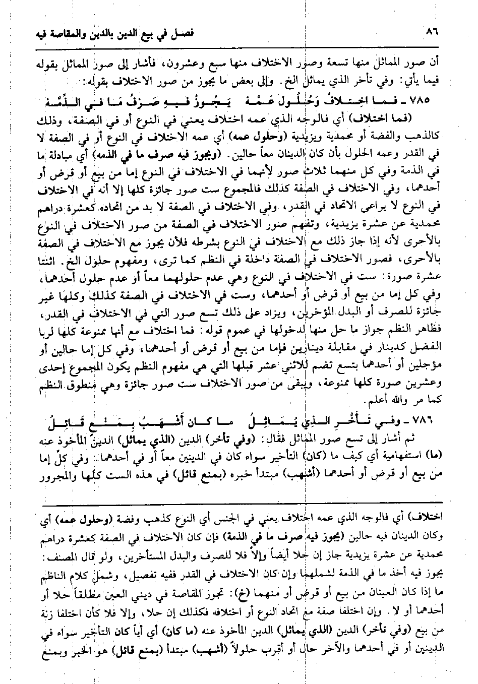 أَن صور المماثل مِنْهَا تِسْعَة وصور الِاخْتِلَاف مِنْهَا سبع وَعِشْرُونَ، فَأَشَارَ إِلَى صور المماثل بقوله فِيمَا يَأْتِي: وَفِي تَأَخّر الَّذِي يماثل الخ. وَإِلَى بعض مَا يجوز من صور الِاخْتِلَاف بقوله: فَمَا اخِتلافٌ وَحُلُول عَمَّهْ يَجُوزُ فيهِ صَرْفُ مَا فِي الذِّمَّهْ (فَمَا اخْتِلَاف) أَي فَالْوَجْه الَّذِي عَمه اخْتِلَاف يَعْنِي فِي النَّوْع أَو فِي الصّفة، وَذَلِكَ كالذهب وَالْفِضَّة أَو محمدية ويزيدية (وحلول عَمه) أَي عَمه الِاخْتِلَاف فِي النَّوْع أَو فِي الصّفة لَا فِي الْقدر وَعَمه الْحُلُول بِأَن كَانَ الدينان مَعًا حَالين. (وَيجوز فِيهِ صرف مَا فِي الذمه) أَي مُبَادلَة مَا فِي الذِّمَّة وَفِي كل مِنْهُمَا ثَلَاث صور لِأَنَّهُمَا فِي الِاخْتِلَاف فِي النَّوْع إِمَّا من بيع أَو قرض أَو أَحدهمَا، وَفِي الِاخْتِلَاف فِي الصّفة كَذَلِك فالمجموع سِتّ صور جَائِزَة كلهَا إِلَّا أَنه فِي الِاخْتِلَاف فِي النَّوْع لَا يُرَاعى الِاتِّحَاد فِي الْقدر، وَفِي الِاخْتِلَاف فِي الصّفة لَا بُد من اتحاده كعشرة دَرَاهِم محمدية عَن عشرَة يزيدية، وتفهم صور الِاخْتِلَاف فِي الصّفة من صور الِاخْتِلَاف فِي النَّوْع بالأحرى لِأَنَّهُ إِذا جَازَ ذَلِك مَعَ الِاخْتِلَاف فِي النَّوْع بِشَرْطِهِ فَلِأَن يجوز مَعَ الِاخْتِلَاف فِي الصّفة بالأحرى، فصور الِاخْتِلَاف فِي الصّفة دَاخِلَة فِي النّظم كَمَا ترى، وَمَفْهُوم حُلُول الخ. اثْنَتَا عشرَة صُورَة: سِتّ فِي الِاخْتِلَاف فِي النَّوْع وَهِي عدم حلولهما مَعًا أَو عدم حُلُول أَحدهمَا، وَفِي كل إِمَّا من بيع أَو قرض أَو أَحدهمَا، وست فِي الِاخْتِلَاف فِي الصّفة كَذَلِك وَكلهَا غير جَائِزَة للصرف أَو الْبَدَل المؤخرين وَيُزَاد على ذَلِك تسع صور الَّتِي فِي الِاخْتِلَاف فِي الْقدر، فَظَاهر النّظم جَوَاز مَا حل مِنْهَا لدخولها فِي عُمُوم قَوْله: فَمَا اخْتِلَاف مَعَ أَنَّهَا مَمْنُوعَة كلهَا لربا الْفضل كدينار فِي مُقَابلَة دينارين فإمَّا من بيع أَو قرض أَو أَحدهمَا، وَفِي كل إِمَّا حَالين أَو مؤجلين أَو أَحدهمَا بتسع تضم للاثني عشر قبلهَا الَّتِي هِيَ مَفْهُوم النّظم يكون الْمَجْمُوع إِحْدَى وَعشْرين صُورَة كلهَا مَمْنُوعَة، وَيبقى من صور الِاخْتِلَاف سِتّ صور جَائِزَة وَهِي مَنْطُوق النّظم كَمَا مر وَالله أعلم. وَفِي تَأَخُّرِ الذِي يُمَاثِلُ مَا كَانَ أَشْهَبُ بِمَنْعٍ قَائِلُ ثمَّ أَشَارَ إِلَى تسع صور المماثل فَقَالَ: (وَفِي تَأَخّر) الدّين (الَّذِي يماثل) الدّين الْمَأْخُوذ عَنهُ (مَا) استفهامية أَي كَيفَ مَا (كَانَ) التَّأْخِير سَوَاء كَانَ فِي الدينَيْنِ مَعًا أَو فِي أَحدهمَا. وَفِي كلِّ إِمَّا من بيع أَو قرض أَو أَحدهمَا (أَشهب) مُبْتَدأ خَبره (بِمَنْع قَائِل) فِي هَذِه السِّت كلهَا وَالْمَجْرُور