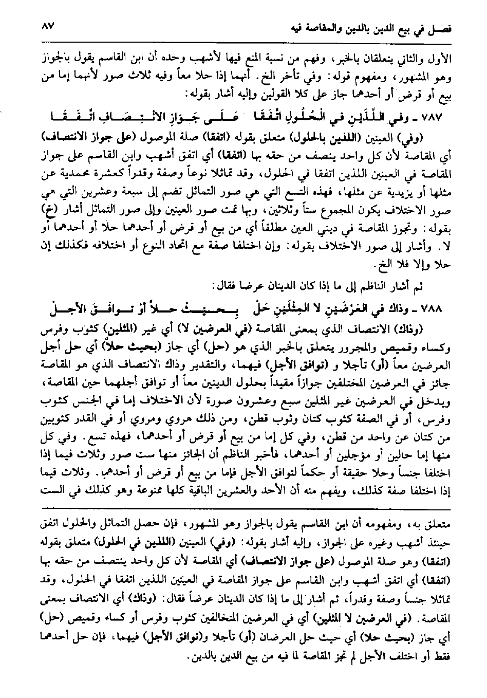 الأول وَالثَّانِي يتعلقان بالْخبر، وَفهم من نِسْبَة الْمَنْع فِيهَا لأَشْهَب وَحده أَن ابْن الْقَاسِم يَقُول بِالْجَوَازِ وَهُوَ الْمَشْهُور، وَمَفْهُوم قَوْله: وَفِي تَأَخّر الخ. أَنَّهُمَا إِذا حلا مَعًا وَفِيه ثَلَاث صور لِأَنَّهُمَا إِمَّا من بيع أَو قرض أَو أَحدهمَا جَازَ على كلا الْقَوْلَيْنِ وَإِلَيْهِ أَشَارَ بقوله: وَفِي اللَّذَيْنِ فِي الْحُلُولِ اتَّفَقَا عَلَى جَوَازِ الانْتِصَافِ اتَّفَقَا (وَفِي) الْعَينَيْنِ (اللَّذين بالحلول) مُتَعَلق بقوله (اتفقَا) صلَة الْمَوْصُول (على جَوَاز الانتصاف) أَي الْمُقَاصَّة لِأَن كل وَاحِد ينصف من حَقه بهَا (اتفقَا) أَي اتّفق أَشهب وَابْن الْقَاسِم على جَوَاز الْمُقَاصَّة فِي الْعَينَيْنِ اللَّذين اتفقَا فِي الْحُلُول، وَقد تماثلا نوعا وَصفَة وَقدرا كعشرة محمدية عَن مثلهَا أَو يزيدية عَن مثلهَا، فَهَذِهِ التسع الَّتِي هِيَ صور التَّمَاثُل تضم إِلَى سَبْعَة وَعشْرين الَّتِي هِيَ صور الِاخْتِلَاف يكون الْمَجْمُوع سِتا وَثَلَاثِينَ، وَبهَا تمت صور الْعَينَيْنِ وَإِلَى صور التَّمَاثُل أَشَارَ (خَ) بقوله: وَتجوز الْمُقَاصَّة فِي ديني الْعين مُطلقًا أَي من بيع أَو قرض أَو أَحدهمَا حلا أَو أَحدهمَا أَو لَا. وَأَشَارَ إِلَى صور الِاخْتِلَاف بقوله: وَإِن اخْتلفَا صفة مَعَ اتِّحَاد النَّوْع أَو اختلافه فَكَذَلِك إِن حلا وَإِلَّا فَلَا الخ. ثمَّ أَشَارَ النَّاظِم إِلَى مَا إِذا كَانَ الدينان عرضا فَقَالَ: وَذَاكَ فِي العَرْضَيْنِ لَا المِثْلَيْنِ حَلْ بِحيْثُ حلاَّ أوْ توافَقَ الأجلْ (وَذَاكَ) الانتصاف الَّذِي بِمَعْنى الْمُقَاصَّة (فِي العرضين لَا) أَي غير (المثلين) كَثوب وَفرس وَكسَاء وقميص وَالْمَجْرُور يتَعَلَّق بالْخبر الَّذِي هُوَ (حل) أَي جَازَ (بِحَيْثُ حلاَّ) أَي حل أجل العرضين مَعًا (أَو) تأجلا و (توَافق الْأَجَل) فيهمَا، وَالتَّقْدِير وَذَاكَ الانتصاف الَّذِي هُوَ الْمُقَاصَّة جَائِز فِي العرضين الْمُخْتَلِفين جَوَازًا مُقَيّدا بحلول الدينَيْنِ مَعًا أَو توَافق أجلهما حِين الْمُقَاصَّة، وَيدخل فِي العرضين غير المثلين سبع وَعِشْرُونَ صُورَة لِأَن الِاخْتِلَاف إِمَّا فِي الْجِنْس كَثوب وَفرس، أَو فِي الصّفة كَثوب كتَّان وثوب قطن، وَمن ذَلِك هروي ومروي أَو فِي الْقدر كثوبين من كتَّان عَن وَاحِد من قطن، وَفِي كل إِمَّا من بيع أَو قرض أَو أَحدهمَا، فَهَذِهِ تسع. وَفِي كل مِنْهَا إِمَّا حَالين أَو مؤجلين أَو أَحدهمَا، فَأخْبر النَّاظِم أَن الْجَائِز مِنْهَا سِتّ صور وَثَلَاث فِيمَا إِذا اخْتلفَا جِنْسا وحلا حَقِيقَة أَو حكما لتوافق الْأَجَل فإمَّا من بيع أَو قرض أَو أَحدهمَا. وَثَلَاث فِيمَا إِذا اخْتلفَا صفة كَذَلِك، وَيفهم مِنْهُ أَن الْأَحَد وَالْعِشْرين الْبَاقِيَة كلهَا مَمْنُوعَة وَهُوَ كَذَلِك فِي السِّت