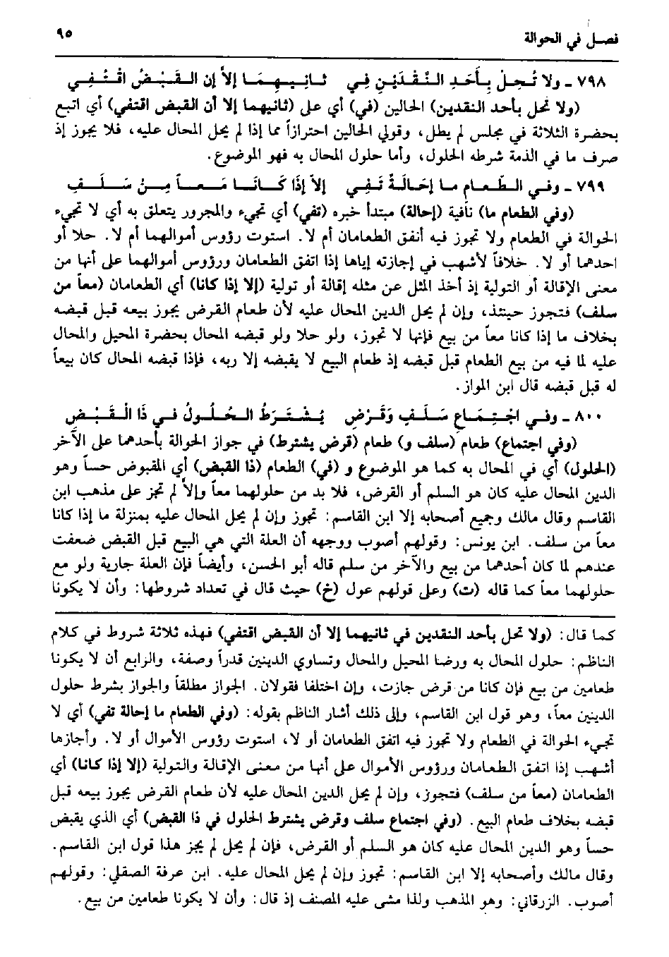 وَلَا تُحِلْ بِأَحَدِ النَّقْدَيْنِ فِي ثانِيهِمَا إلاَّ إِن القَبْضُ اقْتُفِي (وَلَا تحل بِأحد النَّقْدَيْنِ) الْحَالين (فِي) أَي على (ثَانِيهمَا إِلَّا أَن الْقَبْض اقتفي) أَي اتبع بِحَضْرَة الثَّلَاثَة فِي مجْلِس لم يطلّ، وَقَوْلِي الْحَالين احْتِرَازًا مِمَّا إِذا لم يحل الْمحَال عَلَيْهِ، فَلَا يجوز إِذْ صرف مَا فِي الذِّمَّة شَرطه الْحُلُول، وَأما حُلُول الْمحَال بِهِ فَهُوَ الْمَوْضُوع. وَفِي الطّعامِ مَا إحَالَةٌ تَفِي إلاّ إذَا كَانَا مَعاً مِنْ سَلَفِ (وَفِي الطَّعَام مَا) نَافِيَة (إِحَالَة) مُبْتَدأ خَبره (تفي) أَي تَجِيء وَالْمَجْرُور يتَعَلَّق بِهِ أَي لَا تَجِيء الْحِوَالَة فِي الطَّعَام وَلَا تجوز فِيهِ أنْفق الطعامان أم لَا. اسْتَوَت رُؤُوس أموالهما أم لَا. حلا أَو احدهما أَو لَا. خلافًا لأَشْهَب فِي إِجَازَته إِيَّاهَا إِذا اتّفق الطعامان ورؤوس أموالهما على أَنَّهَا من معنى الْإِقَالَة أَو التَّوْلِيَة إِذْ أَخذ الْمثل عَن مثله إِقَالَة أَو تَوْلِيَة (إِلَّا إِذا كَانَا) أَي الطعامان (مَعًا من سلف) فَتجوز حِينَئِذٍ، وَإِن لم يحل الدّين الْمحَال عَلَيْهِ لِأَن طَعَام الْقَرْض يجوز بَيْعه قبل قَبضه بِخِلَاف مَا إِذا كَانَا مَعًا من بيع فَإِنَّهَا لَا تجوز، وَلَو حلا وَلَو قَبضه الْمحَال بِحَضْرَة الْمُحِيل والمحال عَلَيْهِ لما فِيهِ من بيع الطَّعَام قبل قَبضه إِذْ طَعَام البيع لَا يقبضهُ إِلَّا ربه، فَإِذا قَبضه الْمحَال كَانَ بيعا لَهُ قبل قَبضه قَالَ ابْن الْمَوَّاز. وَفِي اجْتِمَاعِ سَلَفٍ وَقَرْضِ يُشْتَرَطُ الحُلُولُ فِي ذَا الْقَبْضِ (وَفِي اجْتِمَاع) طَعَام (سلف و) طَعَام (قرض يشْتَرط) فِي جَوَاز الْحِوَالَة بِأَحَدِهِمَا على الآخر (الْحُلُول) أَي فِي الْمحَال بِهِ كَمَا هُوَ الْمَوْضُوع و (فِي) الطَّعَام (ذَا الْقَبْض) أَي الْمَقْبُوض حسا وَهُوَ الدّين الْمحَال عَلَيْهِ كَانَ هُوَ السّلم أَو الْقَرْض، فَلَا بُد من حلولهما مَعًا وإلاَّ لم تجز على مَذْهَب ابْن الْقَاسِم وَقَالَ مَالك وَجَمِيع أَصْحَابه إِلَّا ابْن الْقَاسِم: تجوز وَإِن لم يحل الْمحَال عَلَيْهِ بِمَنْزِلَة مَا إِذا كَانَا مَعًا من سلف. ابْن يُونُس: وَقَوْلهمْ أصوب وَوَجهه أَن الْعلَّة الَّتِي هِيَ البيع قبل الْقَبْض ضعفت عِنْدهم لما كَانَ أَحدهمَا من بيع وَالْآخر من سلم قَالَه أَبُو الْحسن، وَأَيْضًا فَإِن الْعلَّة جَارِيَة وَلَو مَعَ حلولهما مَعًا كَمَا قَالَه (ت) وعَلى قَوْلهم عول (خَ) حَيْثُ قَالَ فِي تعداد شُرُوطهَا: وَأَن لَا يَكُونَا