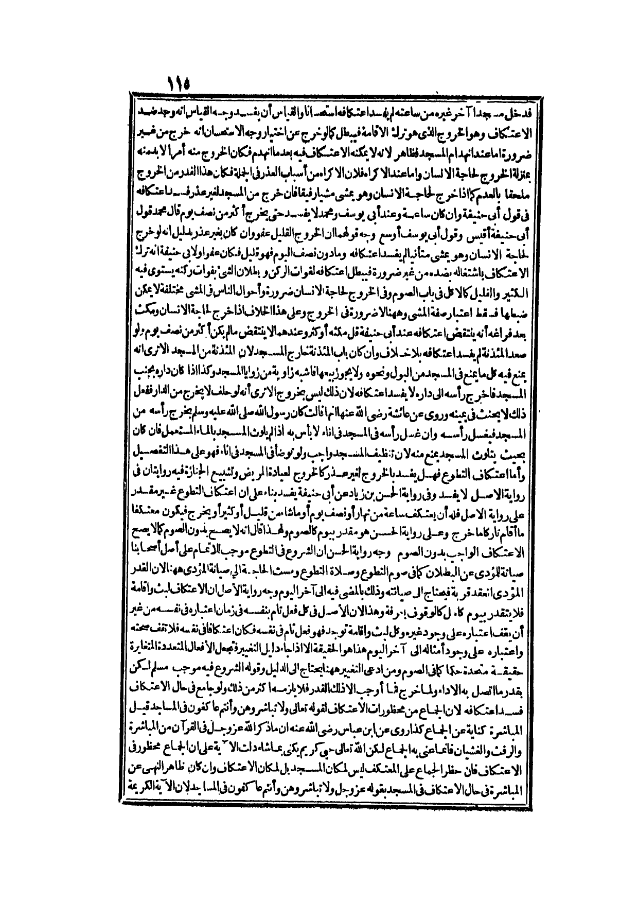 فَإِنْ خَرَجَ مِنْ الْمَسْجِدِ لِغَيْرِ عُذْرٍ؛ فَسَدَ اعْتِكَافُهُ فِي قَوْلِ أَبِي حَنِيفَةَ وَإِنْ كَانَ سَاعَةً، وَعِنْدَ أَبِي يُوسُفَ وَمُحَمَّدٍ لَا يَفْسُدُ حَتَّى يَخْرُجَ أَكْثَرَ مِنْ نِصْفِ يَوْمٍ قَالَ مُحَمَّدٌ: قَوْلُ أَبِي حَنِيفَةَ أَقْيَسُ وَقَوْلُ أَبِي يُوسُفَ أَوْسَعُ.