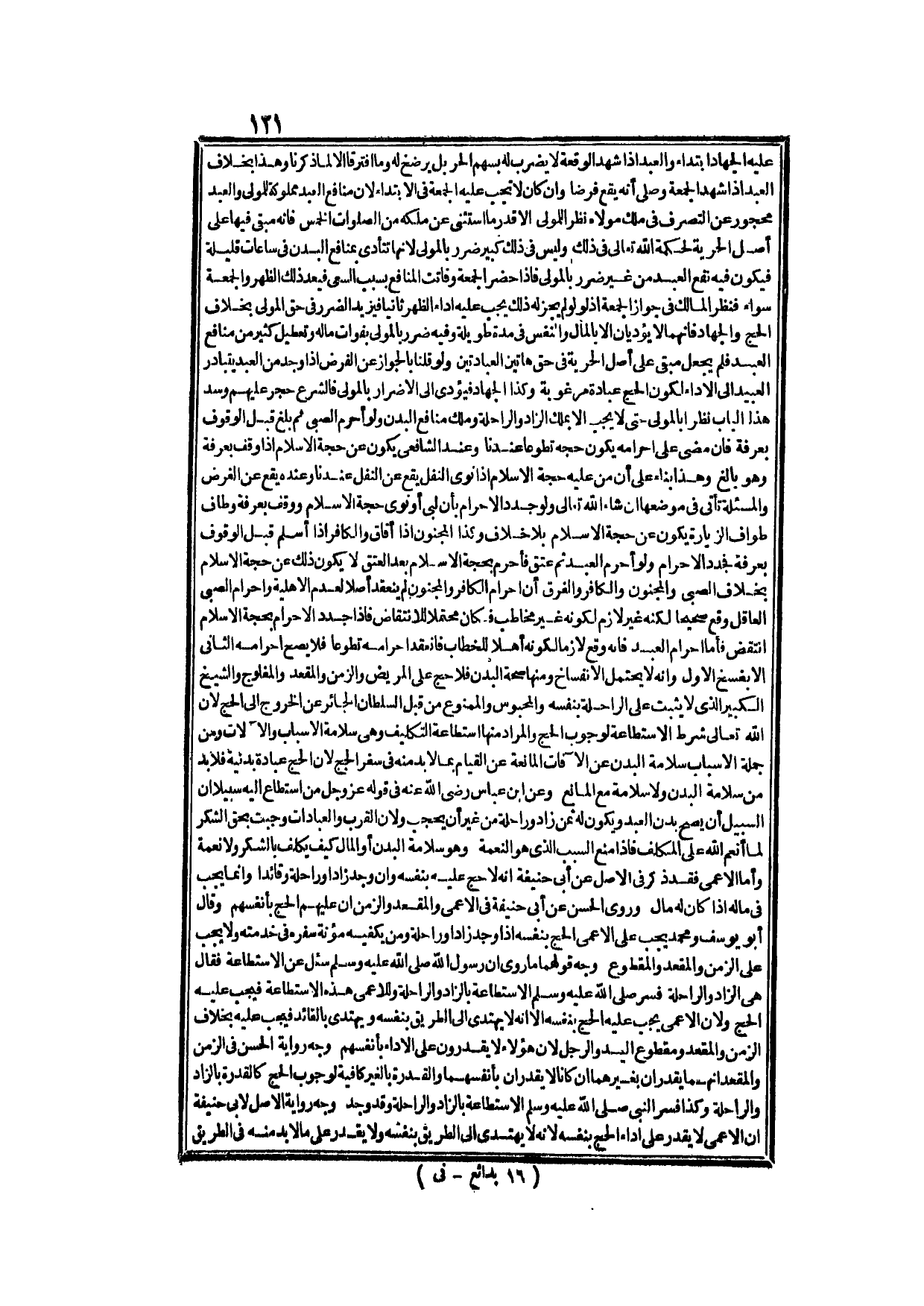 وَكَذَا الْجِهَادُ فَيُؤَدِّي إلَى الْإِضْرَارِ بِالْمَوْلَى، فَالشَّرْعُ حَجَرَ عَلَيْهِمْ، وَسَدَّ هَذَا الْبَابَ نَظَرًا بِالْمَوْلَى حَتَّى لَا يَجِبَ إلَّا بِمِلْكِ الزَّادِ، وَالرَّاحِلَةِ، وَمِلْكِ مَنَافِعِ الْبَدَنِ.