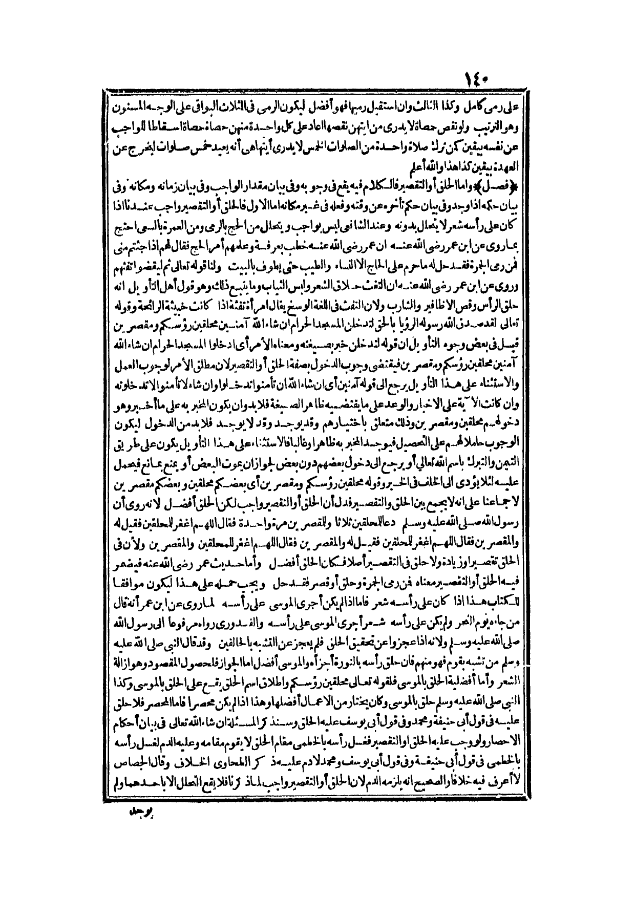 وَأَمَّا حَدِيثُ عُمَرَ - رَضِيَ اللَّهُ عَنْهُ - فَيُضْمَرُ فِيهِ الْحَلْقُ أَوْ التَّقْصِيرُ، مَعْنَاهُ فَمَنْ رَمَى الْجَمْرَةَ، وَحَلَقَ أَوْ قَصَّرَ فَقَدْ حَلَّ، وَيَجِبُ حَمْلُهُ عَلَى هَذَا لِيَكُونَ مُوَافِقًا لِلْكِتَابِ، هَذَا إذَا كَانَ عَلَى رَأْسِهِ شَعْرٌ، فَأَمَّا إذَا لَمْ يَكُنْ: أَجَرَى الْمُوسَى عَلَى رَأْسِهِ لِمَا رُوِيَ عَنْ ابْنِ عُمَرَ أَنَّهُ قَالَ: مَنْ جَاءَ يَوْمَ النَّحْرِ وَلَمْ يَكُنْ عَلَى رَأْسِهِ شَعْرٌ أَجْرَى الْمُوسَى عَلَى رَأْسِهِ، وَالْقُدُورِيُّ رَوَاهُ مَرْفُوعًا إلَى رَسُولِ اللَّهِ - صَلَّى اللَّهُ عَلَيْهِ وَسَلَّمَ - وَلِأَنَّهُ إذَا عَجَزَ عَنْ تَحْقِيقِ الْحَلْقِ فَلَمْ يَعْجِزْ عَنْ التَّشَبُّهِ بِالْحَالِقِينَ.