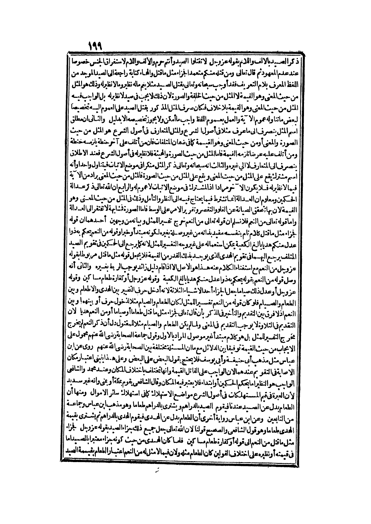 فَأَمَّا الْمِثْلُ مِنْ حَيْثُ الصُّورَةُ وَالْهَيْئَةُ فَلَا نَظِيرَ لَهُ فِي أُصُولِ الشَّرْعِ، فَعِنْدَ الْإِطْلَاقِ يَنْصَرِفُ إلَى الْمُتَعَارَفِ لَا إلَى غَيْرِهِ، وَالثَّالِثُ: أَنَّهُ سُبْحَانَهُ وَتَعَالَى ذَكَرَ الْمِثْلَ مُنَكَّرًا فِي مَوْضِعِ الْإِثْبَاتِ فَيَتَنَاوَلُ وَاحِدًا، وَأَنَّهُ اسْمٌ مُشْتَرَكٌ يَقَعُ عَلَى الْمِثْلِ مِنْ حَيْثُ الْمَعْنَى، وَيَقَعُ عَلَى الْمِثْلِ مِنْ حَيْثُ الصُّورَةُ، فَالْمِثْلُ مِنْ حَيْثُ الْمَعْنَى يُرَادُ مِنْ الْآيَةِ فِيمَا لَا نَظِيرَ لَهُ، فَلَا يَكُونُ الْآخَرُ مُرَادًا إذْ الْمُشْتَرَكُ فِي مَوْضِعِ الْإِثْبَاتِ لَا عُمُومَ لَهُ، وَالرَّابِعُ: أَنَّ اللَّهَ تَعَالَى ذَكَرَ عَدَالَةَ الْحَكَمَيْنِ، وَمَعْلُومٌ أَنَّ الْعَدَالَةَ إنَّمَا تُشْتَرَطُ فِيمَا يَحْتَاجُ فِيهِ إلَى النَّظَرِ وَالتَّأَمُّلِ، وَذَلِكَ فِي الْمِثْلِ مِنْ حَيْثُ الْمَعْنَى وَهُوَ الْقِيمَةُ؛ لِأَنَّ بِهَا تَتَحَقَّقُ الصِّيَانَةُ عَنْ الْغُلُوِّ وَالتَّقْصِيرِ، وَتَقْرِيرِ الْأَمْرِ عَلَى الْوَسَطِ.