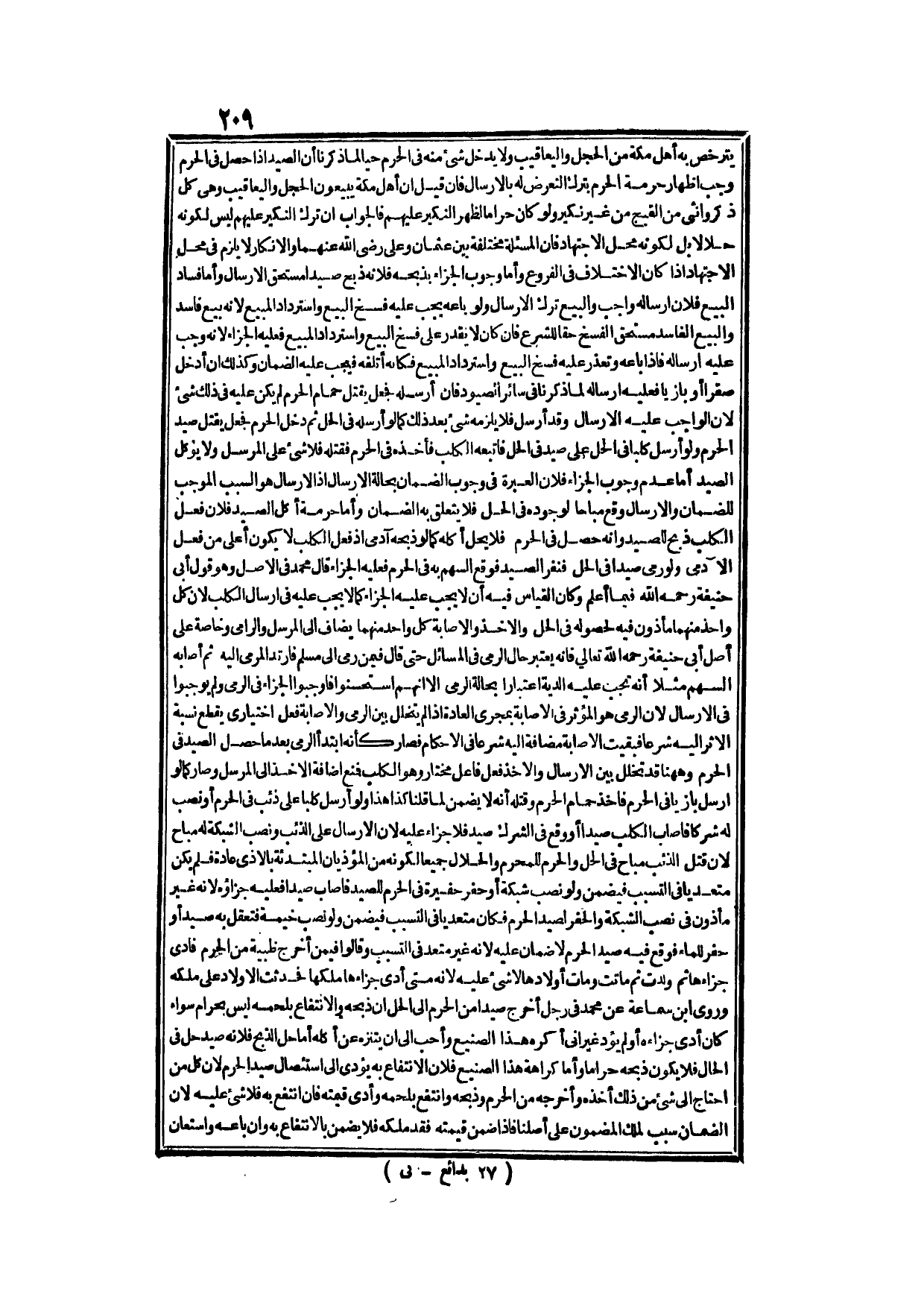 وَلَوْ أَرْسَلَ كَلْبًا فِي الْحِلِّ عَلَى صَيْدٍ فِي الْحِلِّ فَاتَّبَعَهُ الْكَلْبُ، فَأَخَذَهُ فِي الْحَرَمِ فَقَتَلَهُ فَلَا شَيْءَ عَلَى الْمُرْسِلِ، وَلَا يُؤْكَلُ الصَّيْدُ، أَمَّا عَدَمُ وُجُوبِ الْجَزَاءِ فَلِأَنَّ الْعِبْرَةَ فِي وُجُوبِ الضَّمَانِ بِحَالَةِ الْإِرْسَالِ، إذْ الْإِرْسَالُ هُوَ السَّبَبُ الْمُوجِبُ لِلضَّمَانِ وَالْإِرْسَالِ وَقَعَ مُبَاحًا لِوُجُودِهِ فِي الْحِلِّ فَلَا يَتَعَلَّقُ بِهِ الضَّمَانُ.