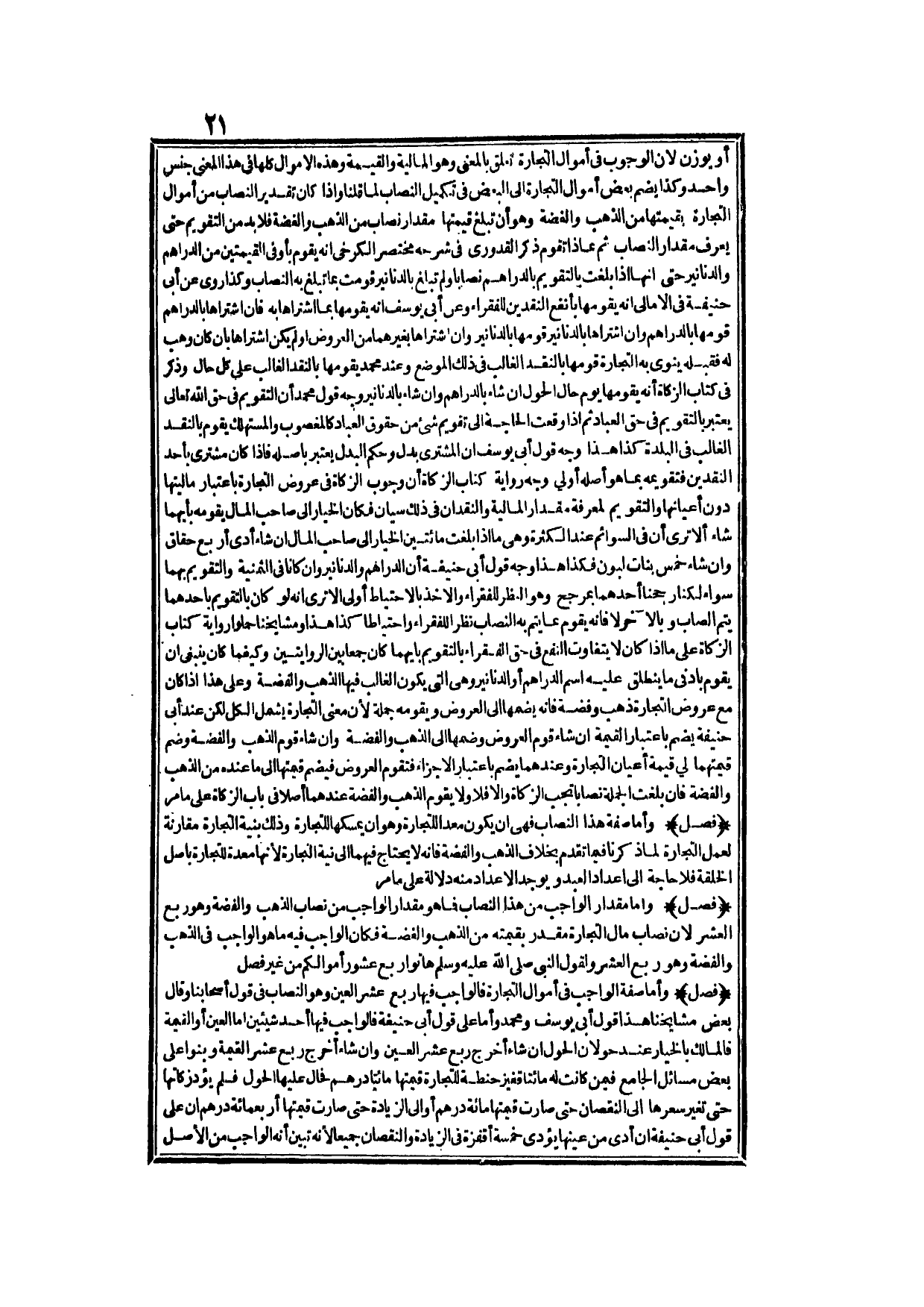 وَإِذَا كَانَ تَقْدِيرُ النِّصَابِ مِنْ أَمْوَالِ التِّجَارَةِ بِقِيمَتِهَا مِنْ الذَّهَبِ وَالْفِضَّةِ وَهُوَ أَنْ تَبْلُغَ قِيمَتُهَا مِقْدَارَ نِصَابٍ مِنْ الذَّهَبِ وَالْفِضَّةِ فَلَا بُدَّ مِنْ التَّقْوِيمِ حَتَّى يُعْرَفَ مِقْدَارُ النِّصَابِ ثُمَّ بِمَاذَا تُقَوَّمُ؟ ذَكَرَ الْقُدُورِيُّ فِي شَرْحِهِ مُخْتَصَرَ الْكَرْخِيِّ أَنَّهُ يُقَوَّمُ بِأَوْفَى الْقِيمَتَيْنِ مِنْ الدَّرَاهِمِ وَالدَّنَانِيرِ حَتَّى إنَّهَا إذَا بَلَغَتْ بِالتَّقْوِيمِ بِالدَّرَاهِمِ نِصَابًا وَلَمْ تَبْلُغْ بِالدَّنَانِيرِ قُوِّمَتْ بِمَا تَبْلُغُ بِهِ النِّصَابَ.