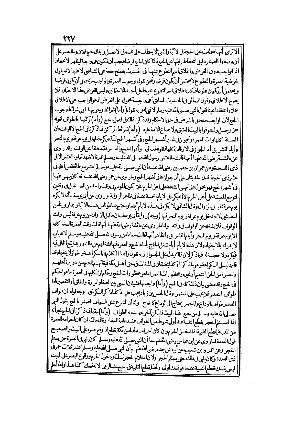 وَقَالَ الشَّافِعِيُّ: لَا يُكْرَهُ فِي هَذِهِ الْأَيَّامِ أَيْضًا، وَاحْتَجَّ بِمَا تَلَوْنَا مِنْ هَذِهِ الْآيَةِ وَبِمَا رَوَيْنَا مِنْ الْحَدِيثَيْنِ؛ لِأَنَّهُ دَخَلَ يَوْمُ عَرَفَةَ وَيَوْمُ النَّحْرِ فِيهَا (وَجْهُ) رِوَايَةِ أَبِي يُوسُفَ، أَنَّ مَا قَبْلَ الزَّوَالِ مِنْ يَوْمِ عَرَفَةَ لَيْسَ وَقْتَ الْوُقُوفِ، فَلَا يَشْغَلُهُ عَنْ الْوُقُوفِ فِي وَقْتِهِ، وَلَنَا مَا رُوِيَ عَنْ عَائِشَةَ - رَضِيَ اللَّهُ عَنْهَا - أَنَّهَا قَالَتْ: (وَقْتُ الْعُمْرَةِ السَّنَةُ كُلُّهَا إلَّا يَوْمَ عَرَفَةَ وَيَوْمَ النَّحْرِ وَأَيَّامَ التَّشْرِيقِ) وَالظَّاهِرُ أَنَّهَا قَالَتْ سَمَاعًا مِنْ رَسُولِ اللَّهِ - صَلَّى اللَّهُ عَلَيْهِ وَسَلَّمَ -؛ لِأَنَّهُ بَابٌ لَا يُدْرَكُ بِالِاجْتِهَادِ، وَلِأَنَّ هَذِهِ الْأَيَّامَ أَيَّامُ شُغْلِ الْحَاجِّ بِأَدَاءِ الْحَجِّ، وَالْعُمْرَةُ فِيهَا تَشْغَلُهُمْ عَنْ ذَلِكَ وَرُبَّمَا يَقَعُ الْخَلَلُ فِيهِ فَيُكْرَهُ، وَلَا حُجَّةَ لَهُ فِيمَا ذُكِرَ؛ لِأَنَّ ذَلِكَ يَدُلُّ عَلَى الْجَوَازِ وَبِهِ نَقُولُ، وَإِنَّمَا الْكَلَامُ فِي الْكَرَاهَةِ وَالْجَوَازِ لَا يَنْفِيهَا، وَقَدْ قَامَ دَلِيلُ الْكَرَاهَةِ وَهُوَ مَا ذَكَرْنَا.