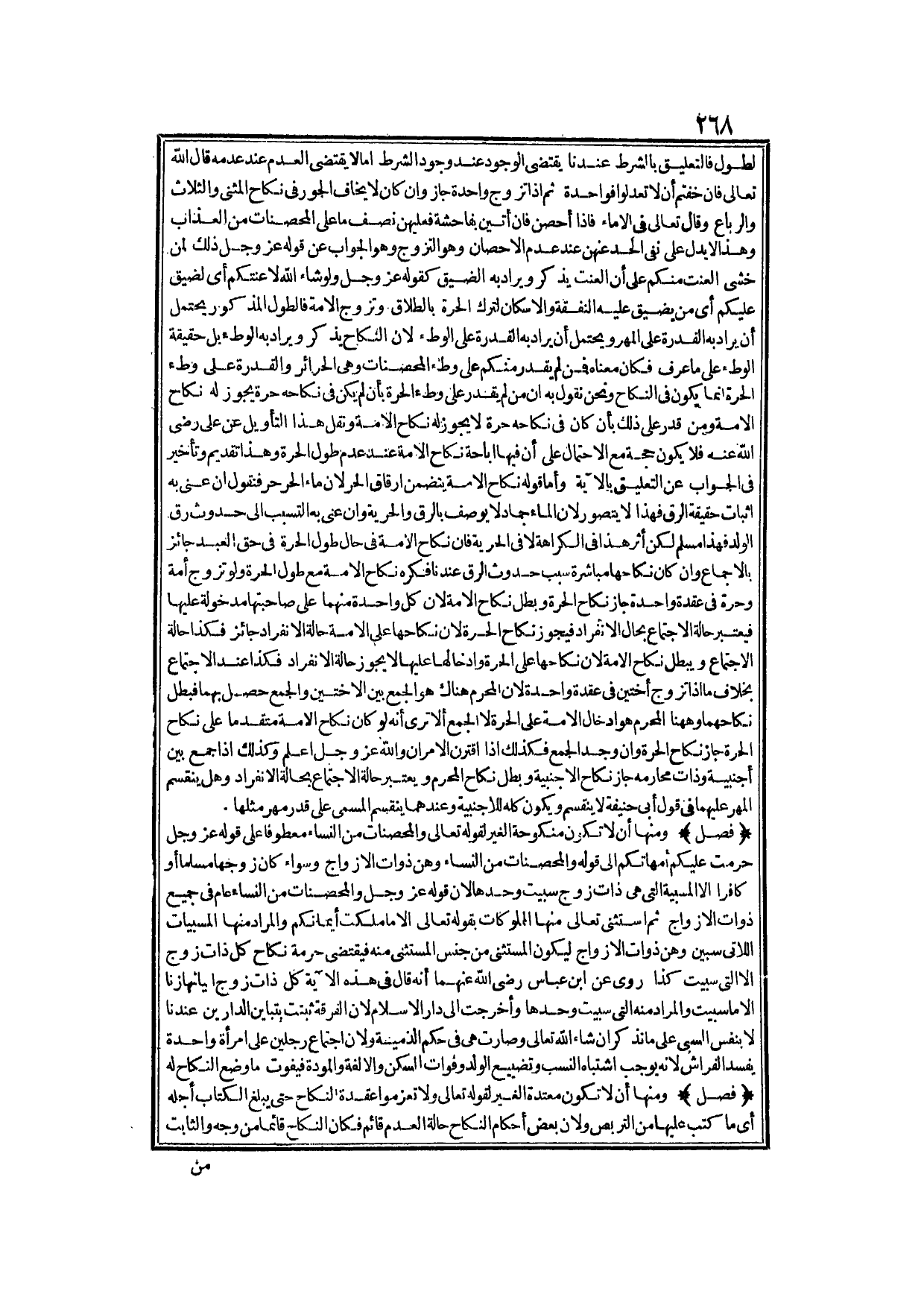 الطَّوْلِ، فَالتَّعْلِيقُ بِالشَّرْطِ عِنْدَنَا يَقْتَضِي الْوُجُودَ عِنْدَ وُجُودِ الشَّرْطِ إمَّا لَا يَقْتَضِي الْعَدَمَ عِنْدَ عَدَمِهِ قَالَ اللَّهُ تَعَالَى: {فَإِنْ خِفْتُمْ أَلا تَعْدِلُوا فَوَاحِدَةً} [النساء: 3] ثُمَّ إذَا تَزَوَّجَ وَاحِدَةً جَازَ، وَإِنْ كَانَ لَا يَخَافُ الْجَوْرِ فِي نِكَاحِ الْمَثْنَى وَالثُّلَاثِ وَالرُّبَاعِ.