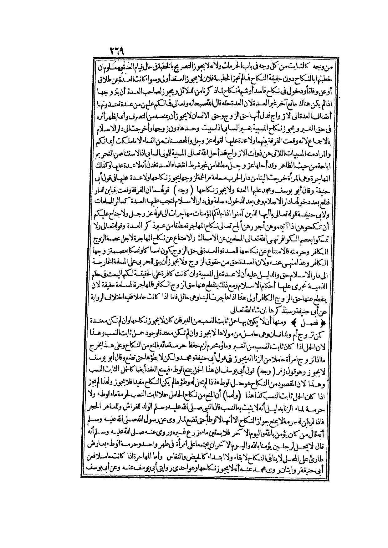 مِنْ وَجْهٍ كَالثَّابِتِ مِنْ كُلِّ وَجْهٍ فِي بَابِ الْحُرُمَاتِ؛ وَلِأَنَّهُ لَا يَجُوزُ التَّصْرِيحُ بِالْخِطْبَةِ فِي حَالِ قِيَامِ الْعِدَّةِ، وَمَعْلُومٌ أَنَّ خِطْبَتَهَا بِالنِّكَاحِ دُونَ حَقِيقَةِ النِّكَاحِ فَمَا لَمْ تَجُزْ الْخِطْبَةُ فَلَأَنْ لَا يَجُوزَ الْعَقْدُ أَوْلَى، وَسَوَاءٌ كَانَتْ الْعِدَّةُ عَنْ طَلَاقٍ أَوْ عَنْ وَفَاةٍ أَوْ دُخُولٍ فِي نِكَاحٍ فَاسِدٍ أَوْ شُبْهَةِ نِكَاحٍ لِمَا ذَكَرْنَا مِنْ الدَّلَائِلِ، وَيَجُوزُ لِصَاحِبِ الْعِدَّةِ أَنْ يَتَزَوَّجَهَا إذَا لَمْ يَكُنْ هُنَاكَ مَانِعٌ آخَرُ غَيْرُ الْعِدَّةِ؛ لِأَنَّ الْعِدَّةَ حَقُّهُ قَالَ اللَّهُ سُبْحَانَهُ وَتَعَالَى: {فَمَا لَكُمْ عَلَيْهِنَّ مِنْ عِدَّةٍ تَعْتَدُّونَهَا} [الأحزاب: 49] أَضَافَ الْعِدَّةَ إلَى الْأَزْوَاجِ فَدَلَّ أَنَّهَا حَقُّ الزَّوْجِ، وَحَقُّ الْإِنْسَانِ لَا يَجُوزُ أَنْ يَمْنَعَهُ مِنْ التَّصَرُّفِ، وَإِنَّمَا يَظْهَرُ أَثَرُهُ فِي حَقِّ الْغَيْرِ، وَيَجُوزُ نِكَاحُ الْمَسْبِيَّةِ بِغَيْرِ السَّابِي إذَا سُبِيَتْ وَحْدَهَا دُونَ زَوْجِهَا وَأُخْرِجَتْ إلَى دَارِ الْإِسْلَامِ بِالْإِجْمَاعِ؛ لِأَنَّهُ وَقَعَتْ الْفُرْقَةُ بَيْنَهُمَا وَلَا عِدَّةَ عَلَيْهَا لِقَوْلِهِ عَزَّ وَجَلَّ {وَالْمُحْصَنَاتُ مِنَ النِّسَاءِ إِلا مَا مَلَكَتْ أَيْمَانُكُمْ} [النساء: 24] وَالْمُرَادُ مِنْهُ الْمَسْبِيَّاتُ اللَّاتِي هُنَّ ذَوَاتُ الْأَزْوَاجِ فَقَدْ أَحَلَّ اللَّهُ تَعَالَى الْمَسْبِيَّةَ لِلْمَوْلَى السَّابِي إذْ الِاسْتِثْنَاءُ مِنْ التَّحْرِيمِ إبَاحَةٌ مِنْ حَيْثُ الظَّاهِرِ، وَقَدْ أَحَلَّهَا عَزَّ وَجَلَّ مُطْلَقًا مِنْ غَيْرِ شَرْطِ انْقِضَاءِ الْعِدَّةِ فَدَلَّ أَنَّهُ لَا عِدَّةَ عَلَيْهَا، وَكَذَلِكَ الْمُهَاجِرَةُ وَهِيَ الْمَرْأَةُ خَرَجَتْ إلَيْنَا مِنْ دَارِ الْحَرْبِ مُسْلِمَةً مُرَاغِمَةً لِزَوْجِهَا يَجُوزُ نِكَاحُهَا، وَلَا عِدَّةَ عَلَيْهَا فِي قَوْلِ أَبِي حَنِيفَةَ وَقَالَ أَبُو يُوسُفَ وَمُحَمَّدٌ: عَلَيْهَا الْعِدَّةُ وَلَا يَجُوزُ نِكَاحُهَا (وَجْهُ) قَوْلِهِمَا: إنَّ الْفُرْقَةَ وَقَعَتْ بِتَبَايُنِ الدَّارِ فَتَقَعُ بَعْدَ دُخُولِهَا دَارَ الْإِسْلَامِ وَهِيَ بَعْدَ الدُّخُولِ مُسْلِمَةٌ وَفِي دَارِ الْإِسْلَامِ، فَتَجِبُ عَلَيْهَا الْعِدَّةُ كَسَائِرِ الْمُسْلِمَاتِ، وَلِأَبِي حَنِيفَةَ قَوْله تَعَالَى: {يَا أَيُّهَا الَّذِينَ آمَنُوا إِذَا جَاءَكُمُ الْمُؤْمِنَاتُ مُهَاجِرَاتٍ} [الممتحنة: 10] إلَى قَوْلِهِ عَزَّ وَجَلَّ: {وَلا جُنَاحَ عَلَيْكُمْ أَنْ تَنْكِحُوهُنَّ إِذَا آتَيْتُمُوهُنَّ أُجُورَهُنَّ} [الممتحنة: 10] أَبَاحَ تَعَالَى نِكَاحَ الْمُهَاجِرَةِ مُطْلَقًا مِنْ غَيْرِ ذِكْرِ الْعِدَّةِ وقَوْله تَعَالَى: {وَلا تُمْسِكُوا بِعِصَمِ الْكَوَافِرِ} [الممتحنة: 10] نَهَى اللَّهُ تَعَالَى الْمُسْلِمِينَ عَنْ الْإِمْسَاكِ وَالِامْتِنَاعِ عَنْ نِكَاحِ الْمُهَاجِرَةِ لِأَجْلِ عِصْمَةِ الزَّوْجِ الْكَافِرِ وَحُرْمَتِهِ، فَالِامْتِنَاعُ عَنْ نِكَاحِهَا لِلْعِدَّةِ، وَالْعِدَّةُ فِي حَقِّ الزَّوْجِ يَكُونُ إمْسَاكًا وَتَمَسُّكًا بِعِصْمَةِ زَوْجِهَا الْكَافِرِ، وَهَذَا مَنْهِيٌّ عَنْهُ، وَلِأَنَّ الْعِدَّةَ حَقٌّ مِنْ حُقُوقِ الزَّوْجِ وَلَا يَجُوزُ أَنْ يَبْقَى لِلْحَرْبِيِّ عَلَى الْمُسْلِمَةِ الْخَارِجَةِ إلَى دَارِ الْإِسْلَامِ حَقٌّ، وَالدَّلِيلُ عَلَيْهِ أَنْ لَا عِدَّةَ عَلَى الْمَسْبِيَّةِ، وَإِنْ كَانَتْ كَافِرَةً عَلَى الْحَقِيقَةِ لَكِنَّهَا لَيْسَتْ فِي حُكْمِ الذِّمِّيَّةِ تَجْرِي عَلَيْهَا أَحْكَامُ الْإِسْلَامِ، وَمَعَ ذَلِكَ يَنْقَطِعُ عَنْهَا حَقُّ الزَّوْجِ الْكَافِرِ، فَالْمُهَاجِرَةُ الْمُسْلِمَةُ حَقِ