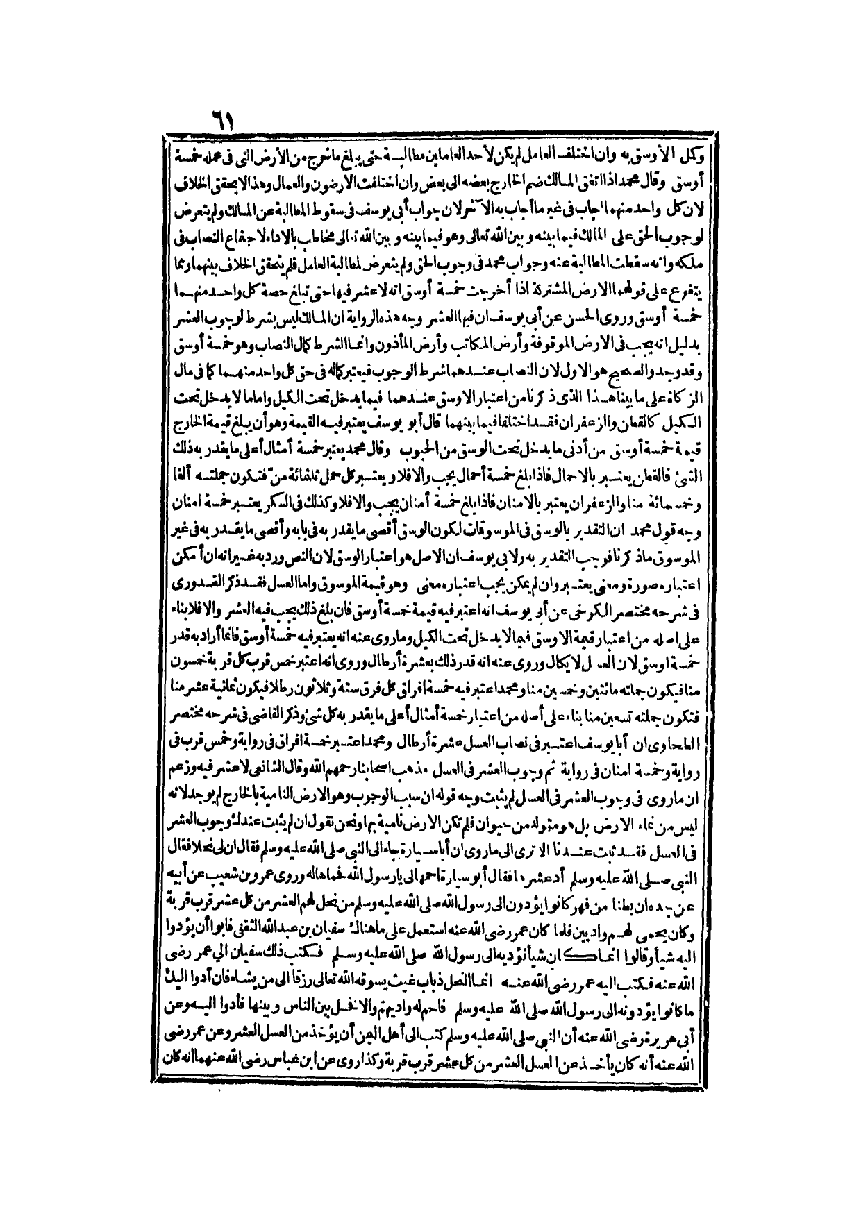 قَالَ أَبُو يُوسُفَ: يُعْتَبَرُ فِيهِ الْقِيمَةُ وَهُوَ أَنْ يَبْلُغَ قِيمَةُ الْخَارِجِ قِيمَةَ خَمْسَةِ أَوْسُقٍ مِنْ أَدْنَى مَا يَدْخُلُ تَحْتَ الْوَسْقِ مِنْ الْحُبُوبِ، وَقَالَ مُحَمَّدٌ: يُعْتَبَرُ خَمْسَةُ أَمْثَالٍ أَعْلَى مَا يُقَدَّرُ بِهِ ذَلِكَ الشَّيْءُ فَالْقُطْنُ يُعْتَبَرُ بِالْأَحْمَالِ فَإِذَا بَلَغَ خَمْسَةَ أَحْمَالٍ يَجِبُ وَإِلَّا فَلَا وَيُعْتَبَرُ كُلُّ حِمْلٍ ثَلَثَمِائَةِ مَنٍّ فَتَكُونُ جُمْلَتُهُ أَلْفًا وَخَمْسَمِائَةِ مَنٍّ، وَالزَّعْفَرَانُ يُعْتَبَرُ بِالْأَمْنَانِ فَإِذَا بَلَغَ خَمْسَةَ أَمْنَانٍ يَجِبُ وَإِلَّا فَلَا، وَكَذَلِكَ فِي السُّكَّرِ يُعْتَبَرُ خَمْسَةُ أَمْنَانٍ.