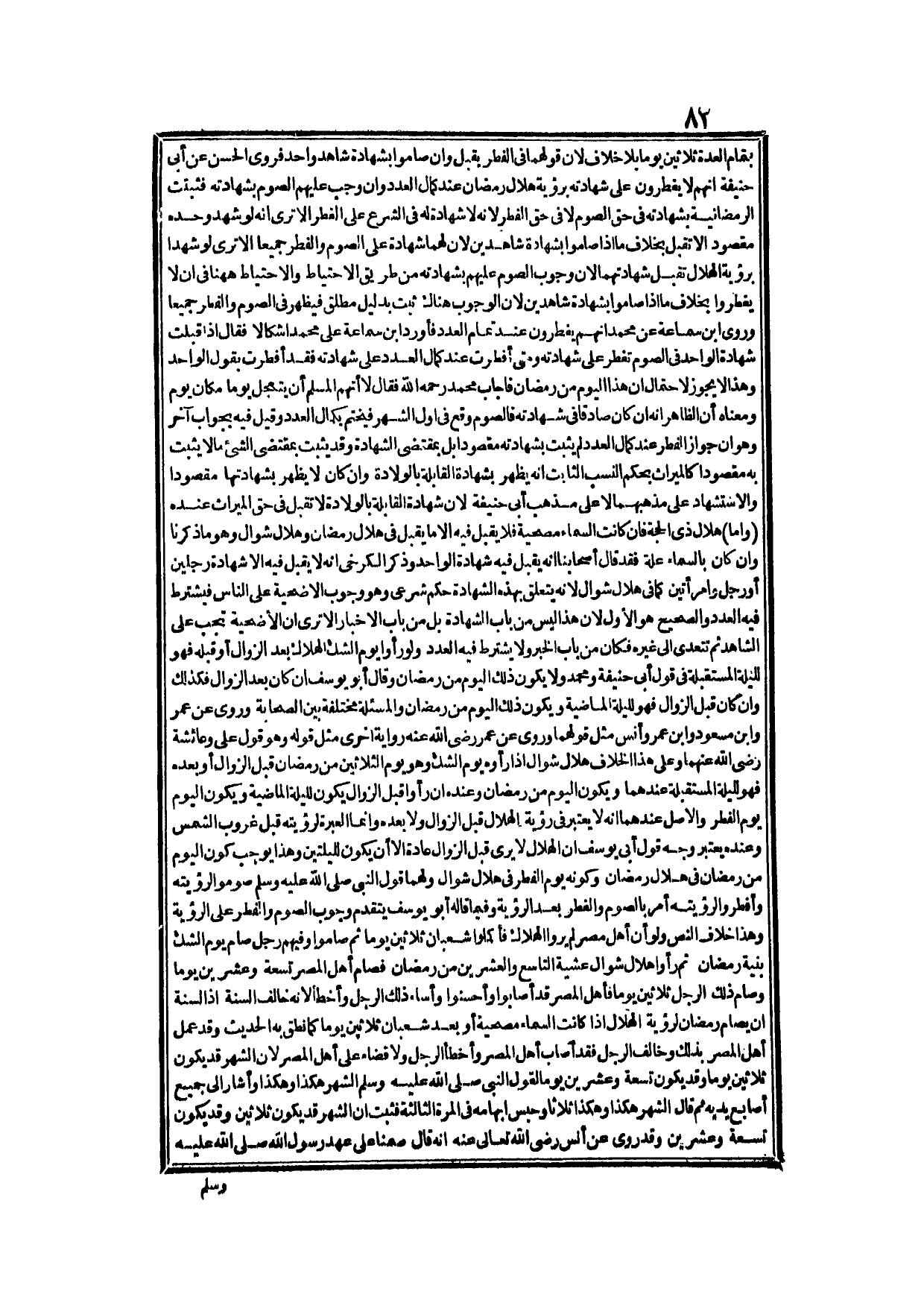 وَعَلَى هَذَا الْخِلَافِ هِلَالُ شَوَّالٍ إذَا رَأَوْهُ يَوْمَ الشَّكِّ وَهُوَ يَوْمُ الثَّلَاثِينَ مِنْ رَمَضَانَ قَبْلَ الزَّوَالِ أَوْ بَعْدَهُ فَهُوَ لِلَّيْلَةِ الْمُسْتَقْبَلَةِ عِنْدَهُمَا، وَيَكُونُ الْيَوْمُ مِنْ رَمَضَانَ، وَعِنْدَهُ إنْ رَأَوْهُ قَبْلَ الزَّوَالِ يَكُونُ لِلَّيْلَةِ الْمَاضِيَةِ وَيَكُونُ الْيَوْمُ يَوْمَ الْفِطْرِ، وَالْأَصْلُ عِنْدَهُمَا أَنَّهُ لَا يُعْتَبَرُ فِي رُؤْيَةِ الْهِلَالِ قَبْلَ الزَّوَالِ وَلَا بَعْدَهُ وَإِنَّمَا الْعِبْرَةُ لِرُؤْيَتِهِ قَبْلَ غُرُوبِ الشَّمْسِ، وَعِنْدَهُ يُعْتَبَرُ وَجْهُ قَوْلِ أَبِي يُوسُفَ إنَّ الْهِلَالَ لَا يُرَى قَبْلَ الزَّوَالِ عَادَةً، إلَّا أَنْ يَكُونَ لِلَيْلَتَيْنِ، وَهَذَا يُوجِبُ كَوْنَ الْيَوْمِ مِنْ رَمَضَانَ فِي هِلَالِ رَمَضَانَ، وَكَوْنَهُ يَوْمَ الْفِطْرِ فِي هِلَالِ شَوَّالٍ، وَلَهُمَا قَوْلُ النَّبِيِّ - صَلَّى اللَّهُ عَلَيْهِ وَسَلَّمَ - «صُومُوا لِرُؤْيَتِهِ وَأَفْطِرُوا لِرُؤْيَتِهِ» أَمَرَ بِالصَّوْمِ، وَالْفِطْرِ بَعْدَ الرُّؤْيَةِ، وَفِيمَا قَالَهُ أَبُو يُوسُفَ يَتَقَدَّمُ وُجُوبُ الصَّوْمِ، وَالْفِطْرِ عَلَى الرُّؤْيَةِ وَهَذَا خِلَافُ النَّصِّ، وَلَوْ أَنَّ أَهْلَ مِصْرٍ لَمْ يَرَوْا الْهِلَالَ فَأَكْمَلُوا شَعْبَانَ ثَلَاثِينَ يَوْمًا ثُمَّ صَامُوا وَفِيهِمْ رَجُلٌ صَامَ يَوْمَ الشَّكِّ بِنِيَّةِ رَمَضَانَ ثُمَّ رَأَوْا هِلَالَ شَوَّالٍ عَشِيَّةَ التَّاسِعِ، وَالْعِشْرِينَ مِنْ رَمَضَانَ فَصَامَ أَهْلُ الْمِصْرِ تِسْعَةً وَعِشْرِينَ يَوْمًا وَصَامَ ذَلِكَ الرَّجُلُ ثَلَاثِينَ يَوْمًا فَأَهْلُ الْمِصْرِ قَدْ أَصَابُوا وَأَحْسَنُوا وَأَسَاءَ ذَلِكَ الرَّجُلُ وَأَخْطَأَ لِأَنَّهُ خَالَفَ السُّنَّةَ إذْ السُّنَّةُ أَنْ يُصَامَ رَمَضَانُ لِرُؤْيَةِ الْهِلَالِ إذَا كَانَتْ السَّمَاءُ مُصْحِيَةً، أَوْ بَعْدَ شَعْبَانَ ثَلَاثِينَ يَوْمًا كَمَا نَطَقَ بِهِ الْحَدِيثُ.